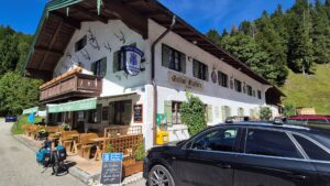 Nagle szlak się urywa, więc muszę pojechać dalej drogą z całkiem niemałym ruchem samochodowym. Gdy więc widzę przy drodze „Gasthof Glasshute”, zjeżdżam do niego licząc na kawę i może jakieś śniadanie. Na budynku widzę napis, który głosi, że ten gościniec istnieje od 1698 roku! Niesamowite! Niestety kuchnia jeszcze nie działa, ale kawę i colę zero udało mi się dostać i nawet zapłacić kartą.