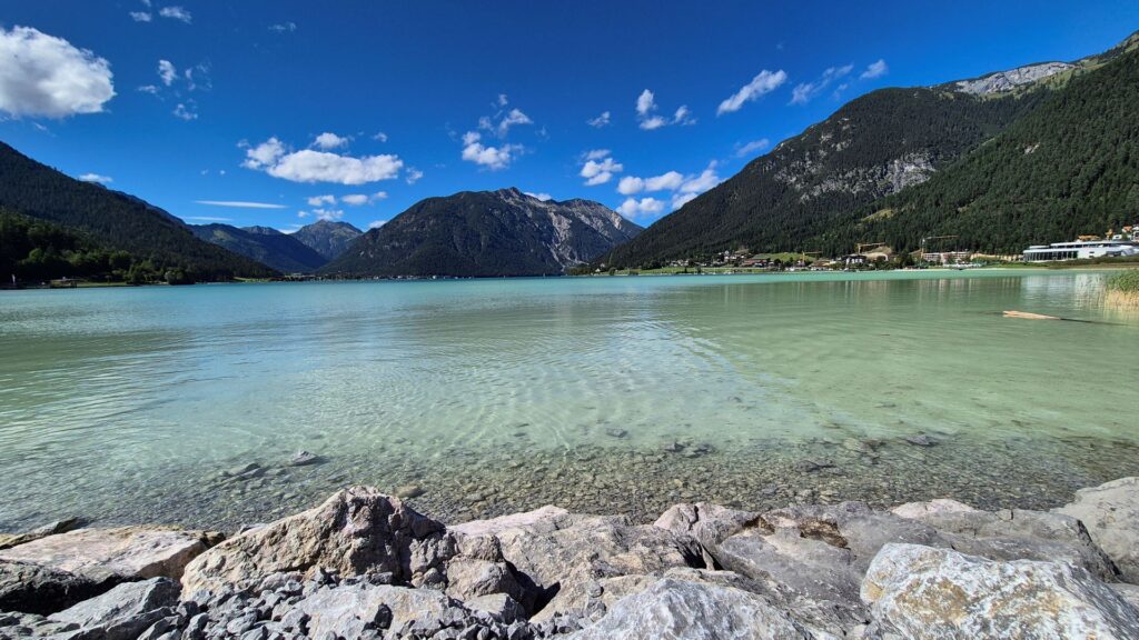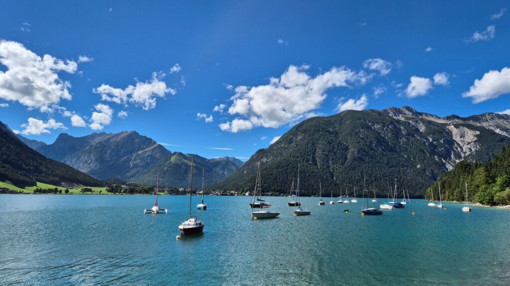 Dojechałem do jeziora Achensee. Pięknie to wyglądało! Strome zbocza gór wchodziły wprost do wąskiego ale długiego jeziora. A ja jechałem jego wschodnim brzegiem. Pojawili się turyści. Miejscami całkiem sporo. No i jak to turyści – sądzili, że są jedyni na wąskim szlaku pieszo – rowerowym. Więc szli szpalerami kompletnie blokując mi możliwość przejazdu. Trudno. Trzeba dzwonić dzwonkiem. Najpierw na twarzach odmalowywało się zdziwienie – co to za dźwięk. Jakieś 20-30 sekund później nieśpiesznie ustępowali drogi. I tak co chwilę. Jazda jest więc nierówna. Przyśpieszam, hamuję, dzwonię, przyśpieszam, hamuję, dzwonię… Nie lubię tego, no ale co zrobić. Jak widać, nawet w Austrii pieszy nie myśli o innych. Ale jadę. Po drodze minąłem port z którego właśnie odpływał statek wycieczkowy. Wtedy też zrozumiałem, skąd tych pieszych tyle się pojawiło na mojej drodze. Piękny statek wygląda na całkiem nowy. O wiele nowszy od podobnych jednostek wycieczkowych jakie mamy w Polsce w podobnych miejscach turystycznych.