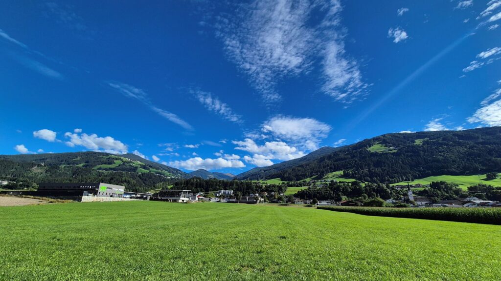 Gdybym jechał po prostu na przełęcz Brennera, pojechałbym o wiele niżej, tak jak normalnie jest puszczony ruch samochodowy. Ja tymczasem musiałem się wspinać na zbocze gór coraz wyżej i wyżej, bo właśnie tam położona jest miejscowość w której miałem zakończyć dzisiaj swoją jazdę. Miałem mały problem logiczny u podnóża, bo ścieżka rowerowa się skończyła nagle obok jakiejś areny, na której odbywają się koncerty. Z tego co dawało się dostrzec, ruch samochodowy był spory a droga prowadziła do autostrady która była poprowadzona wiaduktami. Nawigacja jednak i komoot twierdziły, że rowerem da się tam jakoś wjechać. Tyle tylko, że morderczy podjazd zaczynał się zaraz na wysokości tego wiaduktu i ciągnął przez dziesięć długich kilometrów zaczynając na wysokości około 500m a kończąc na ponad 1000m. Nie było żadnej innej opcji dojechać tam gdzie chciałem. Musiałem się wspinać. Ponieważ sprawdzałem to stojąc przy przystanku autobusowym, zauważyłem, że autobusy te mają z tyłu bagażniki do przewozu rowerów! Przyjrzałem się rozkładowi jazdy i okazało się, że mogę dojechać do St. Peter autobusem…