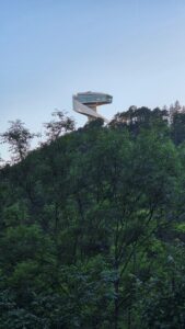 Nagle przede mną po prawej stronie zamajaczyła sylwetka skoczni narciarskiej. Zobaczyłem miejsce do zaparkowania na ostrym zakręcie, więc postanowiłem zrobić krótki postój w tym miejscu. Napisałem do Martina, że zbliżam się, ale z pewnością będę nie wcześniej niż o 20, bo mam jeszcze sporo do podjazdu. Robi się szarówka, bo słońce już zaszło. Prę dalej powtarzając sobie w głowie najczęściej powtarzaną komendę w Formule 1 „push push push”. Pasuje to do mojej obecnej sytuacji jak ulał. Zaczynam myśleć o poddaniu się i złapaniu autobusu, ale zastanawiam się, czy kierowca zatrzyma się, wysiądzie i pomoże mi zapakować rower na bagażnik, gdy mu powiem, że chcę podjechać raptem 10 km? Wątpię. Zwłaszcza, że nie ma na tej drodze zatoki autobusowej, więc autobus się zatrzymując blokuje ruch. Push push push. Robi się ciemno. Martin odpisał, że są w domu i czekają na mnie. Odpisuję mu, gdzie jestem i że ten podjazd to hardcore. Troszeczkę liczyłem na to, że zaproponuje, że podjedzie po mnie samochodem i mnie zgarnie 🙂 Ale nic takiego nie było. Odpisał chwilę później, że to już bardzo blisko i że czekają z kolacją. Super! Trzeba jednak w końcu się tam dowlec. To jadąc, gdy nachylenie na to pozwala, to pchając rower, gdy nachylenie przekracza 14% prę dalej. Już jest całkiem ciemno.
