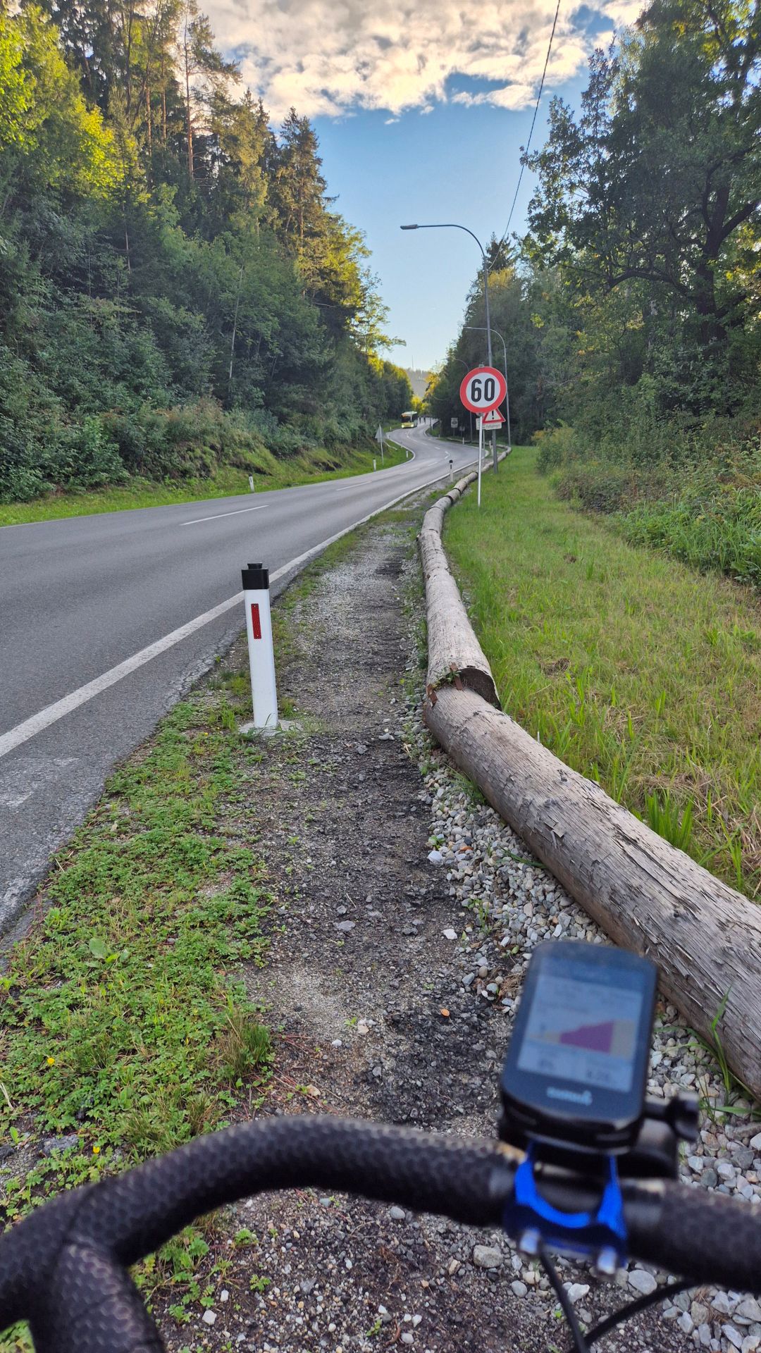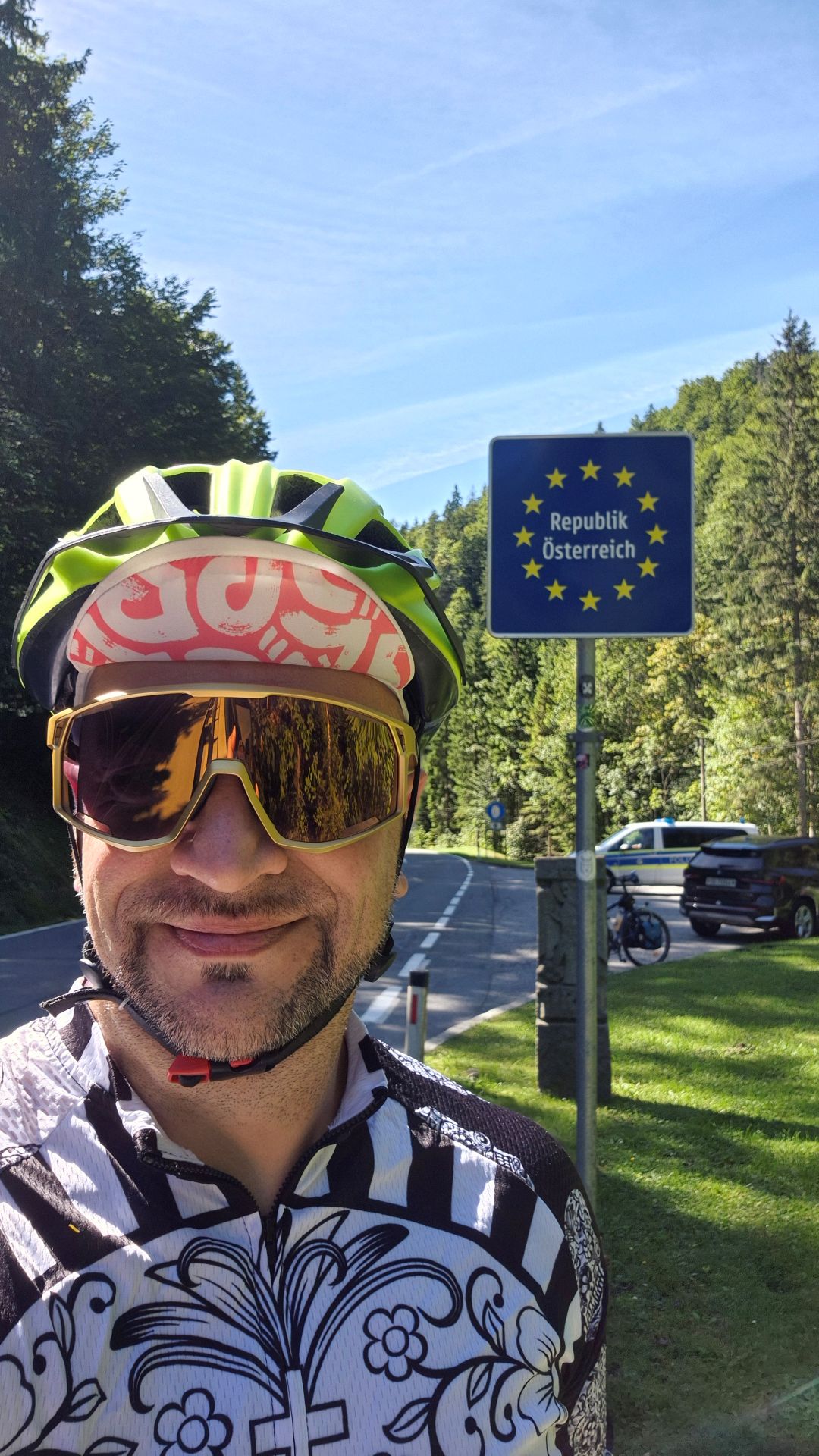 Ruszam dalej. Zaczyna się wspinaczka. W pewnym momencie nawigacja pokazuje mi zjazd na szlak po lewej stronie drogi. Przy zjeździe tym dostrzegam dwie dziewczyny, które dzisiaj rano wyjeżdżały z tego samego campingu co ja. Pozdrowiłem je i pojechałem dalej. One coś pakowały w sakwach. Nagle nawigacja się przywiesiła, więc stwierdziłem, że trzeba jechać dalej prosto. Po 200 m coraz ostrzejszego podjazdu nawigacja zaczęła pokazywać że mam tak jechać dalej. Ostra wspinaczka. Spociłem się, a droga była coraz gorsza. Wyglądało to już raczej na pieszy szlak niż ścieżkę rowerową. Mogłem to zrozumieć, bo to się zdarza na granicach państw. Ale gdy wyjechałem zza winkla i zobaczyłem ogromny podjazd, stanąłem. Nie widziałem, żeby w trakcie planowania trasy na dzisiaj był aż taki stromy i długi podjazd. Sprawdziłem w telefonie i się okazało, że powinienem jechać jakieś 500m niżej drogą dla samochodów, a tymczasem ja jadę jakimś pieszym szlakiem, który kończy się asfaltem za 30 a może więcej kilometrów tylko że nie tam gdzie ja bym chciał jechać. Ja potrzebuję jechać w kierunku zachodnim gdy wjadę do Austrii. A ta ścieżka na którą się wdrapałem idzie na południe. Szybka decyzja – wracam. To tylko kilometr do drogi którą powinienem jechać. Ruszyłem. Chwilę później spotykam sapiące dziewczyny. Zatrzymałem się, przywitałem i pytam, czy one są pewne, że chcą właśnie tędy jechać? Chwilę nie mogły zrozumieć o co mi chodzi, bo ich angielski był słaby, ale trochę po angielsku, trochę po niemiecku i się porozumieliśmy. One sprawdziły w swoich nawigacjach i jednak chcą tak jechać, choć są w szoku, że to taki ostry i długi podjazd. Owszem, jadą do Innsbrucku, ale dopiero jutro albo później, bo chcą się pokręcić po Austrii. Zdziwione były ogromnie, gdy usłyszały ode mnie, że ja dzisiaj nocuję za Innsbruckiem, bo to dla nich bardzo daleko. „Viel Gluck!” i pojechałem w dół. W końcu trafiłem na asfalt i ku mojej uciesze, po krótkim niedużym podjeździe dojechałem do tablicy informującej, że właśnie wjeżdżam do Austrii. Wóz policyjny sprawdzał papiery jakichś Szwajcarów, a mnie pokazali tylko OK i uśmiechnęli się, więc pojechałem już w dół.