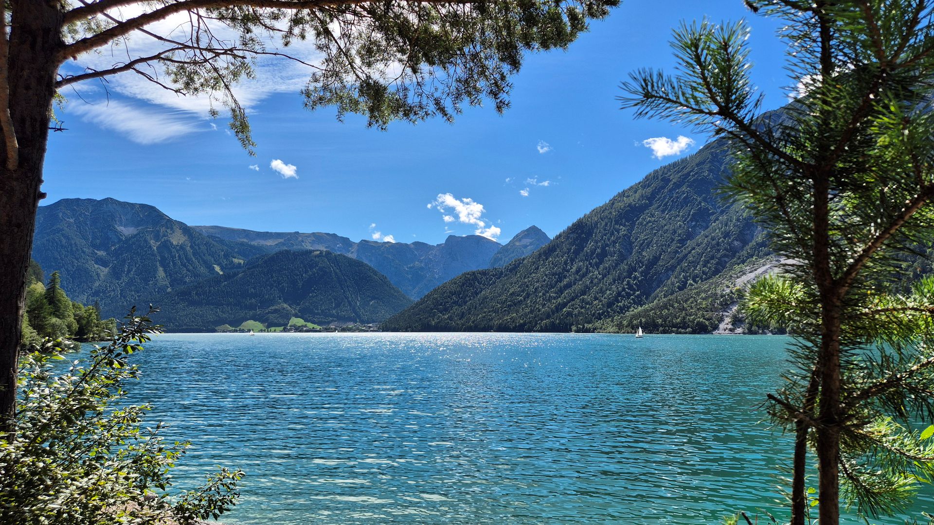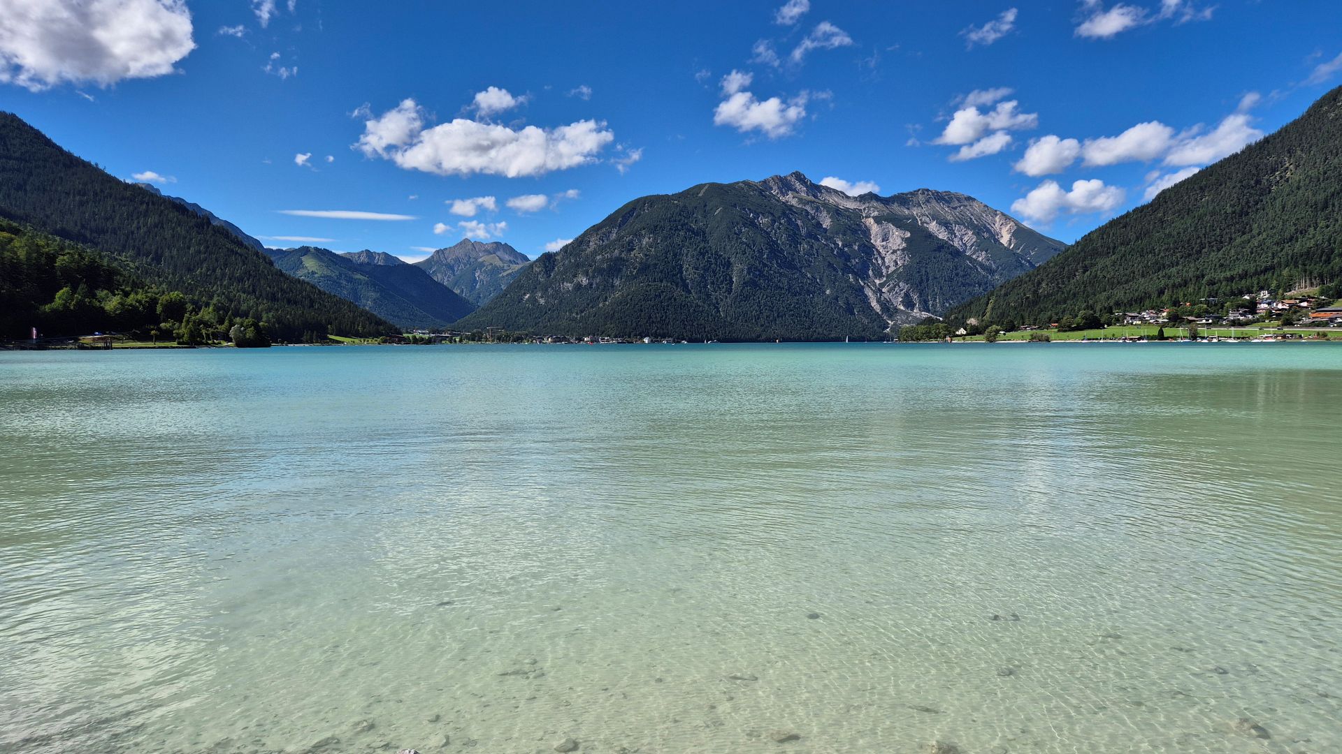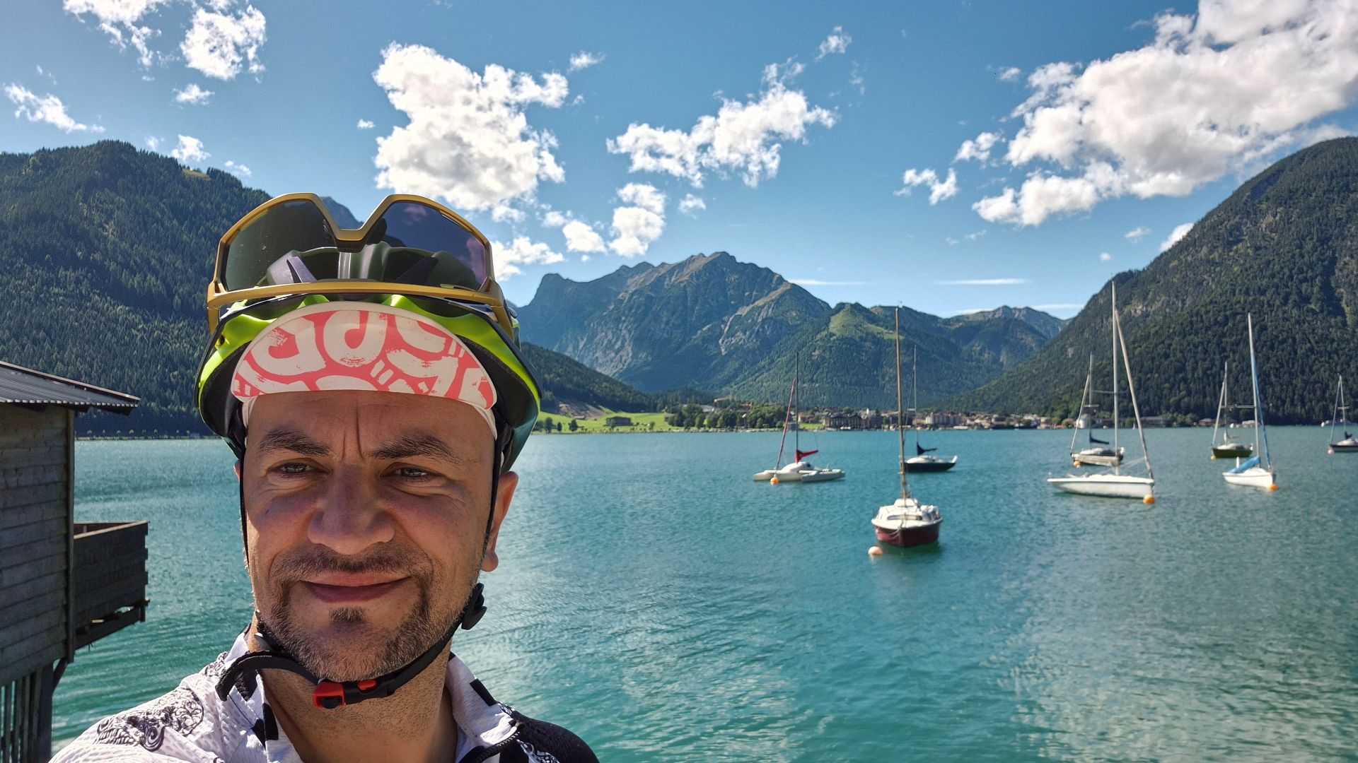Dojechałem do jeziora Achensee. Pięknie to wyglądało! Strome zbocza gór wchodziły wprost do wąskiego ale długiego jeziora. A ja jechałem jego wschodnim brzegiem. Pojawili się turyści. Miejscami całkiem sporo. No i jak to turyści – sądzili, że są jedyni na wąskim szlaku pieszo – rowerowym. Więc szli szpalerami kompletnie blokując mi możliwość przejazdu. Trudno. Trzeba dzwonić dzwonkiem. Najpierw na twarzach odmalowywało się zdziwienie – co to za dźwięk. Jakieś 20-30 sekund później nieśpiesznie ustępowali drogi. I tak co chwilę. Jazda jest więc nierówna. Przyśpieszam, hamuję, dzwonię, przyśpieszam, hamuję, dzwonię… Nie lubię tego, no ale co zrobić. Jak widać, nawet w Austrii pieszy nie myśli o innych. Ale jadę. Po drodze minąłem port z którego właśnie odpływał statek wycieczkowy. Wtedy też zrozumiałem, skąd tych pieszych tyle się pojawiło na mojej drodze. Piękny statek wygląda na całkiem nowy. O wiele nowszy od podobnych jednostek wycieczkowych jakie mamy w Polsce w podobnych miejscach turystycznych.