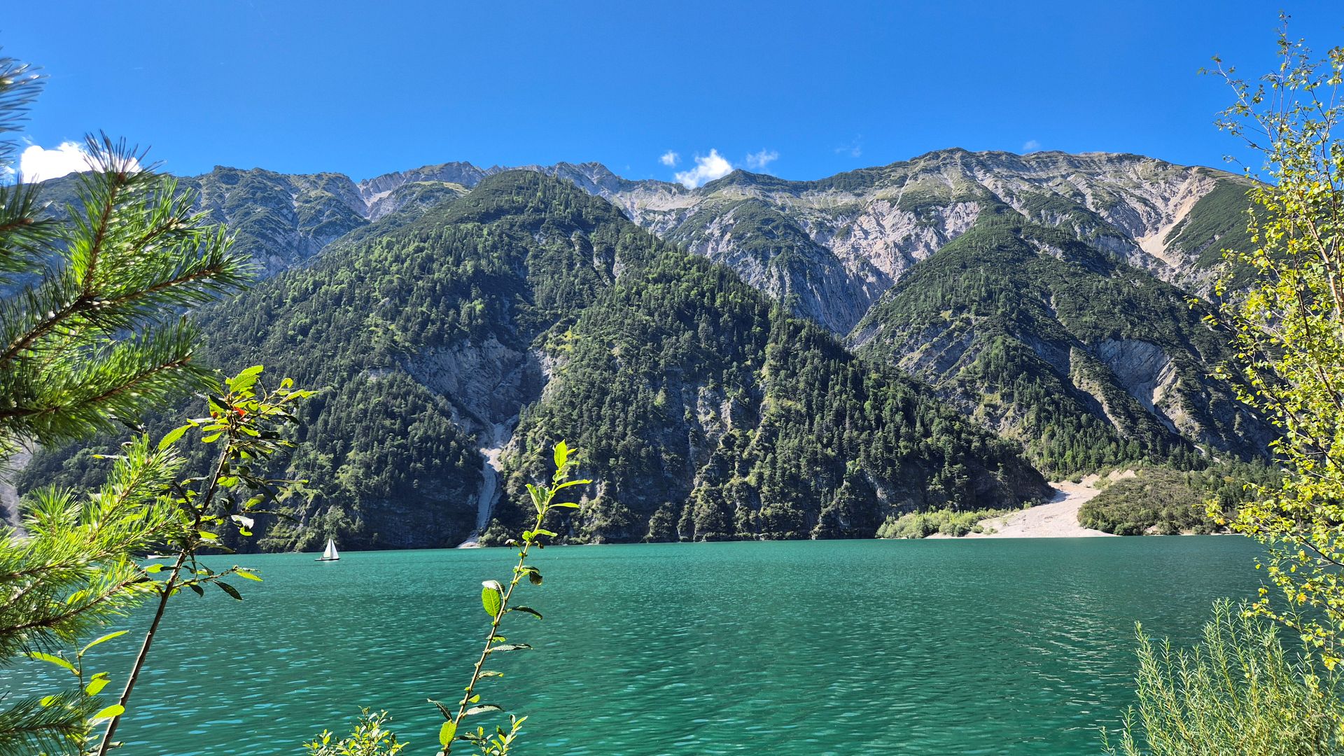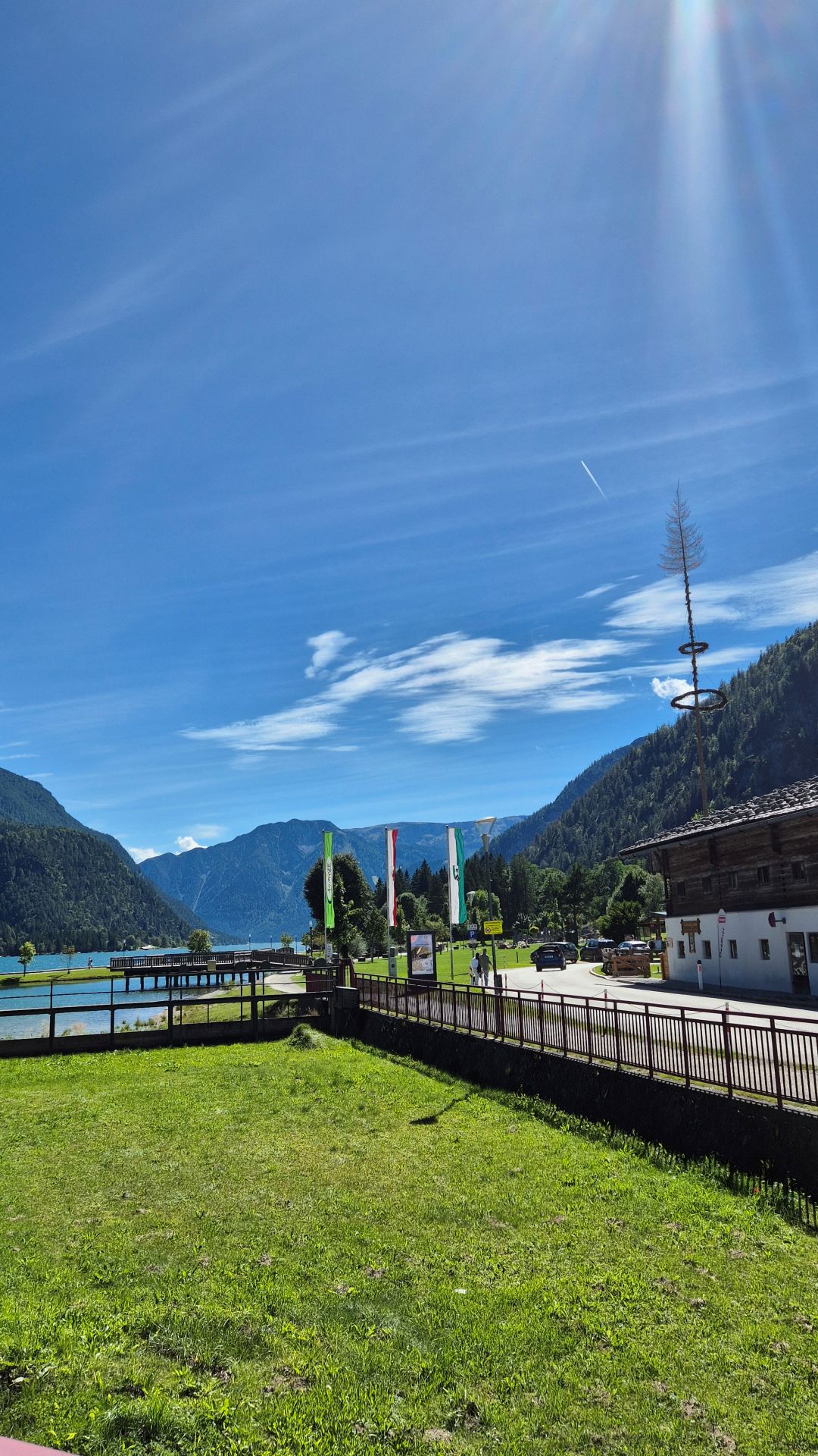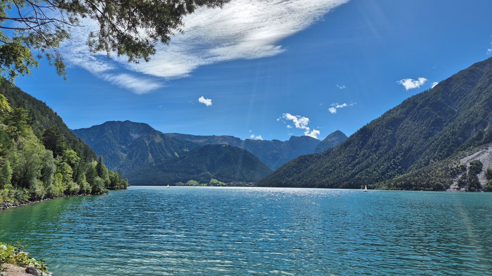Dojechałem do jeziora Achensee. Pięknie to wyglądało! Strome zbocza gór wchodziły wprost do wąskiego ale długiego jeziora. A ja jechałem jego wschodnim brzegiem. Pojawili się turyści. Miejscami całkiem sporo. No i jak to turyści – sądzili, że są jedyni na wąskim szlaku pieszo – rowerowym. Więc szli szpalerami kompletnie blokując mi możliwość przejazdu. Trudno. Trzeba dzwonić dzwonkiem. Najpierw na twarzach odmalowywało się zdziwienie – co to za dźwięk. Jakieś 20-30 sekund później nieśpiesznie ustępowali drogi. I tak co chwilę. Jazda jest więc nierówna. Przyśpieszam, hamuję, dzwonię, przyśpieszam, hamuję, dzwonię… Nie lubię tego, no ale co zrobić. Jak widać, nawet w Austrii pieszy nie myśli o innych. Ale jadę. Po drodze minąłem port z którego właśnie odpływał statek wycieczkowy. Wtedy też zrozumiałem, skąd tych pieszych tyle się pojawiło na mojej drodze. Piękny statek wygląda na całkiem nowy. O wiele nowszy od podobnych jednostek wycieczkowych jakie mamy w Polsce w podobnych miejscach turystycznych.