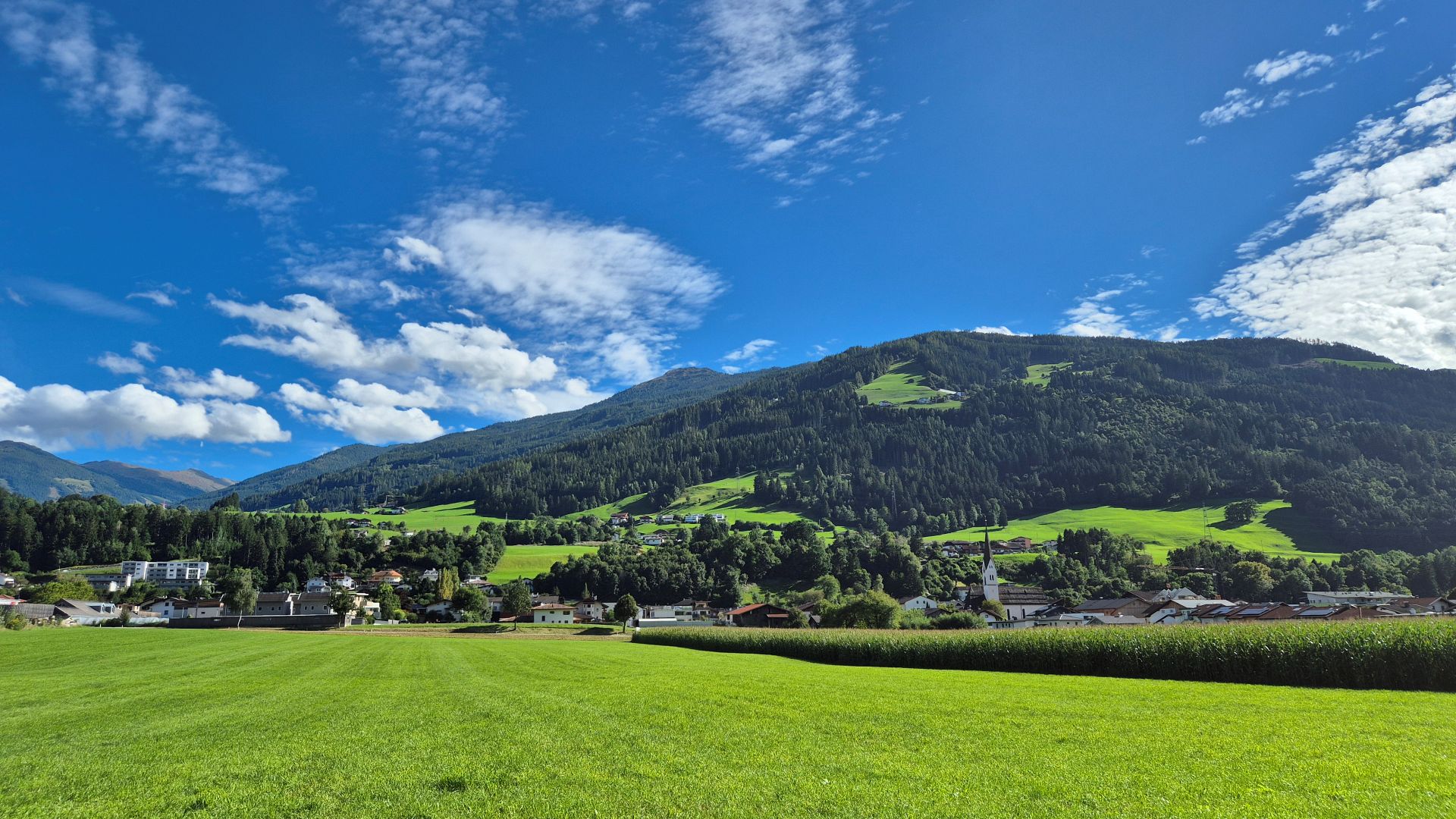 Dalej, brnąłem przez pola kukurydzy i sporej wielkości gospodarstwa rolne w dolinie, bo właśnie doliną jechałem ale już nie na południe, a na zachód. Droga prowadziła zygzakami pod kątem prostym. W pewnym momencie usłyszałem dźwięk helikoptera. W końcu dostrzegłem w oddali, że lecą trzy wojskowe helikoptery dość nisko tą doliną. Pomiędzy pasmami gór, więc echo potęgowało narastający huk. To były, jak mi się wydaje 3 Black Hawki. Idealnie wchodzi wtedy muzyka z opery Wagnera „Jazda Walkirii”. Pierwszy raz to widziałem w filmie „Czas apokalipsy”, gdy do tej muzyki leciały helikoptery z zamiarem zaatakowania wietnamskiej wioski. I jakoś tak patrząc na tę formację trzech Black Hawków przypomniała mi się ta muzyka – pasowała idealnie! 🙂 Ja tymczasem starałem się nieco zwiększyć tempo równej jazdy, by jak najszybciej dojechać do Innsbrucka na obiad i małe zwiedzanie.