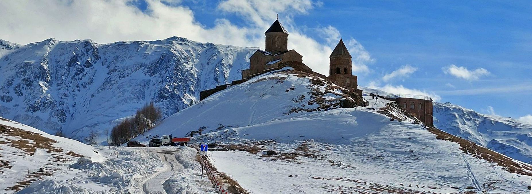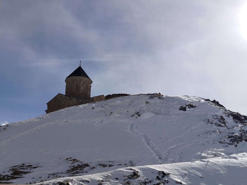 Niedługo potem dojechaliśmy do miejscowości Stepantsminda z rosyjskiego zwanej Kazbegi i dojrzeliśmy jeden z najwyższych szczytów Kaukazu – Jego Wysokość Kazbek! Dość „terenową” i krętą drogą wdrapaliśmy się terenówką na parking u podnóża wzniesienia na którym stała cerkiew Trójcy Świętej – Cminda Sameba. Podchodząc do niej wciąż po prawej stronie miałem widok na Kazbek. Wiało niemiłosiernie i było wyraźnie zimniej niż na dole – w dolinie. Ach! Gdybym wiedział, co Kuba szykuje, z pewnością wziąłbym drona! Ale czy Bronek poradziłby sobie z tym wiatrem? Nie wiem… Pewnie niestety nie, bo jest dość mały. Cerkiew jest położona na wysokości 2170 m n.p.m. Dzwonnica i cerkiew prawdopodobnie powstały w XIV w. W XV wieku dobudowano do niej przylegający budynek. Ciekawostką jest, że z racji popularności cerkwi w czasach Związku Radzieckiego (bo cerkiew jest niemal obowiązkowym punktem podczas podejścia na Kazbek), w 1988 roku władze zbudowały do niej z miejscowości Stepantsminda w dolinie, kolejkę linową. Mieszkańcy nie byli jednak z tego zadowoleni i kolejkę rozebrano. Została tylko dolna stacja, w której obecnie jest muzeum.