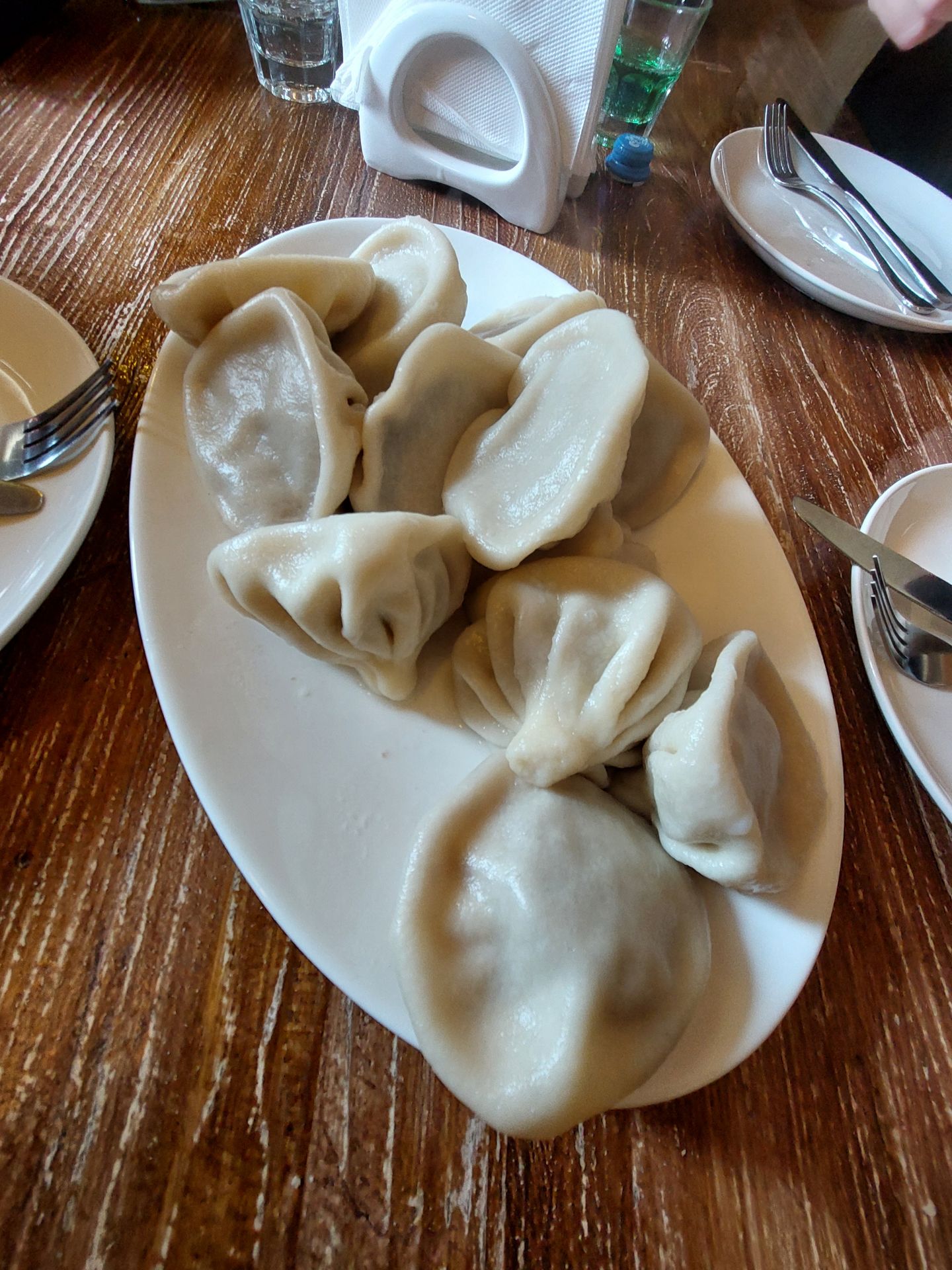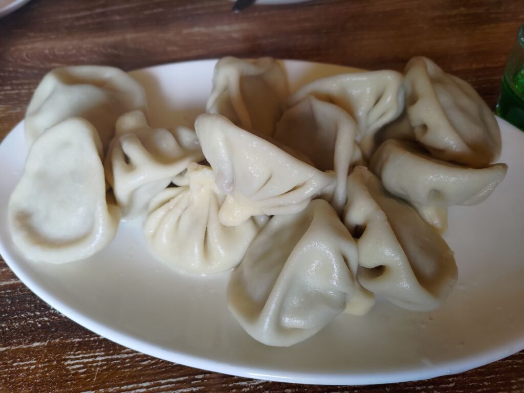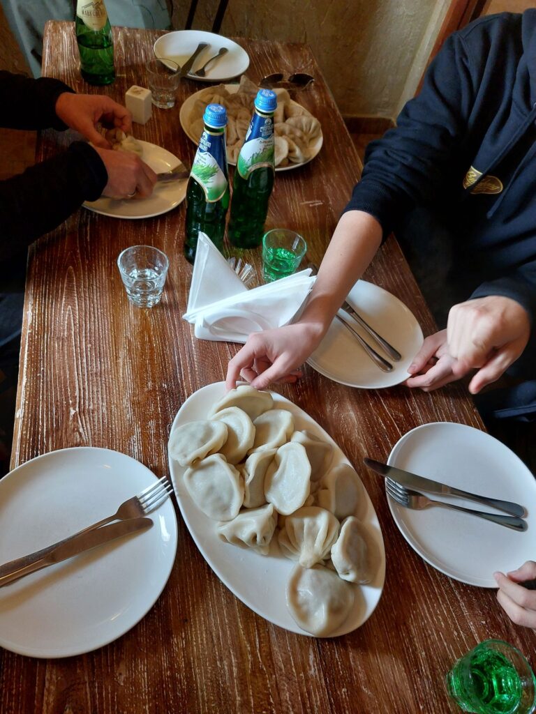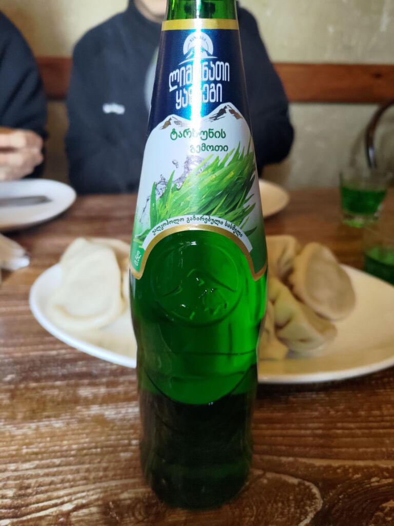 Szybki prysznic, zmiana ciuchów i zjawiliśmy się przy terenówce Kuby. Ruszyliśmy w kierunku góry Kazbek! Kuba tym razem przyjechał swoją terenówką Mitsubishi Pajero. A jako że było nas cztery osoby dorosłe i troje młodzieży 14-15 letniej, to dwoje z nas musiało usiąść w bagażniku, gdzie była dodatkowa ławka na dwie osoby właśnie. Mimo, że my byliśmy świeżo po późnym śniadaniu i zarazem pierwszym normalnym posiłku po ponad 12 godzinach, to i tak decyzją Kuby – kierownika – w drodze zatrzymaliśmy się w przydrożnej restauracji na przepyszne chinkali. To takie sakiewki z ciasta niemal identycznego jak w naszych pierogach, wypełnione mięsem i bulionem. Trzeba się w taką sakiewkę wgryźć, wyssać bulion i zjeść zawartość a zostawić „ogonek” czyli górę tej sakiewki. Jak zwykle, Kuba zamówił tego tyle, że ledwie daliśmy radę zjeść, a popijaliśmy oczywiście lemoniadą „tarhun”, czyli zielonym napojem gazowanym o smaku estragonu. Uwielbiam! Ten napój jest dla mnie jak sentymentalna podróż do przeszłych czasów ZSRR!