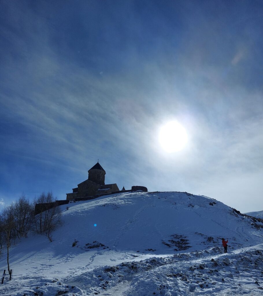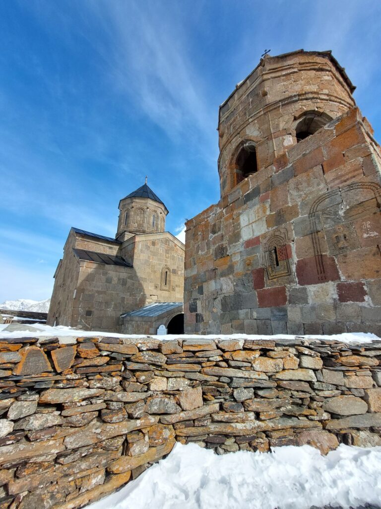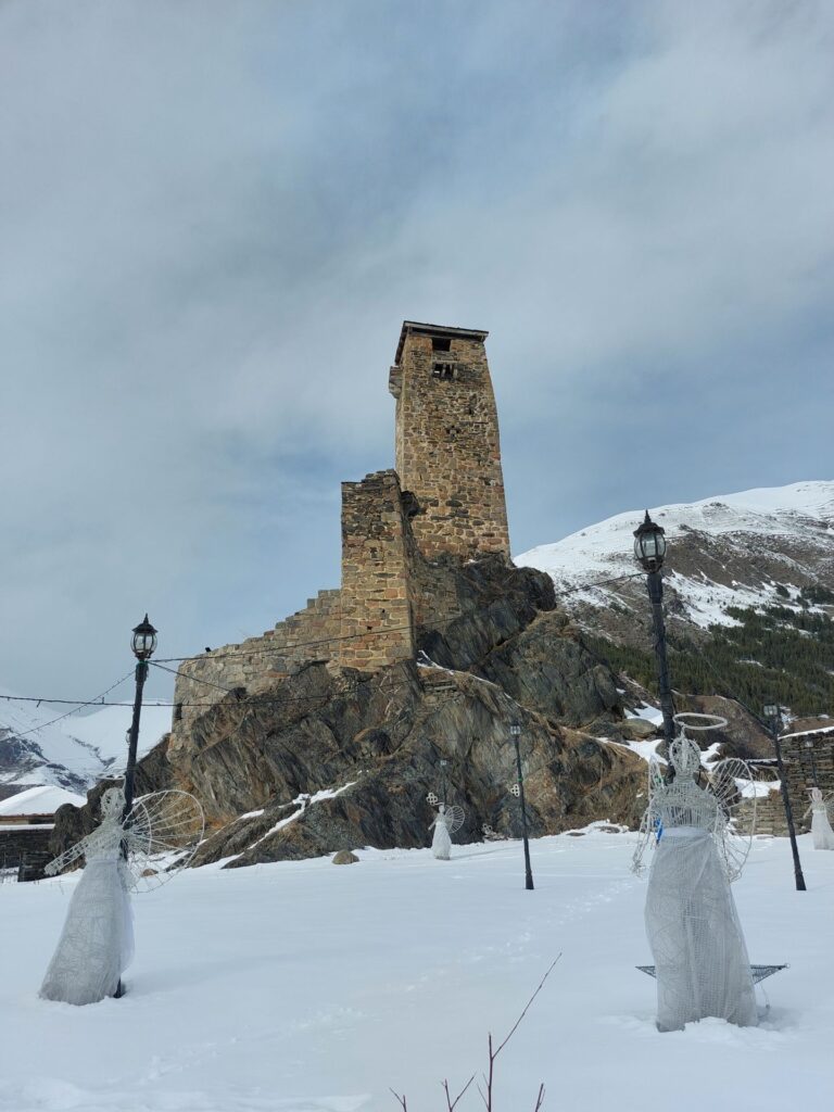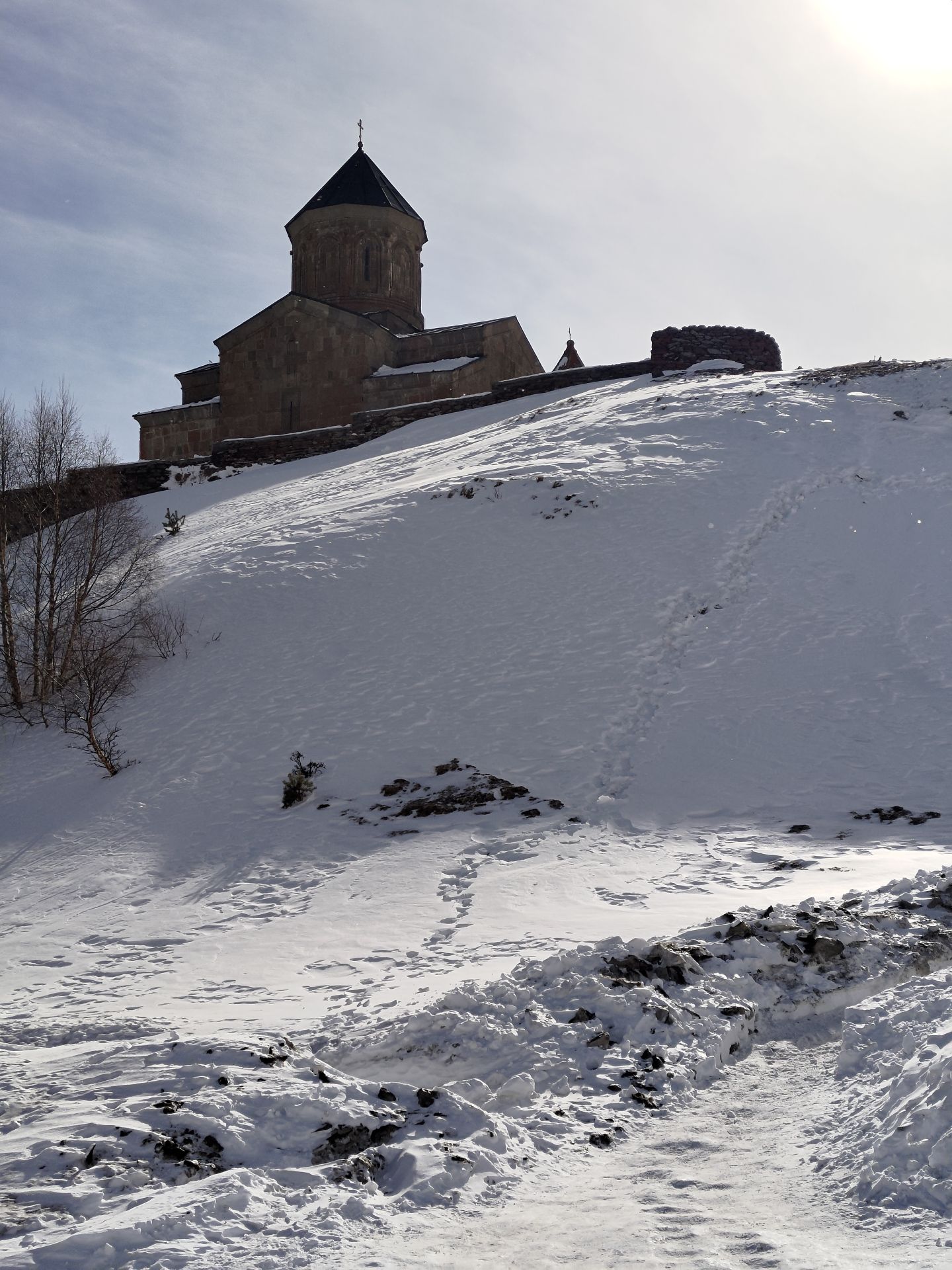 Gdy ogrzaliśmy się nieco i nacieszyli widokami ruszyliśmy do twierdzy, zamku Sno – nieopodal Kazbegi. Ponieważ tereny te były regularnie w odległych wiekach najeżdżane przez różne wojska, powstała tutaj twierdza w XVI wieku, z której lokalna ludność mogła się bronić przed napastnikami. To kolejne miejsce, które najczęściej można spotkać na pocztówkach (kiedyś), albo na instagramie (obecnie). Malownicze miejsce, choć nam dzisiaj pogoda nie sprzyjała zbytnio w zrobieniu spektakularnie pięknego zdjęcia…
