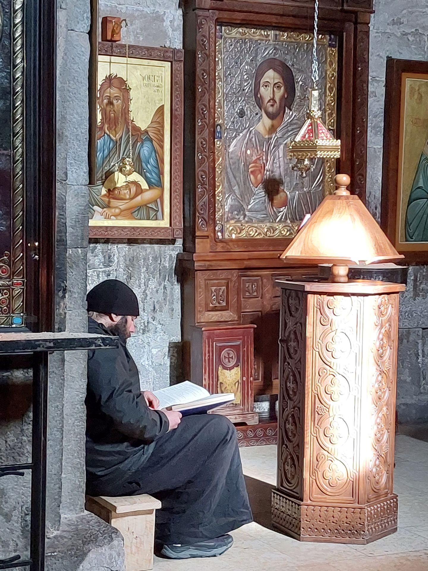 Lubię klimat półmroku takich starych cerkwi, kościołów. Im są to starsze budowle, tym bardziej można poczuć mistycyzm tych miejsc. Jest on niemal namacalny. Tu, w cerkwi Trójcy Świętej z półmroku wyłaniały się piękne ikony na tle czarnych, chyba okopconych kamiennych ścian. Zapaliliśmy świeczki w intencji bezpiecznej podróży i czasu w Gruzji. Dostrzegłem mnicha, który w kuckach, w skupieniu i ciszy studiował ogromną księgę. Zdawał się kompletnie nie zwracać uwagi na nas i kilkoro innych osób kręcących się po wnętrzu kamiennej budowli. Jestem jednak pewny, że miał baczność na nas. Zadzierając głowę w górę z perspektywy wnętrza, miałem wrażenie jakby budowla była znacznie wyższa niż gdy patrzyłem na nią z zewnątrz, a zwłaszcza podchodząc do niej. Wówczas wydawała się taka mała…