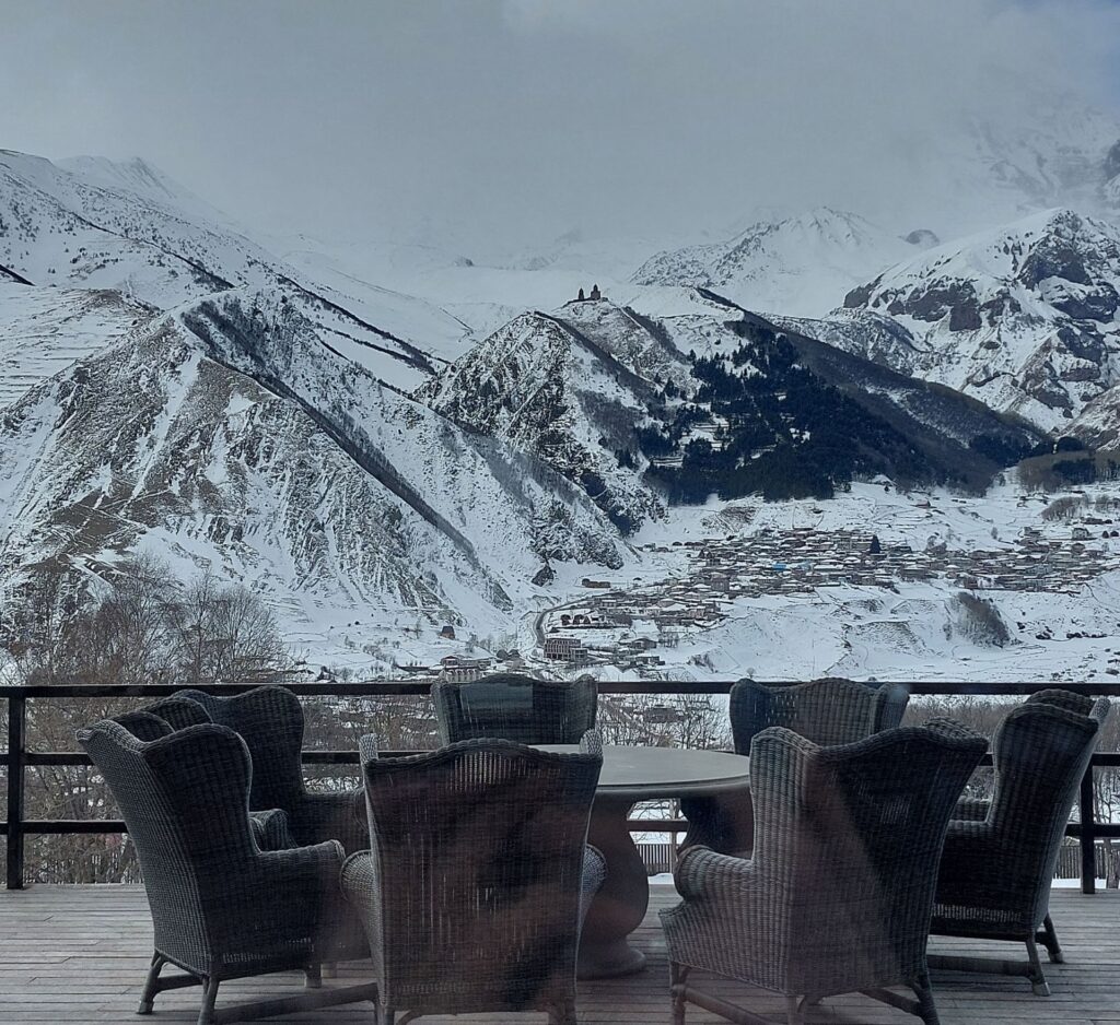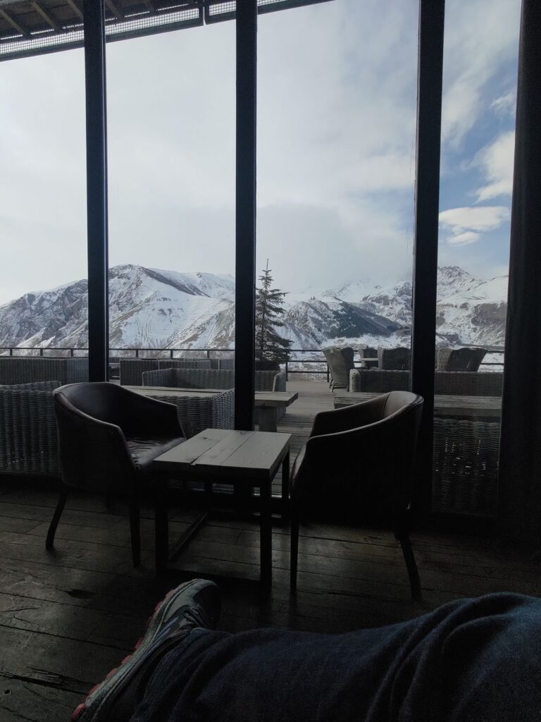 Zmarzliśmy tam na tyle, że Kuba zabrał nas w Kazbegi (to jeszcze radziecka nazwa) a właściwie Stepantsminda do Rooms Hotel. Tam usiedliśmy w ciepłej kawiarnio-restauracji. Miejsce urządzone stylowo! Trochę Loft z wykorzystaniem starych elementów kojarzących się ze schroniskiem górskim, ale nie to było w tym miejscu najważniejsze. Widok jaki rozpościera się z całkowicie przeszklonej części od strony Kazbeku i cerkwi Świętej Trójcy – Cminda Sameba – to jest to, co przyciąga tutaj ludzi! Do tego jest jeszcze taras, na którym w ciepłe dni można nie tylko cieszyć się dobrą kawą, czy jedzeniem, ale przede wszystkim kontemplować widoki. Taki instagramerski spot – można takie foty palnąć, że szok!