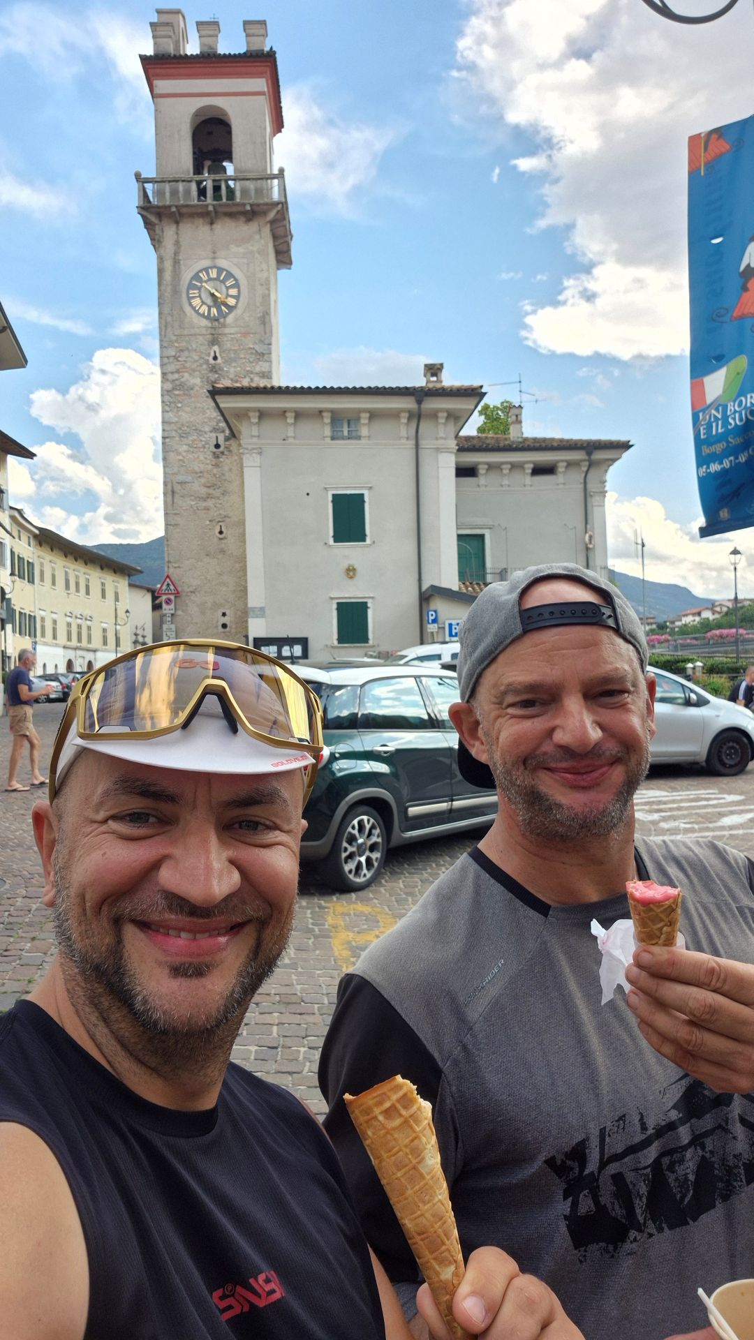 Ruszyliśmy razem. Z rozmowy wynikło, że on nazywa się Reiner i jedzie z Niemiec, gdzie mieszka we Freiburgu przy granicy ze Szwajcarią a jedzie do Rzymu… Już myślałem, że jedziemy w ten sam sposób, ale okazało się, że on będzie jechał zachodnim wybrzeżem przez Pisę a ja od jeziora Garda odbijam w kierunku wschodniego wybrzeża. Niemniej jednak docelowo kończę swoją wyprawę w Rzymie, skąd wracam samolotem do Polski. Reiner, co wynikło z rozmowy jest ode mnie nieco starszy, ale dobrze wygląda, bo podobnie jak ja robi użytek z żelastwa w klubie fitness. Z tą różnicą, że on jest też instruktorem fitness. I tak jadąc, rozmawiając i poznając się dojechaliśmy do Rovereto. Gdy tylko zobaczyłem kawiarnię z lodami, zaproponowałem mojemu nowemu koledze kawę i lody. Zatrzymaliśmy się. Lody we Włoszech smakują wybitnie. Wszędzie! To jest dla mnie zagadka, z czego to wynika, ale jest to fakt – gdzie bym nie spróbował lodów we Włoszech – wszędzie są lepsze niż w najlepszych miejscach w Polsce. No może te najlepsze lody w Polsce smakują chociaż tak dobrze jak w najsłabszych miejscach we Włoszech… Tak bym to określił. I to jest dla mnie zagadka – jak to się dzieje i z czego to wynika?