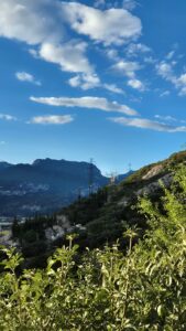 Po wyjechaniu z Bolzano szlak prowadził mnie wzdłuż przepływającej przez to miasto rzeki Isarco-Eisack. Niedługo później rzeka ta łączy się z rzeką Adige-Etsch, która spływa od strony zachodniej. I właśnie wałami przeciwpowodziowymi na których zrobiona jest ścieżka pieszo-rowerowa jechałem już niemal cały dalszy dzień. Rzeka płynie doliną pomiędzy pasmami Dolomitów. Zresztą Bolzano nazywane jest „bramą Dolomitów”. Ścieżka ta, którą jechałem jest szlakiem rowerowym doliny Adygi (Pista Ciclabile Valle dell’Adige). Co chwilę mijałem biegaczy – ultramaratończyków, którzy biegli w tym samym co ja kierunku, czyli południowym. Praktycznie wszyscy mieli na oko ze dwadzieścia lat więcej niż ja. Większość z nich biegła w niemal równych odstępach od siebie. Naprawdę podziwiam tych ludzi, bo ja nie lubię biegać a już zwłaszcza tak długich tras jak oni! Całkiem sporo ludzi poruszało się tym szlakiem. Sporo rowerzystów, z czego zdecydowana większość jechała rowerami elektrycznymi. Pozostali jechali na pusto (więc bez bagaży) rowerami szosowymi lub gravelami. Takich jak ja turystów rowerowych było niewielu. Słoneczko świeciło, zaczęło się robić wręcz gorąco. A ja jechałem tą piękną doliną położoną pomiędzy strzelistymi Dolomitami. W dolinie niemal każdy skrawek przestrzeni był zagospodarowany. Głównie plantacjami jabłek i winorośli. Sama przyjemność!