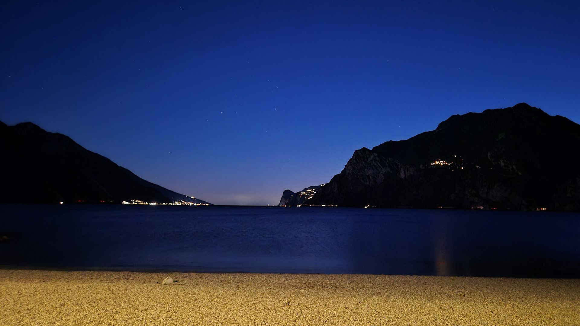 Dojechałem do pierwszego wybranego przeze mnie przez Internet campingu i po odstaniu swojego w kolejce dowiedziałem się od Pani, że nie ma dla mnie miejsca. Podjechałem do Camping Europa. Nie było problemu. Dostałem czipa do furtki do jeziora, kartę do łazienek i wykupiłem jeszcze żetony do pralki i suszarki, bo pranie trzeba było już zrobić. Miejsce na namiot nie było jakieś rewelacyjne, ale to przecież tylko na jedną noc. Pod płotem z dala od wszystkiego. Camping spory – mnóstwo kamperów, przyczep. Generalnie praktycznie komplet. Szybko rozbiłem namiot i obok recepcji nastawiłem pranie moich rowerowych ciuchów i tych ciepłych, które po deszczowych dniach też wymagały prania. Wiał wiatr, ale przynajmniej nie padało. Przygotowałem w namiocie wszystko do spania, wykąpałem się i po przebraniu mogłem wrócić do pralni. Ustawiłem suszenie wypranych ciuchów. Miałem dwie godziny, może mniej zanim skończy się suszenie rzeczy, a ja byłem bardzo głodny. Poszedłem najpierw do jeziora zobaczyć, jak wygląda w tej już nocnej scenerii i później do centrum miasteczka.