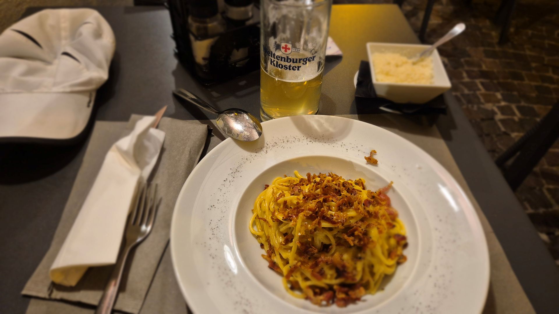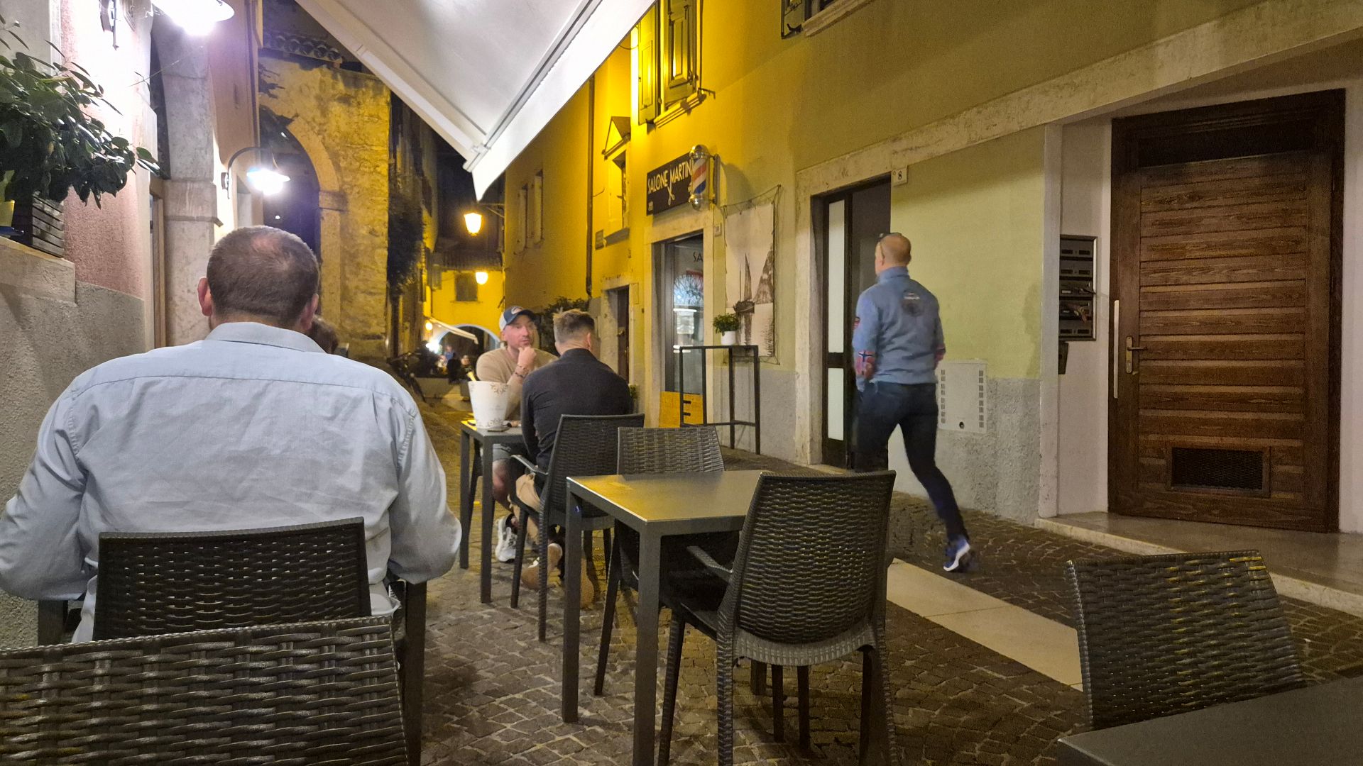 W wielu miejscach wszystkie stoliki były zajęte. Na szczęście w Ristorante Pizzeria Al Pescatore (u Rybaków) był dla mnie wolny stolik. Zamówiłem spaghetti carbonarę i radlera. Makaron był przepyszny, jak dotychczas najlepszy. Z całą pewnością był z guanciale a nie boczkiem, więc wszystko tak jak być powinno. Po kolacji ruszyłem do tawerny pubu Cutty Sark. A tam impreza! Mały zespół grał jakieś jazzowo-bluesowe standardy. Wziąłem colę zero i posłuchałem ich chwilę. Byłem zmęczony, więc niedługo później ruszyłem spowrotem do campingu po drodze tylko zahaczając na lody. Znowu pyszne!