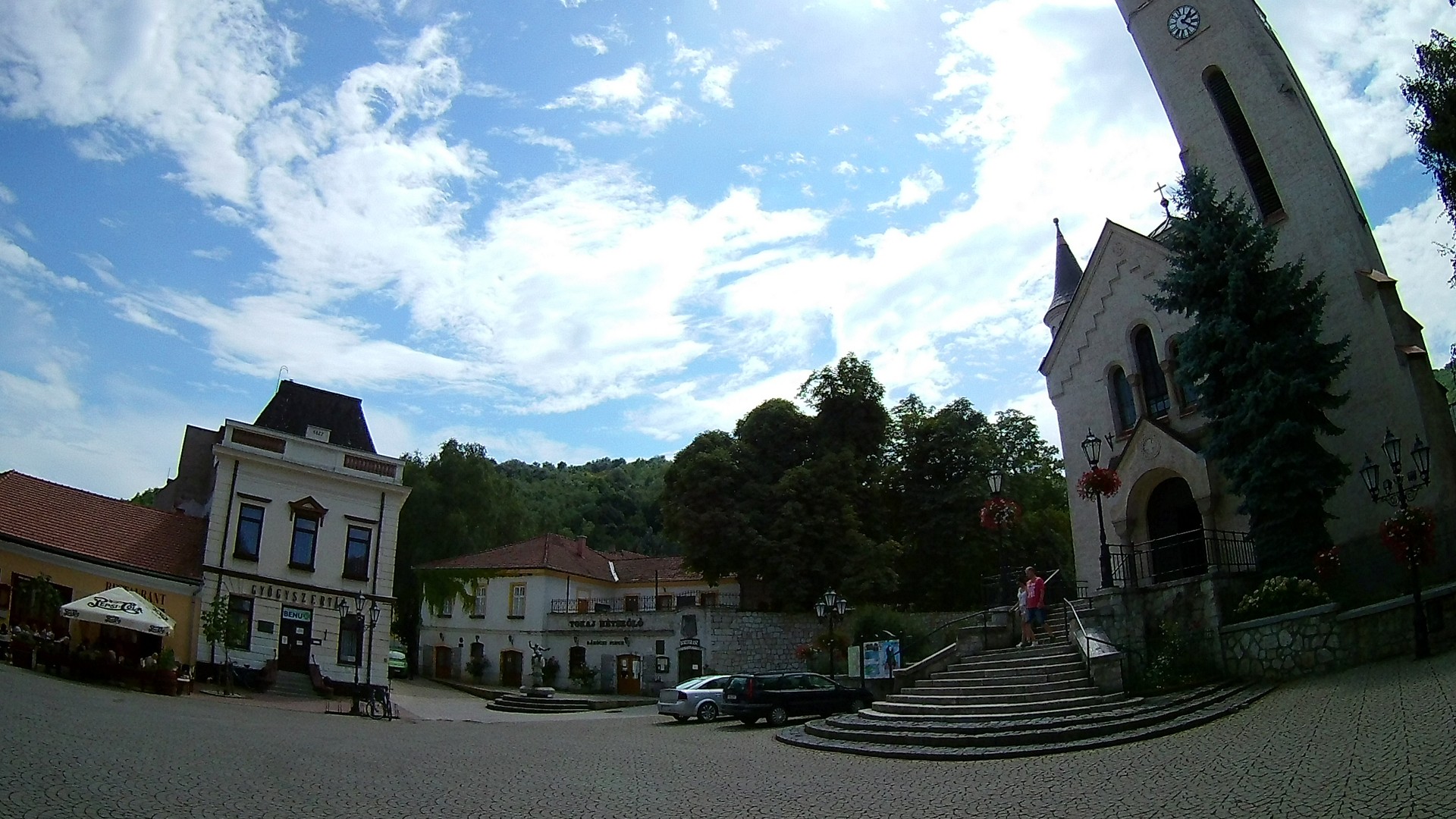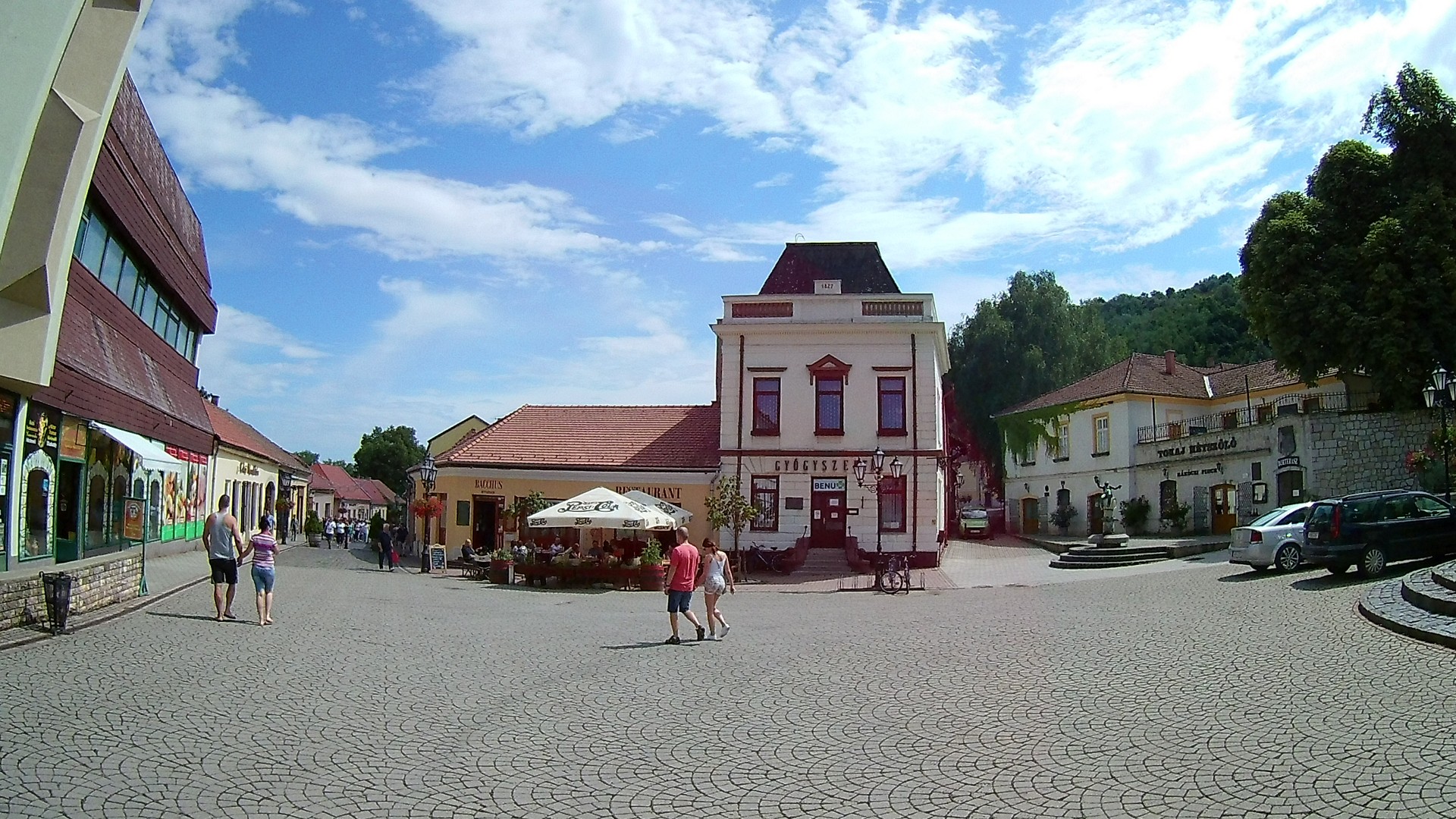 W miarę sprawnie przeprawiłem się promem na drugą stronę rzeki Tisza. Wtedy też dowiedziałem się, że reszta forintów sprzed dwóch lat nie do końca się nadaje do płacenia za prom, bo jeden banknot został wycofany z obiegu rok temu. Na szczęście wystarczyło na zapłatę za przeprawę. W pięknej słonecznej pogodzie wjechałem do Tokaju. Liczyłem na obiad. No cóż… Podobnie jak sporo turystów. Niedziela. Godzina po 13. Pora obiadowa. Nie ma się więc co dziwić, że miejsc wolnych przy stolikach nie było. Dlatego szukałem lokalu z mniejszą ilością turystów. Znalazłem tylko kawiarnię w starówce.
