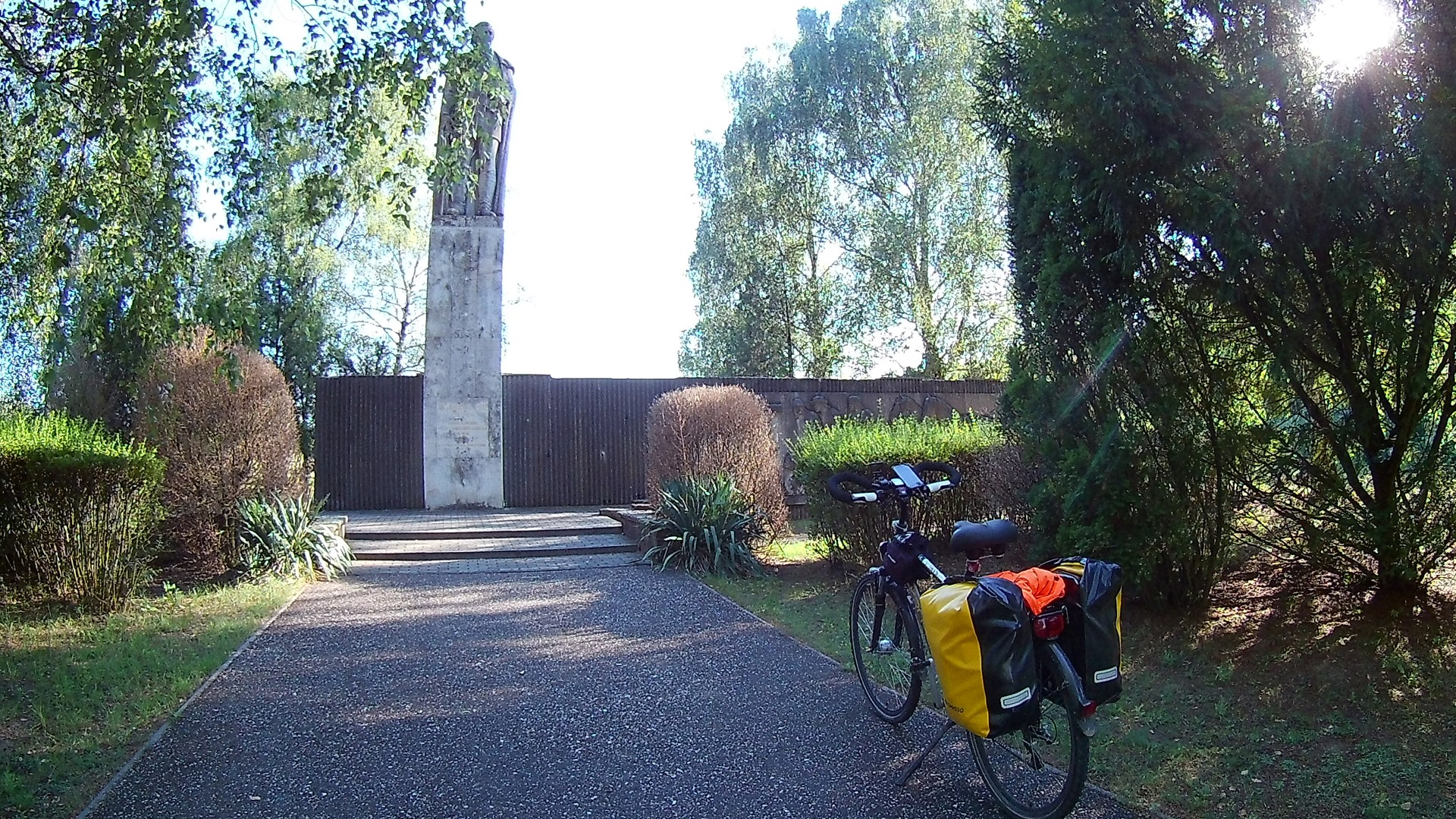 Przy trasie dostrzegłem mały park z pomnikiem. Zatrzymałem się w cieniu odpocząć i sprawdzić, co zacz. Pomnik upamiętnia inżyniera, który w latach czterdziestych XIX wieku realizował jedno z największych swych dzieł życia. Chodziło o uregulowanie biegu rzeki Tisza (Cisa) i zabezpieczenie przed powodziami z jej powodu. Projekt ogromnym nakładem pracy ukończono w 1845 roku a bieg Cisy skrócono o 40%. Od tamtej pory mieszkańców tych terenów Węgier nie nękały już powodzie. I w podzięce za to i za kilka innych dokonań owego inżyniera Pala Vasarhelyi (np. uregulowanie Dunaju, by możliwa była żegluga do Morza Czarnego.