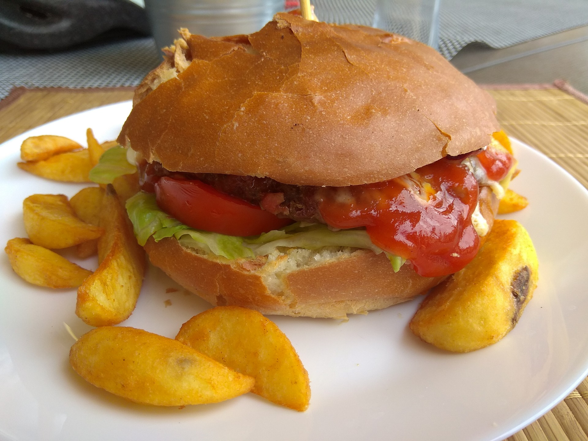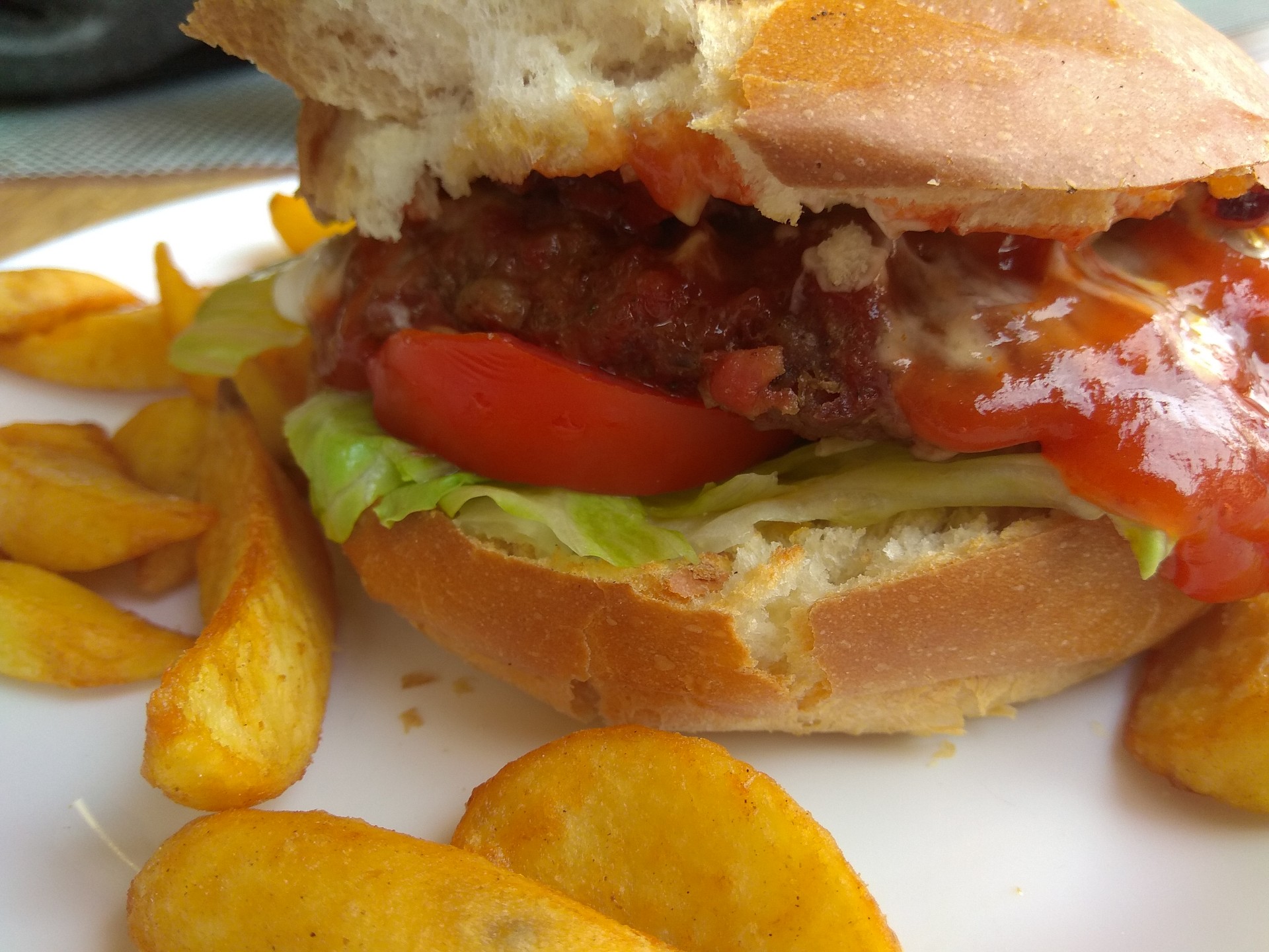 Mijałem słowackie winnice i tak mi zleciał czas aż do granicy SK -HU w Szatoroljoujhely. Co za różnica! Na Słowacji w sobotę i niedzielę czynne tylko pojedyncze bary z piwem lanym i niczym więcej – żadnego jedzenia. Ba! Nawet kofoli capovanej nie mają, jedno tesco po mojej drodze i podobno w Humenne Kaufland. Reszta „zatworena” (zamknięta). Restauracje, sklepiki, bary, sklepy. Wszystko! Na Węgrzech tymczasem ludzie chcą zarobić! O 12 otwarty bar przy mojej drodze, wiec długo się nie zastanawiałem. Zamówiłem cheeseburgera z bekonem. Był delikatnie mówiąc niedobry. Mięso dziwne. Ale chwała mu za to że był. Bo jak się okazało później, był to ostatni posiłek dzisiejszego dnia na ciepło.