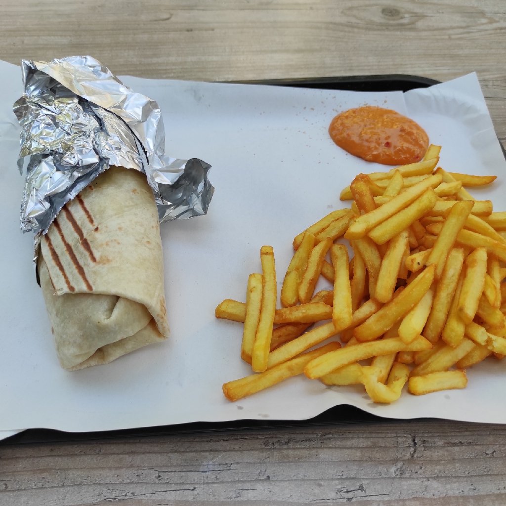 Zrobiłem się głodny, a wiedząc, że kolejna okazja do jedzenia będzie dość późno, stwierdziłem że spróbuję tutejszego kebaba, bo więcej ich tutaj niż rodzimych potraw francuskich. Znalazłem knajpkę, która wydawała mi się dość oblegana. Próbowałem wyczaić, jak to zrobić, by zamówić jedzenie, usiąść przy stoliku i nie bać się że ktoś mi buchnie rower albo coś z roweru. Zainteresował się mną chłopak, który pracował w tym barze. Spytał się, co chciałbym zjeść. Powiedziałem że kebaba we wrapie z warzywami i sosami, ale że nie mam jak usiąść obok roweru. On mi na to, patrząc głęboko w oczy: „do not worry my friend. Put your bike anywhere and take a seat. Me and my colleges will take care of you and your bike”. Trochę mnie uspokoił ale i tak postawiłem rower dość blisko mojego stolika. Chodzi o to, że stoliki były tak gęsto rozstawione, że nie mogłem przejechać między nimi. Musiałem znaleźć miejsce na zewnątrz „ogródka”. Kebab smaczny, oczywiście nic się nie stało. Czułem się bezpiecznie, zwłaszcza że przy stoliku obok siedzieli chyba stali bywalcy i to oni opierniczyli jakiegoś kolesia, który nagle przystanął i zaczął się przyglądać mojemu rowerowi.