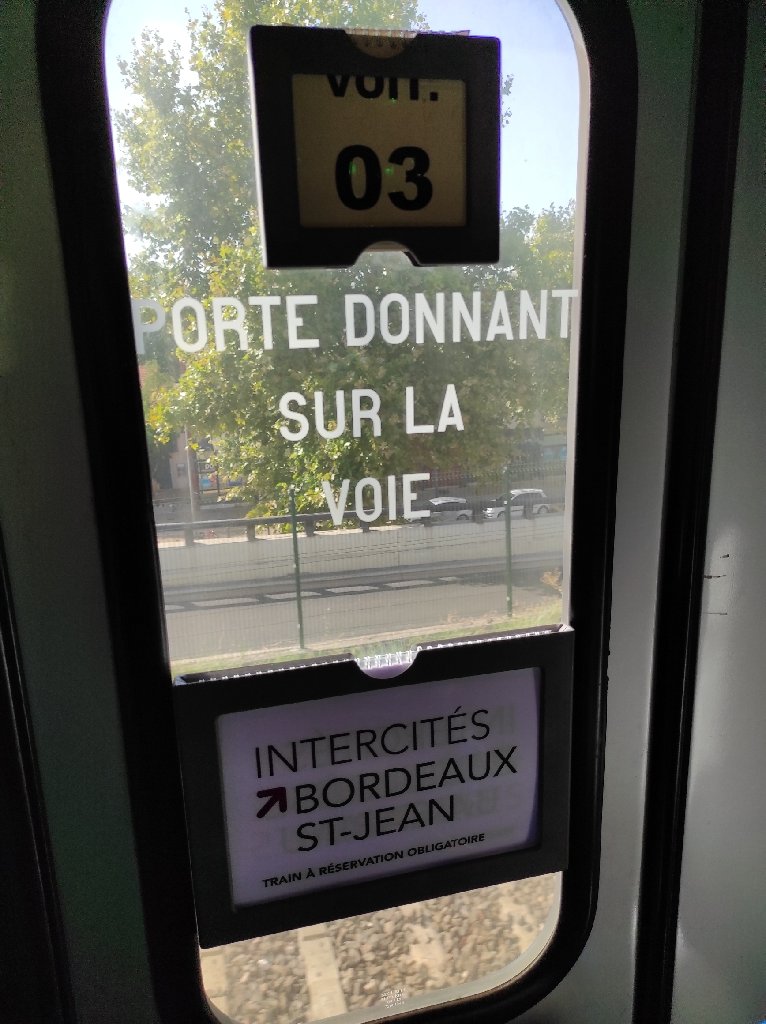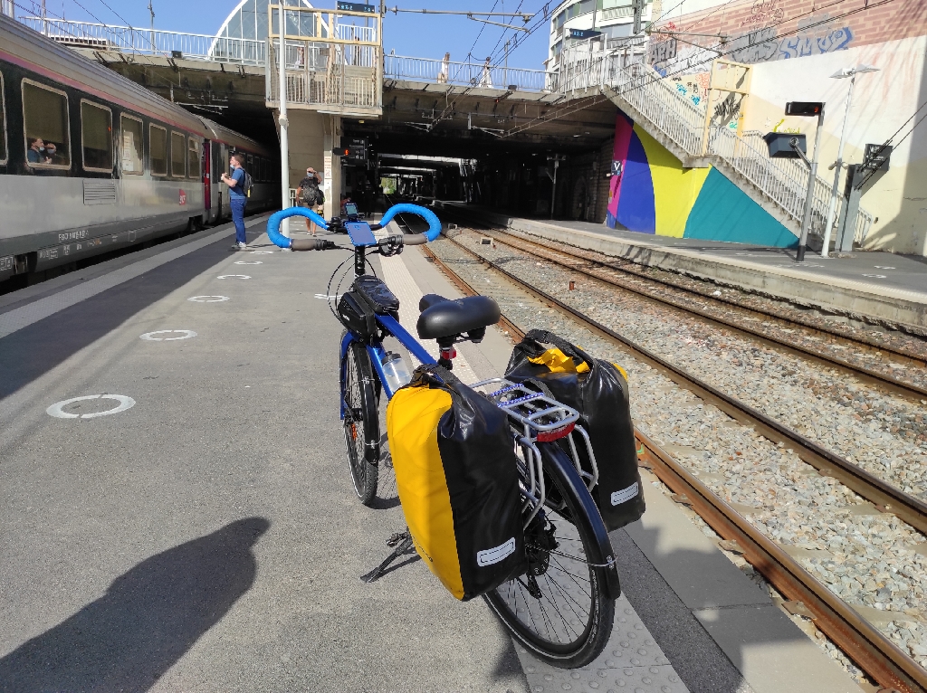 Na bilecie online mojego pociągu do Montpellier napisane jest wyraźnie, że wszyscy, którzy się pojawią na peronie 2 minuty przed odjazdem, nie zostaną wpuszczeni do pociągu. Czas zleciał, normalnie gdy było 20 minut do odjazdu innych pociągów, nagle na tablicy odjazdów pojawiała się litera peronu z którego dany pociąg odjeżdża. No i komunikat głosowy „en françe”. Wtedy jak rażeni piorunem ludzie całą masą pędzili do odpowiedniego peronu by wsiąść do pociągu. Ja z moim dużym rowerem z sakwami, jak za przeproszeniem z bawołem przeciskającym się przez tłum… Chciałem tego uniknąć, więc zacząłem obstawiać, z którego peronu będzie mój pociąg i tam właśnie czekałem. Ale czas leci, a informacji nie ma. Gdy było już tylko 5 min do odjazdu zacząłem się poważnie martwić… Nie było przy tym żadnej informacji o opóźnieniu. Sprawdzałem raz po raz, czy to na pewno ten pociąg? Numer się zgadzał. Kierunek Bordeaux… Może być… Dwie minuty do odjazdu. Dalej nic… Stanąłem jak cały tłum przy monitorze i czekam. Nie ma tutaj punktu informacyjnego, bym mógł się spytać, co się dzieje? 10 minut po czasie odjazdu pociągu wreszcie się pojawia literka. Inna niż obstawiałem. Zadziałało to jak wystrzał pistoletu, bo wszyscy jak z bloków startowych na niedawnych igrzyskach ruszyli galopadą do peronu E. W tym wszystkim ja z moim niebieskim wilkiem starający się nie staranować nikogo, a nie jest to łatwe, bo mnóstwo ludzi leży na ziemi, siedzi na ziemi, nagle sobie staje i gapi się gdzieś, jacyś starsi ludzie idą powolutku a pomiędzy nimi młodzi zwinnie się przeciskają byle szybciej. W końcu stoję w kolejce. Paszport covid? Proszę. Bilet? Proszę. Szukam wagonu (coach) 4, mam miejsce 4. Ale wagon 4 nie ma przedziału dla rowerów. Wagon 3 ma… Ładuję rower do 3 wagonu, zawieszam go za przednie koło, ściągam sakwy. Sprawdzam czy moje miejsce 4 w wagonie 4 jest wolne… Nie. Jakaś młoda Murzynka wcina sobie śniadanie. Widząc że się przyglądam numerowi miejsca i niej, zaczyna coś mówić. Uspokajam ją, że póki nie ma zbyt wielu osób, to nie problem. Usiadłem obok po drugiej stronie korytarza. Pojawia się konduktorka. Pytam się, czy rower mam mieć w jednym wagonie a siedzenie w innym? Oui. Czy mogę usiąść blisko roweru? No. No to zapiąłem rower i poszedłem do mojego klimatyzowanego w odróżnieniu od tego rowerowego wagonu.