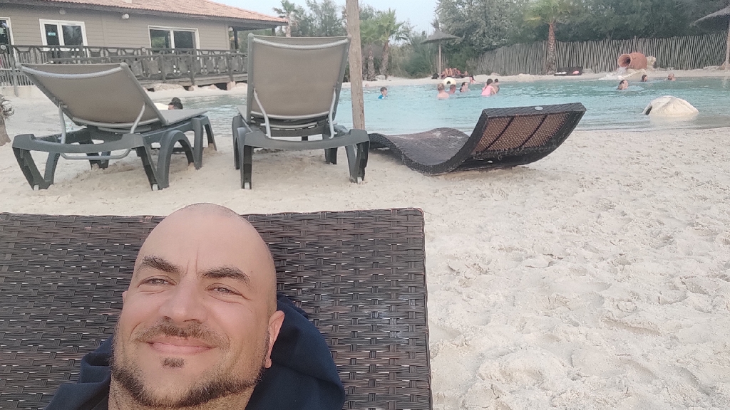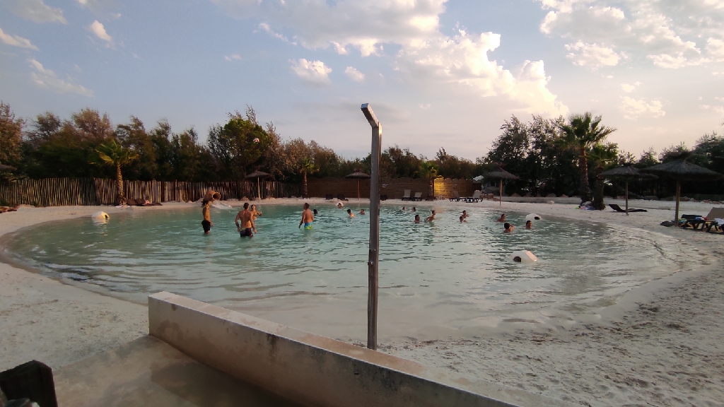 Rozbiłem namiot w ekspresowym tempie. Przywitałem się głośno z sąsiednimi namiociarzami i domkowcami. Oczywiście nikt nie zagadał, ich miny sprawiały raczej wrażenie „a co tu ten dziwoląg spocony robi?”. Wykąpałem się pod prysznicem i poszedłem na basen. Jakież było moje zdziwienie, gdy zobaczyłem okrągłą nieckę basenową wypełnioną piaskiem i jakby plażę wysypaną piaskiem dookoła. Kilkanaście osób moczyło się w środku. Położyłem więc ręcznik z ciuchami i schowanymi pod nimi telefonem i portfelem i wszedłem do wody. Płytko. Idę w kierunku środka. Okazało się, że basen jest dość płytki. Żeby zanurzyć głowę, muszę paść na kolana (hahaha).