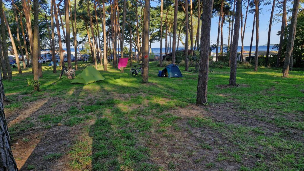 Spanie na dziko w Niemczech nie jest tak proste jak w Skandynawii, bo może skutkować nieprzewidzianymi opłatami, czyli mandatem. Generalnie Niemcy z racji swojego zamiłowania do porządku, chętniej poinformują policję, że „jacyś obcy na rowerach rozbili namioty pod lasem” czy gdzieś. A w Niemczech w każdym landzie (jak u nas województwa) są inne przepisy regulujące spanie na dziko. Generalnie spanie na dziko bardziej jest zabronione niż dozwolone. Z perspektywy przeciętnego Niemca w ogóle pytanie „czy możemy rozbić namioty na jedną noc na Pana polu, albo w ogródku” najczęściej skutkuje odpowiedzią – „ale po co? 30 kilometrów dalej jest kemping!” Także nie chcąc tracić czasu na szukanie miejsca w trybie „niewidzialni” ani ryzykować, że ktoś na nas doniesie i będziemy musieli się gdzieś tułać po nocy, postawiliśmy na pewność noclegu na kempingu.