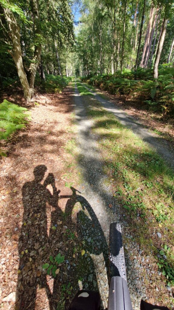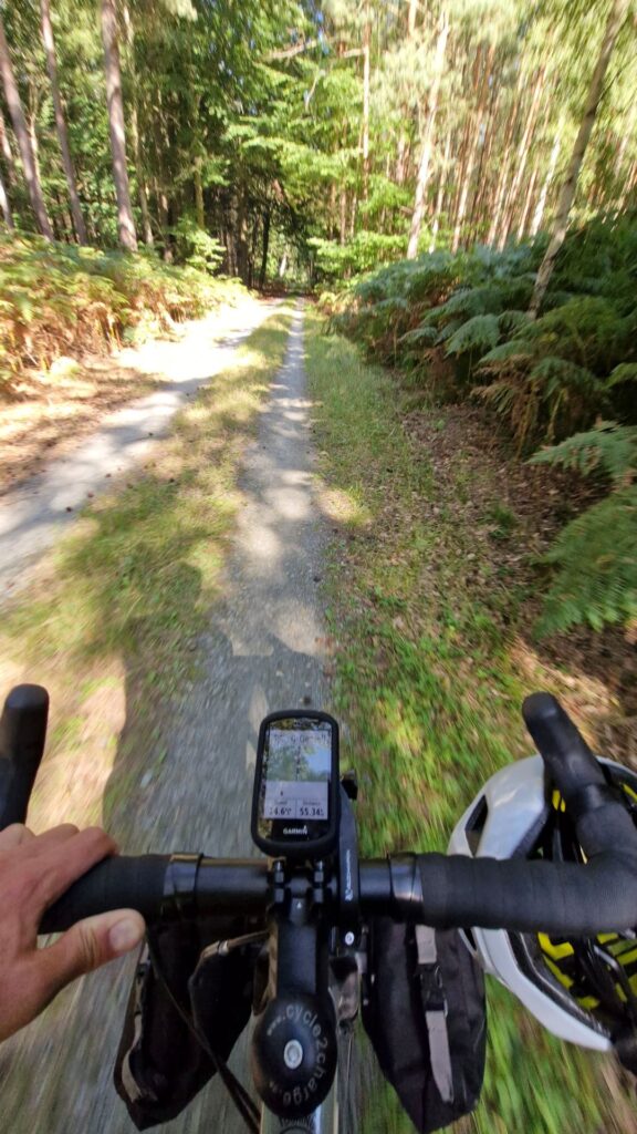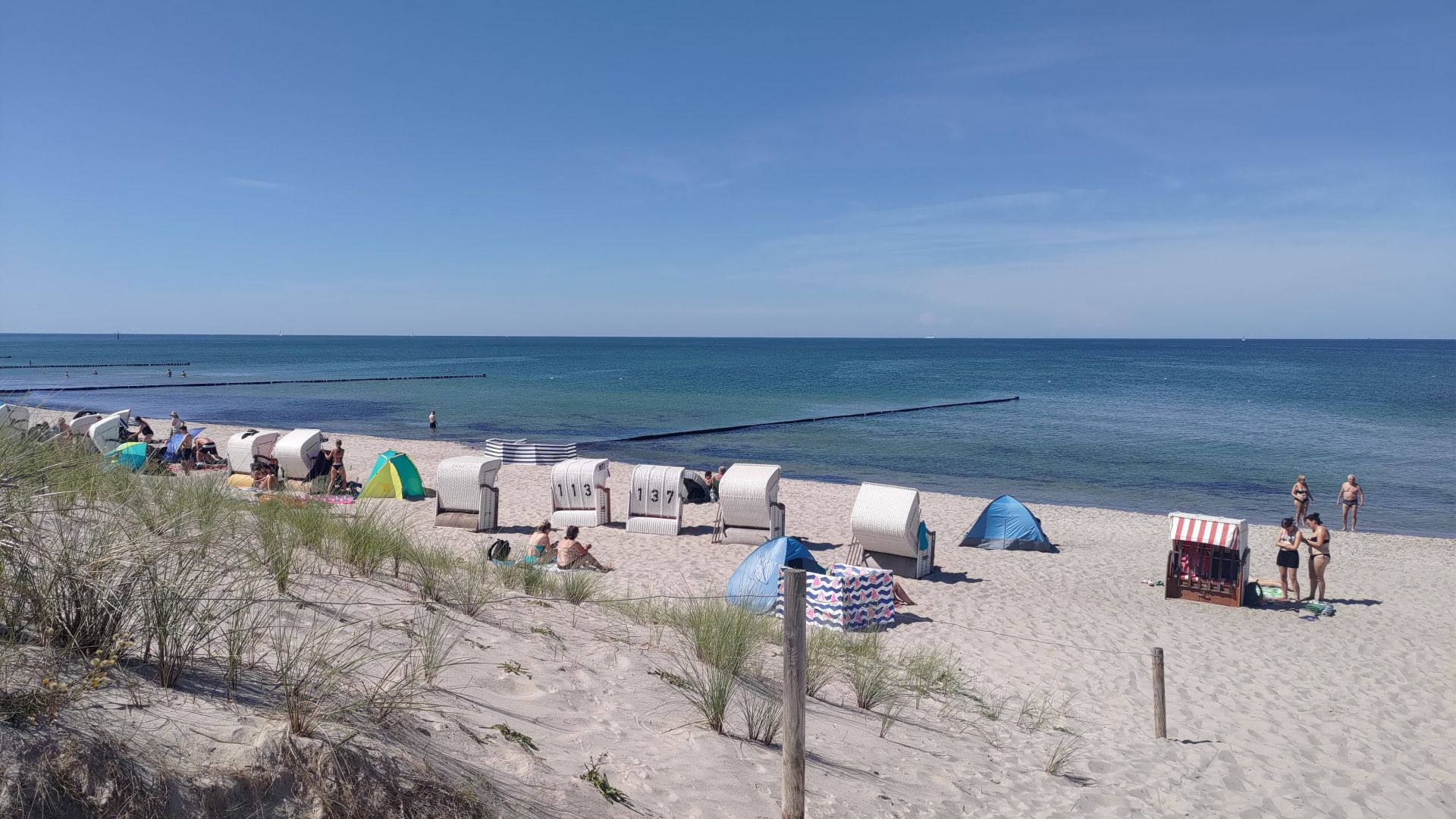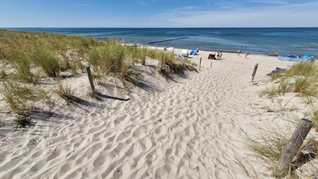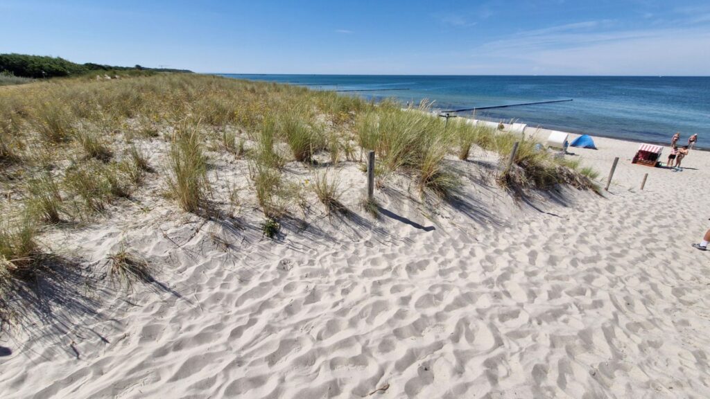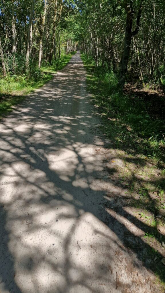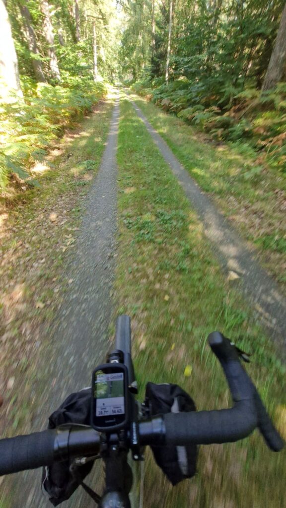 Za Rostock droga którą jechaliśmy wiodła przez lasy wzdłuż wybrzeża. Czasem utwardzona ścieżka, czasem asfalt po wałach przeciwpowodziowych, bardzo przyjemnie. Ale to też dla mnie ciekawe – u nas wzdłuż wybrzeża gdy jechałem dwa lata temu i wcześniej, nie widziałem, by były wały powodziowe wzdłuż wybrzeża. Tutaj są. Zachodzę w głowę, w jakim celu? Ta ścieżka pieszo-rowerowa po wale była łudząco podobna do szlaku Odra-Nysa, którym to szlakiem jechałem dwa lata temu wzdłuż granicy polsko-niemieckiej. Z tą różnicą, że tutaj o wiele więcej było ludzi. I to nie tylko pieszych, ale też rowerzystów. Głównie emerytów, jak sądzę po ich wieku. Co chwilę przez tą ścieżkę przechodzili ludzie z tobołami, leżakami i lodówkami turystycznymi na plażę i z plaży. Nie dało się więc jechać zbyt szybko, bo ruch na to nie pozwalał. Gdy jednak szlak zmienił się z ścieżkę przez las, zrobiło się luźniej i przyjemniej. Dzisiaj bowiem było naprawdę ciepło, by nie rzec, że gorąco! Słońce piekło, więc cień lasu był co najmniej pożądany.