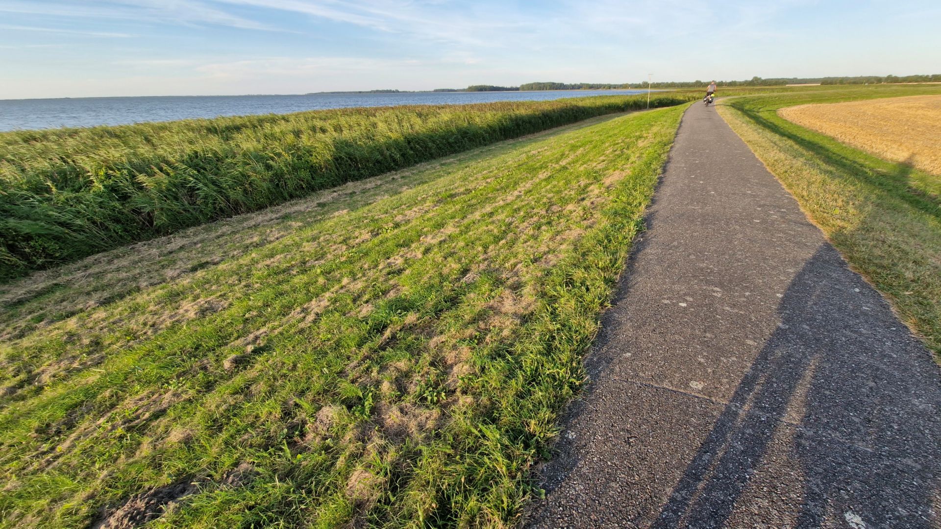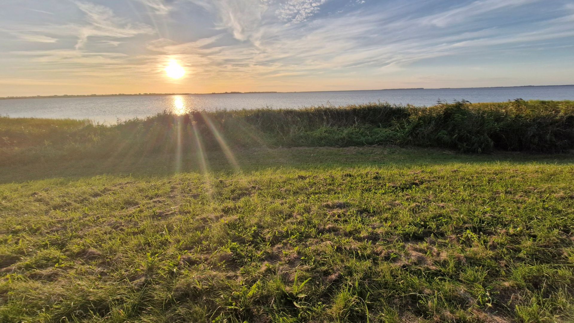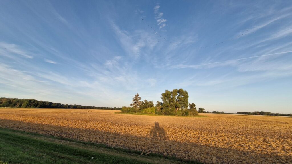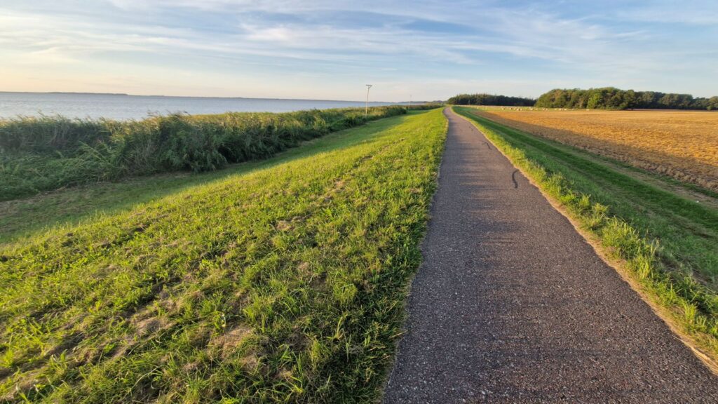 Słońce pomału zaczęło zachodzić, a my jechaliśmy przez płaskie, otwarte przestrzenie wygodnymi ścieżkami rowerowymi po lewej mając zatokę Barther Bodden a po prawej łąki, pola uprawne. Wiatr już nam nie przeszkadzał, mimo że nie zelżał, gnaliśmy do celu. Minęliśmy rezerwat ptaków i Opcio wypatrzył klucze najprawdopodobniej kaczek, czy gęsi. Dojeżdżaliśmy do Prohn.