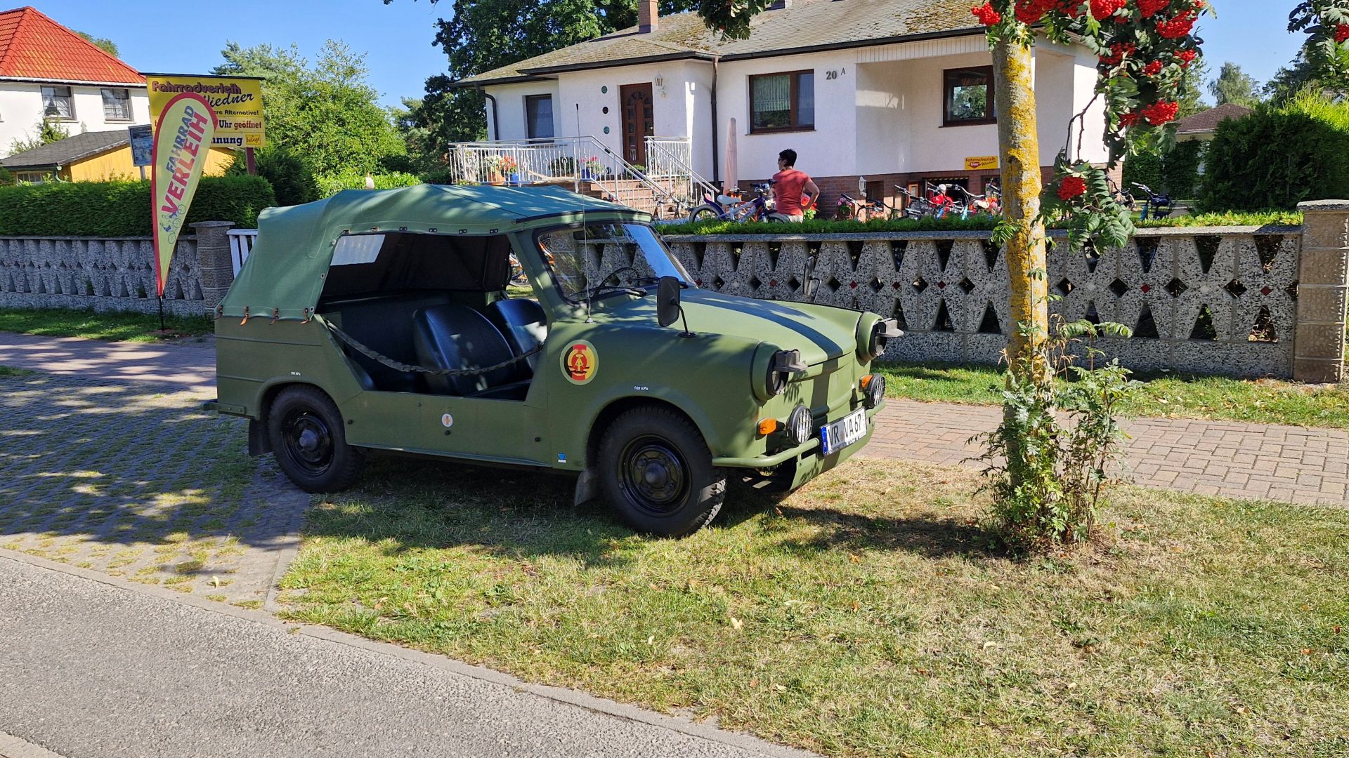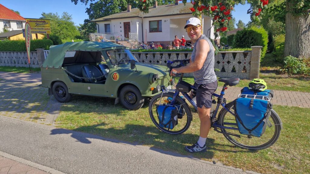 Przy trasie zauważyłem noclegi w prywatnym domu. Zatrzymaliśmy się chcąc sprawdzić, czy byłaby opcja spania pod dachem. Niestety nie. Właściciel – koło trzydziestki, hodowca psów, ogromnych pitbulli próbował nam pomóc zagłuszany przez szczekające i groźnie wyglądające przez okno psy. Powiedział, że w centrum Prohn jest gościniec, „Gasthaus Zur Kurve” i może tam? Ruszyliśmy w tym kierunku. Na skrzyżowaniu dróg sprawdziliśmy jednak, że opinie są bardzo słabe, a i nazwa nam Polakom jakoś tak nieszczególnie dobrze się kojarzy, więc jednak pojechaliśmy na kemping.