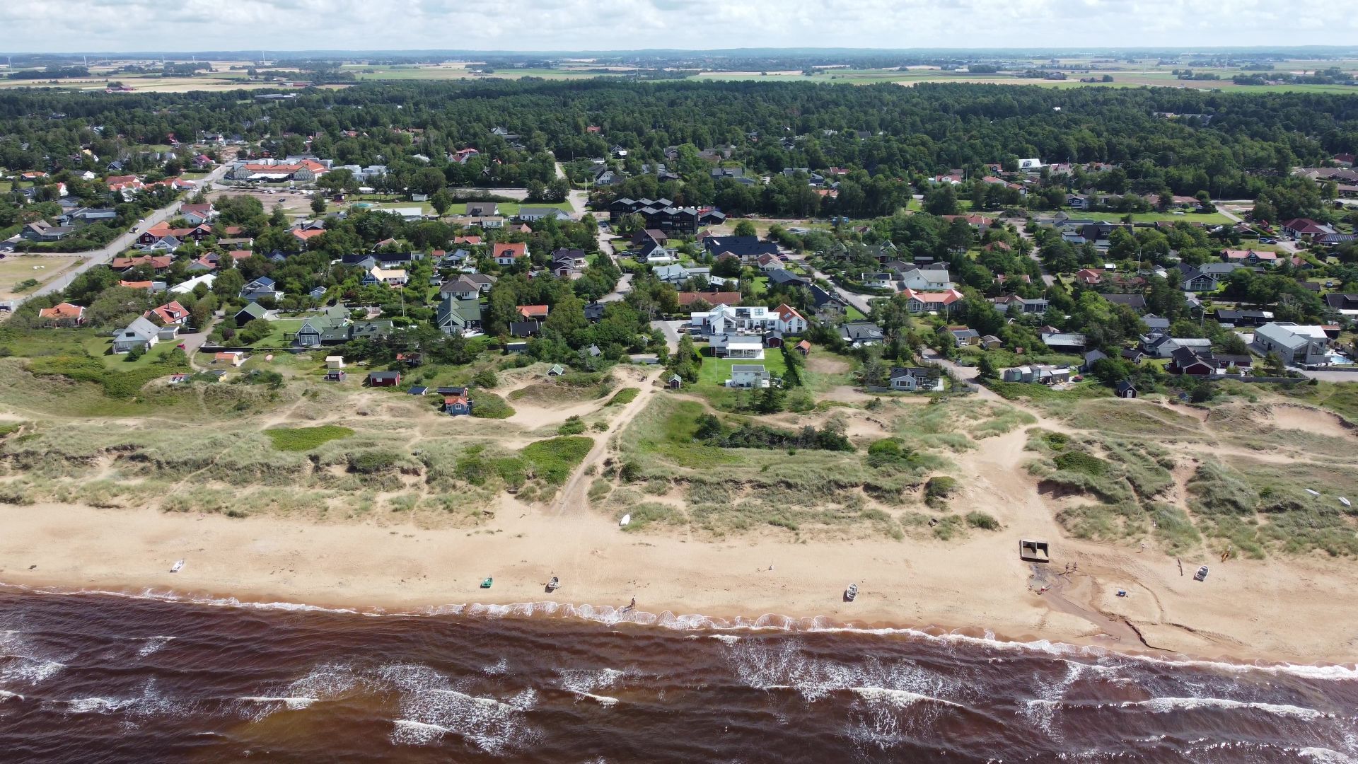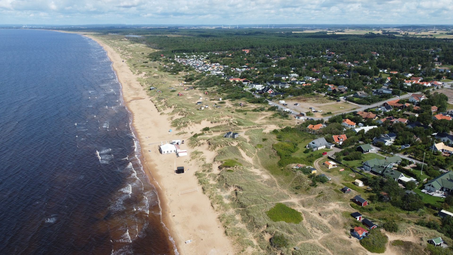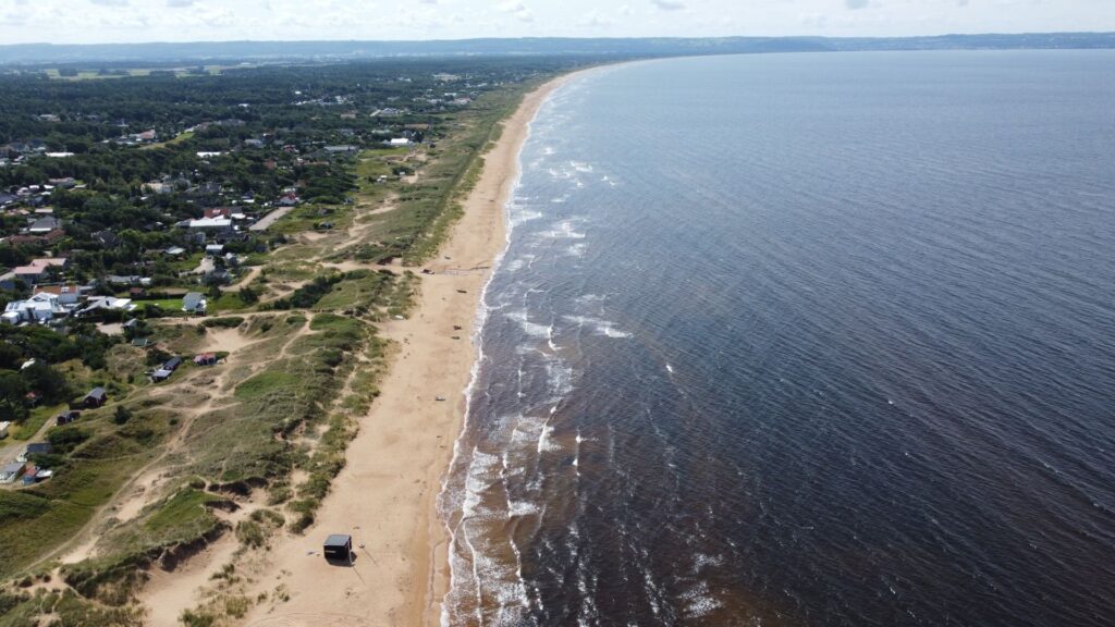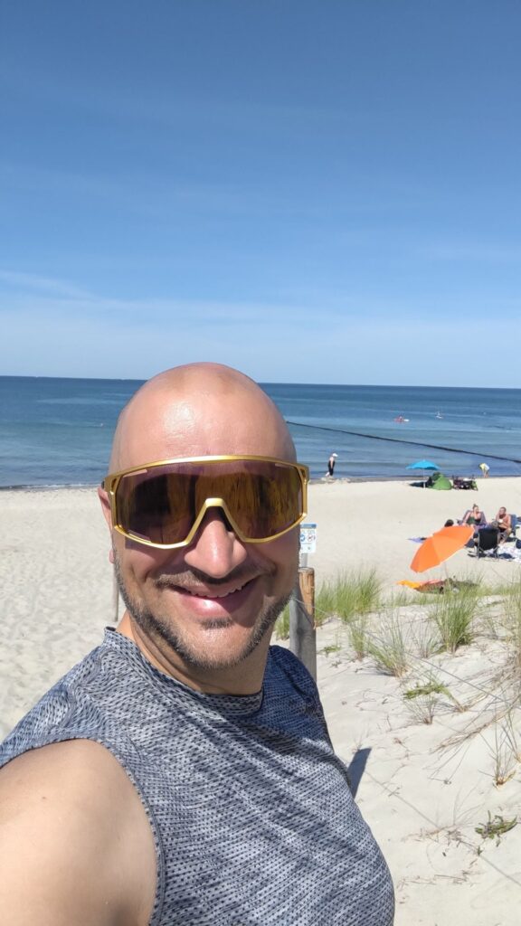 Oj kusiła pogoda, by stanąć na chwilę i wykąpać się w morzu, kusiła! Niestety nie mieliśmy wystarczająco czasu na relaks w wodzie. Mimo to przystanęliśmy na trasie na chwilę, bym mógł wypuścić na chwilę chociaż dronka – Bronka. Bronisław dzielnie walczył z dość silnym wiatrem i udało mu się coś ponagrywać. W perspektywy dronka łatwiej było dostrzec, że wzdłuż wybrzeża bardzo dużo jest takich malutkich drewnianych domków. Są one w pasie pomiędzy większymi domami a wydmami i plażami. Z tego co się zorientowałem, to po prostu takie domki, żeby można było przyjść z plaży, odpocząć od słońca, przebrać się, czy schować akcesoria plażowe. Morze, plaża, wydmy – wszystko to wygląda zupełnie tak samo, jak u nas w Polsce. Coś czuję, że kiedyś przyjadę tu na wakacje. A dlaczego tutaj a nie w Polsce? Bo mniej ludzi, nie ma parawanów, a przynajmniej nie ma ich tyle, co w Polsce i jakoś tak porządek większy, mniej takiej bazarowej przaśności, hałasu, spokojniej. Chciałbym się przekonać, czy pierwsze wrażenie jest słuszne, czy to tylko pozory.