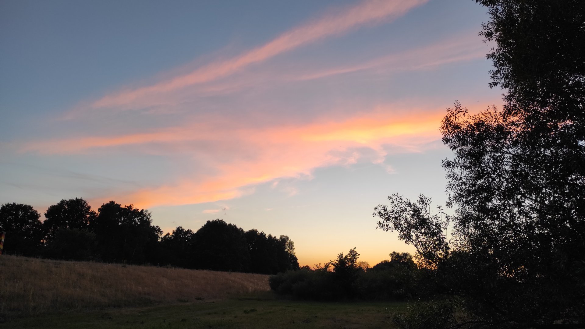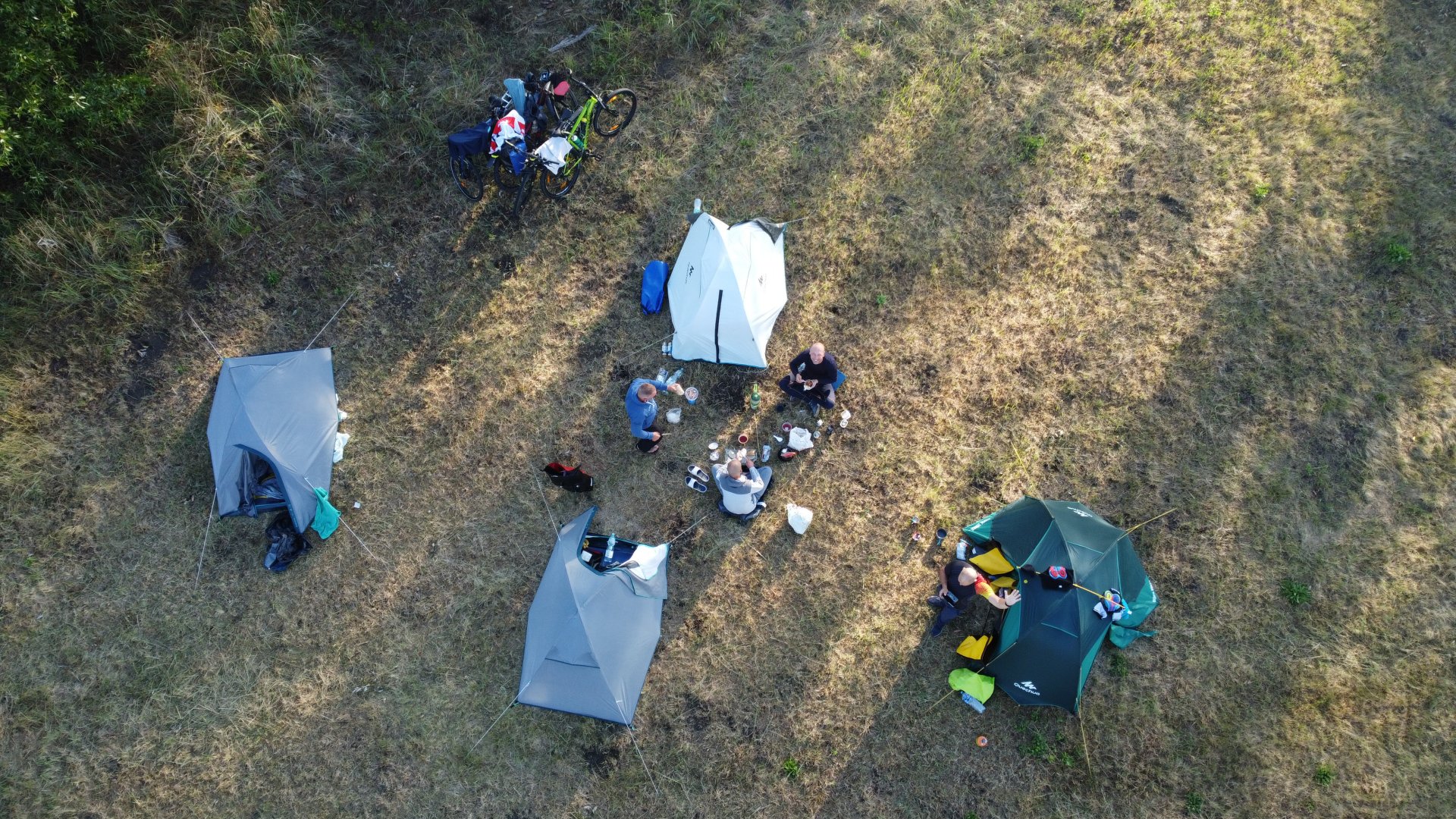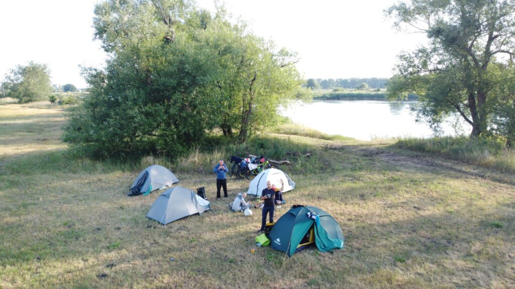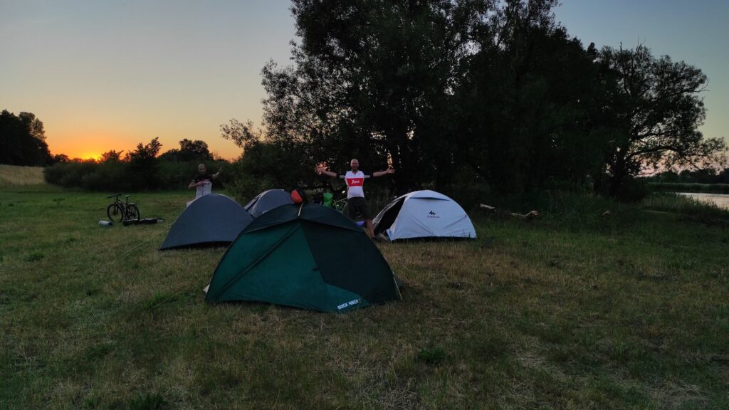 Ciężko się jechało z pełnymi brzuchami zwłaszcza, że pojawiły się spore podjazdy. Po krótkim kryzysie jednak rozkręciliśmy się i dojechaliśmy późno, ale jednak na miejsce wytypowane na biwakowanie na dziko. Słońce już chowało się nieśpiesznie za horyzontem, ale udało nam się rozłożyć namioty i rozpakować przed jego zachodem.