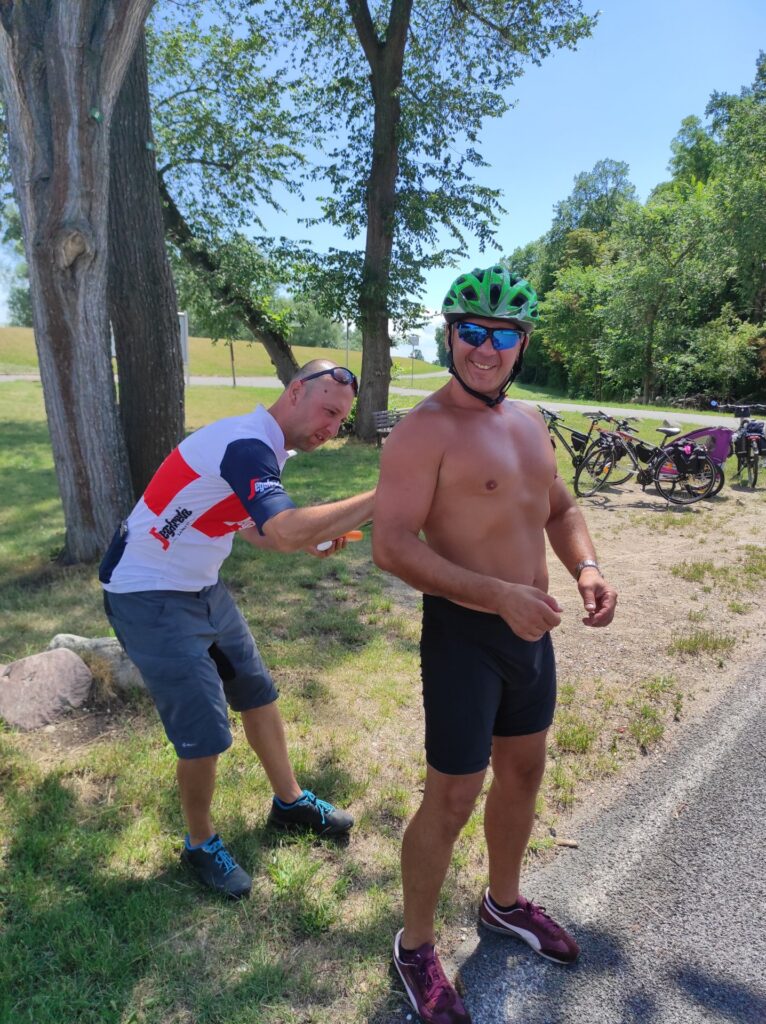 Dzisiaj było o tyle lepiej, że co około 10-15km wzdłuż trasy były miejsca gdzie mogliśmy usiąść, odsapnąć, napić się coś zimnego. Zimnego, spytacie? Tak – bo znowu zaczęło nas smażyć słońce.