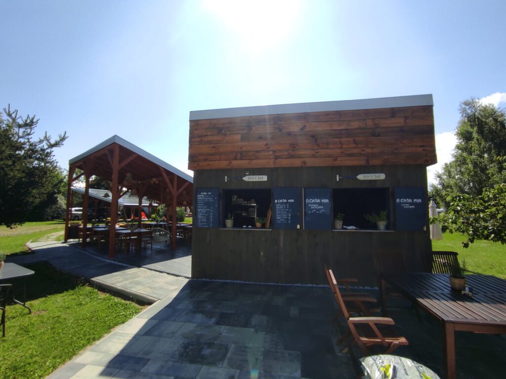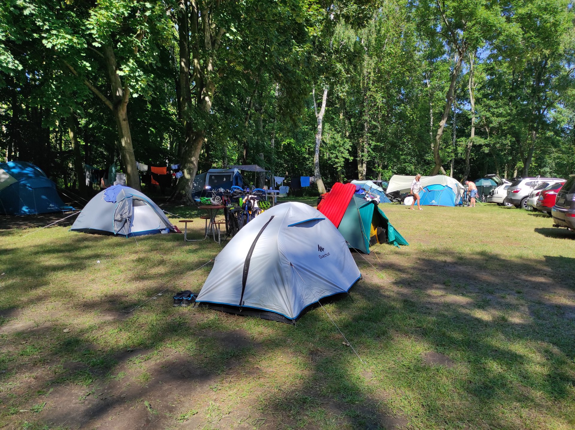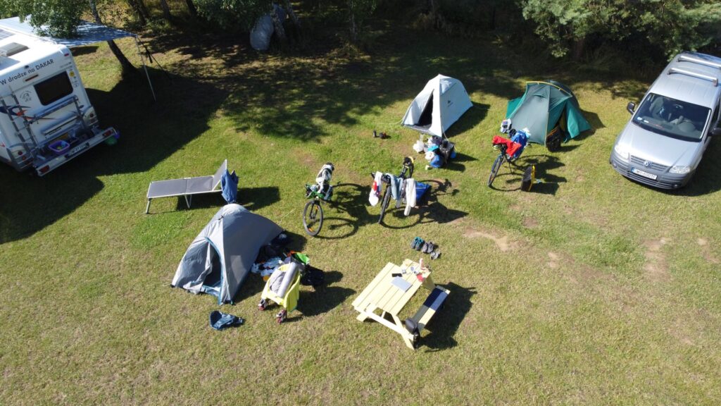 Wstałem trochę później niż Chłopaki. Może dlatego, że oni są przyzwyczajeni wstawać wcześnie do pracy. Dla mnie wstawanie o 6 rano, to raczej wyjątek niż reguła. Namioty wilgotne. Dobrze że łazienki z prysznicami i ciepła wodą wygodne, czyste i nowe. Ten rodzinny kemping mogę spokojnie polecić. Jest przy szlaku EuroVelo R10 i poza serdecznymi właścicielami ma wszystko co potrzeba łącznie z pralką i punktami prądowymi. Czysto, podłoże równe. Super!