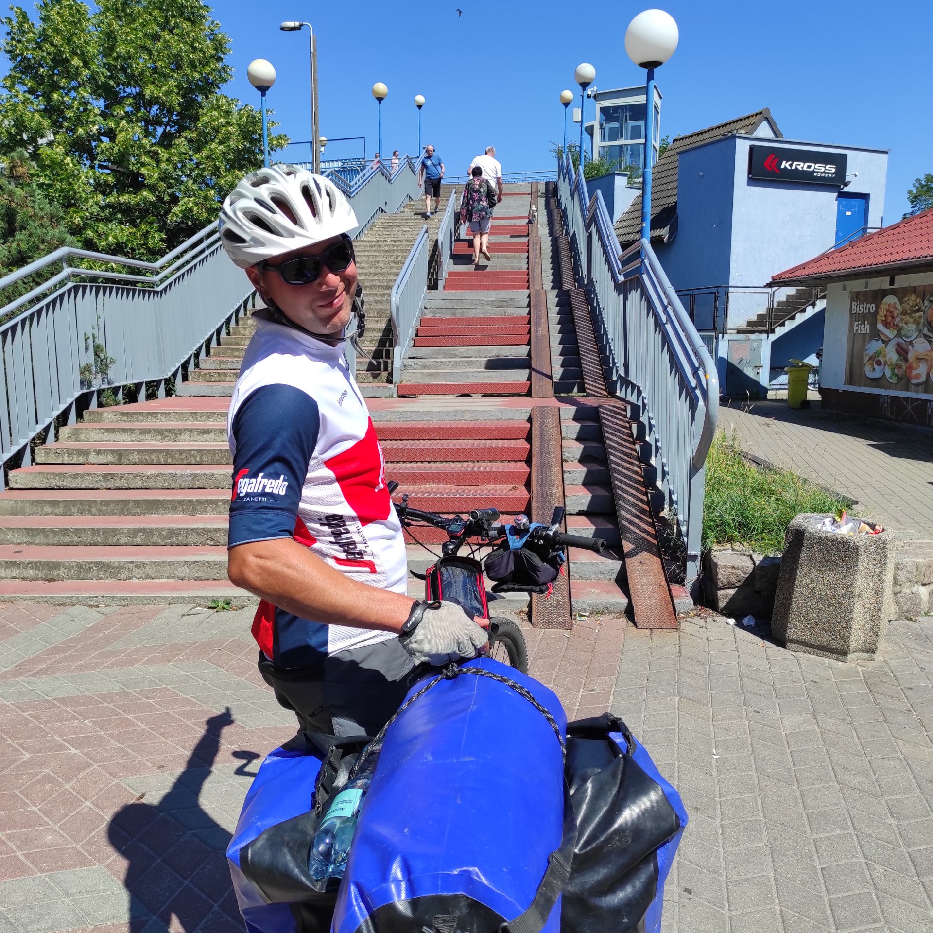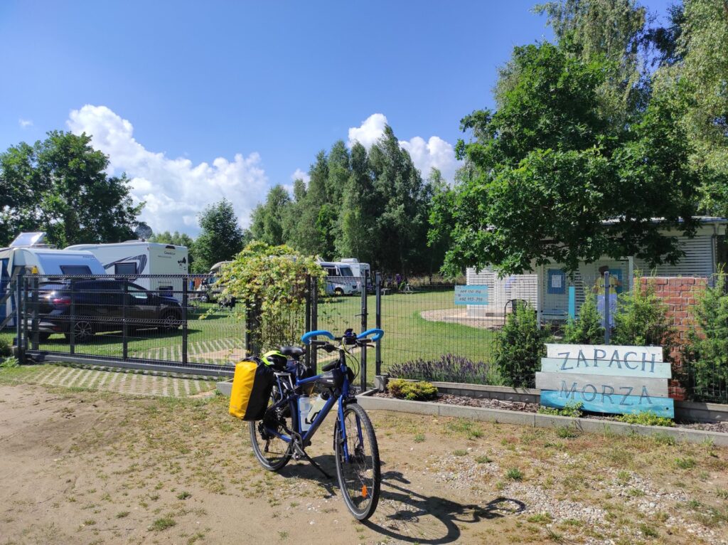 Żelu zadzwonił na kemping który znał w Kołobrzegu. Mieliśmy więc pewność miejsca. Jechaliśmy tam i dostrzegłem baner, że Kołobrzeg stara się o tytuł rowerowej stolicy Polski… No to musi się jeszcze bardziej postarać, bo dwa razy na krawężnikach najazdowych na ścieżce rowerowej tak podskoczyłem, że mi się sakwa wypięła. Raz całkowicie, a raz utrzymała się na jednym haku. Oprócz tego by wjechać na kładkę nad torami, nie można skorzystać z windy, a trzeba pchać rowery po najazdach dla wózków. Niby nic, no ale w stolicy rowerowej Polski, to raczej nie wypada…