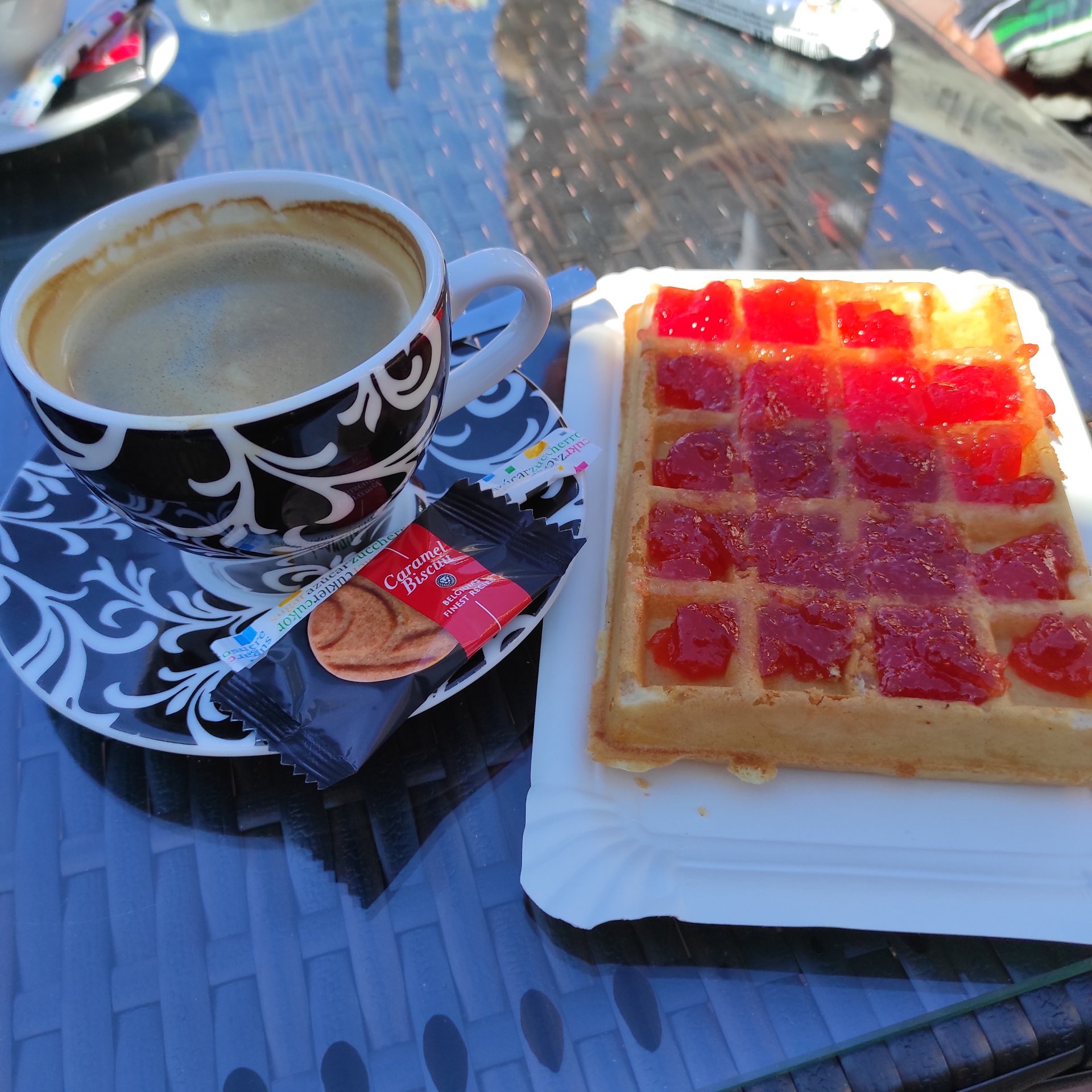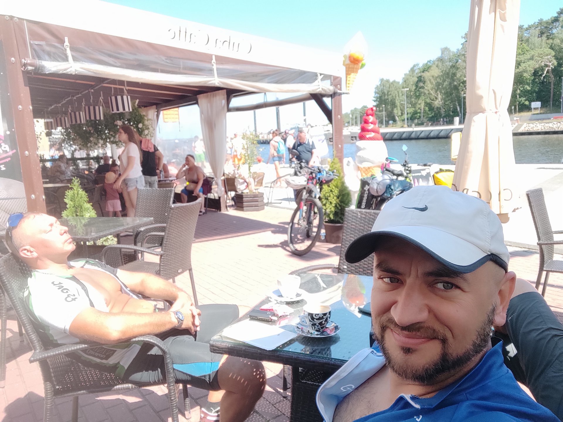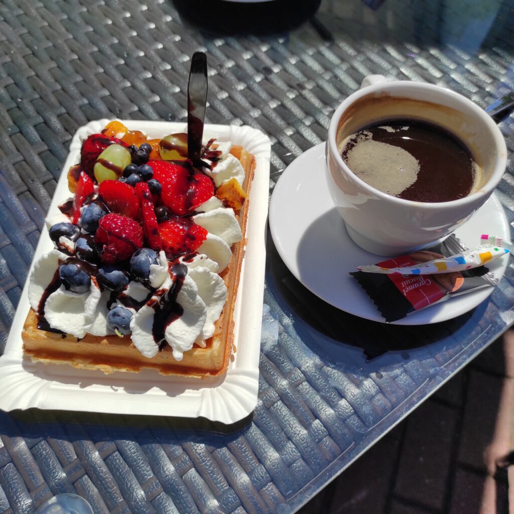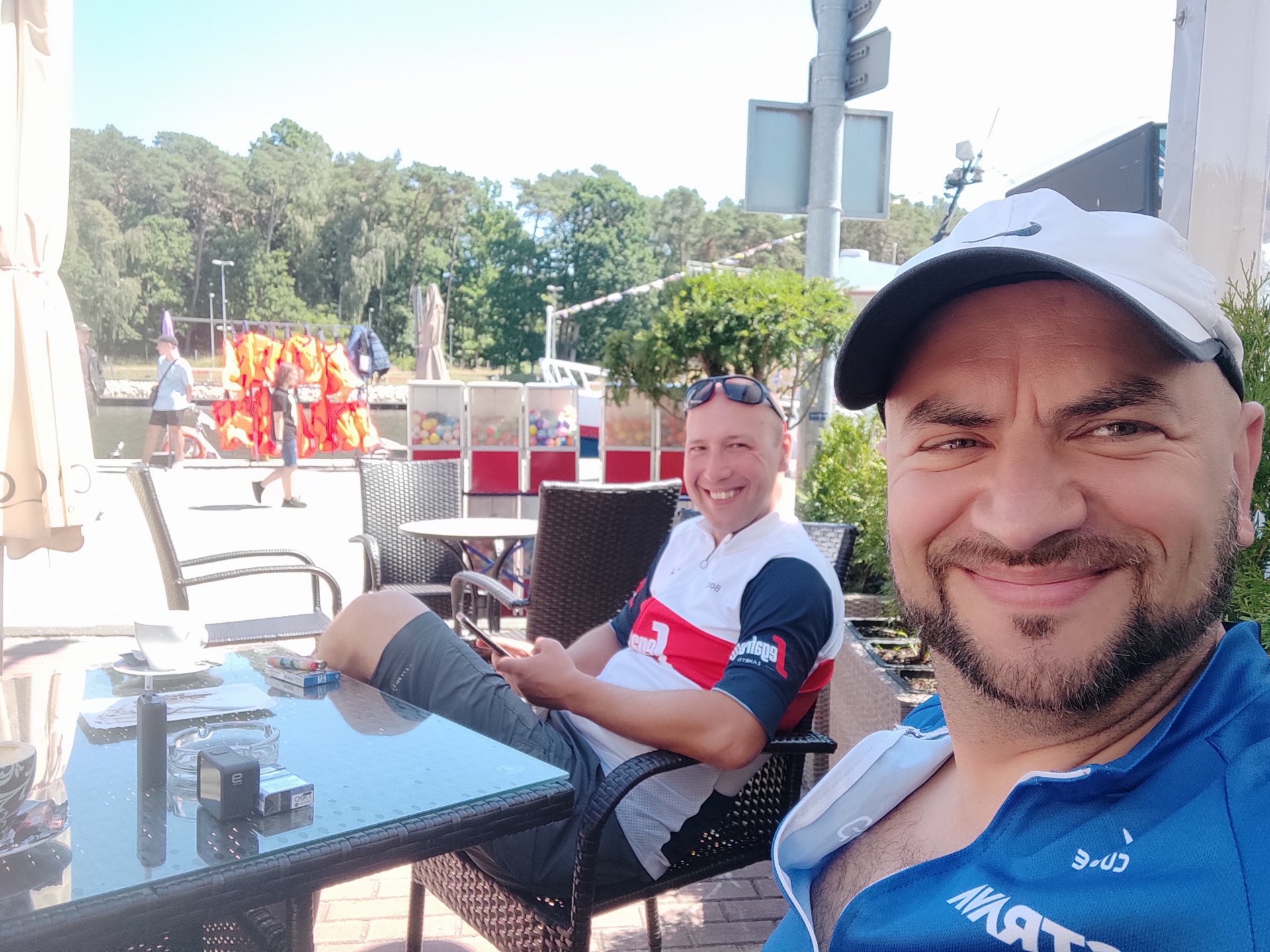 Ani się zorientowaliśmy, a przejechaliśmy przez las i stanęliśmy w Mrzeżynie na kawę i gofry. Nie ma pośpiechu. Celebrujemy piękną pogodę, dobre towarzystwo i to że mamy czas i możliwości.
