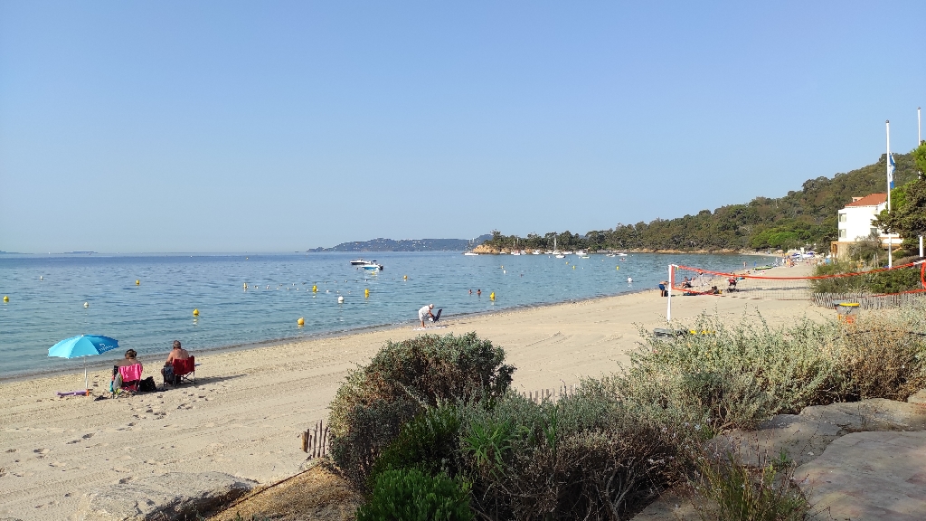 Między Cavalaire-Sur-Mer a Le Lavandou dostrzegłem otwarty sklepik. Było kilka minut po 9. Kupiłem świeże bagietki, salami Rosette, sery żółte w plastrach, pomidory, jogurty i dużo picia. Usiadłem na ławeczce nieopodal z widokiem na plażę i zacząłem sobie przygotowywać śniadanie. Plaża prawie pusta. Dosłownie trzy rodziny rozstawiały swoje koce, parasole, dmuchały zabawki dla dzieci. Obserwowałem to z uśmiechem. Spora różnica między tym co widzę tutaj a tym co się dzieje w Polsce nad morzem. Cinek zrobił zdjęcie ze swojego wypoczynku nad morzem w Polsce, że jest „po staremu”. Najlepiej koło 6 przyjść, rozstawić parawany, przyklejać tym samym najlepsze miejsce, bo później będzie krucho. Tutaj we Francji tego nie ma. Nawet parawan widziałem dopiero później po raz pierwszy. I to dosłownie raz, bo wiał mocny wiatr i parawan ten miał uzasadnienie pełne.