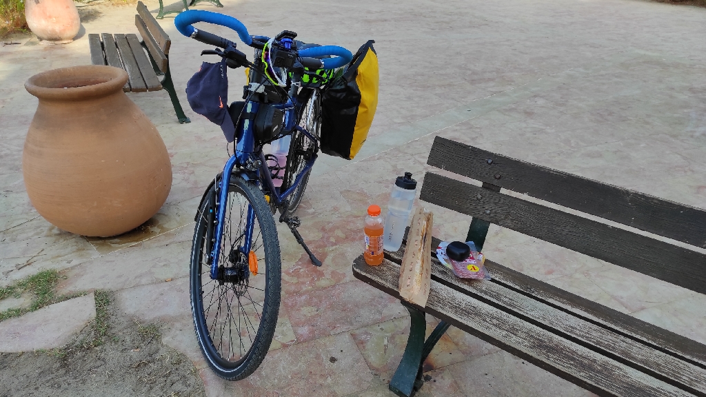Początek, jak zwykle ostatnio, zaczyna mi się od podjazdów. Humor poprawia jednak wschodzące słońce pięknie oświetlając za mną pagórkowate brzegi morza. Zatoczki porośnięte coraz bardziej karłowatą roślinnością. Im dalej kieruję się na zachód, tym większe zmiany w roślinności się pojawiają. Tak jakby było coraz bardziej pustynnie. Więcej przestrzeni skalistej, nieporośniętej roślinnością. Wyschnięte kanały, koryta rzek. Sucho. Tabliczki z ostrzeżeniem o ryzyku zaprószenia ognia. I słońce. Grzeje jak cholera! Do godziny 10 jest znośnie, ale później już jest ostro! Wyjdziesz z cienia i momentalnie czujesz uderzenie gorąca. Jakbyś wszedł do nagrzanej do czerwoności sauny! Ale trzeba jechać. Przekuwać godziny na kilometry i jechać. Jak jedziesz ponad 17 km/h to wtedy czujesz, że słońce praży skórę, ale pęd powietrza powoduje delikatne chłodzenie. W efekcie mam wrażenie że się nie pocę. A przynajmniej jak się zatrzymam nie w cieniu, to w ciągu 2 minut mam całe ręce mokre od potu. Wręcz czuję jak momentalnie ciało próbuje chronić się przed przegrzaniem. Jadę, to wtedy chłodzenie potem zastąpione jest przez chłodzenie powietrzem. To robi dużą różnicę. Idę mam więc wyjścia. Muszę cały czas jechać!