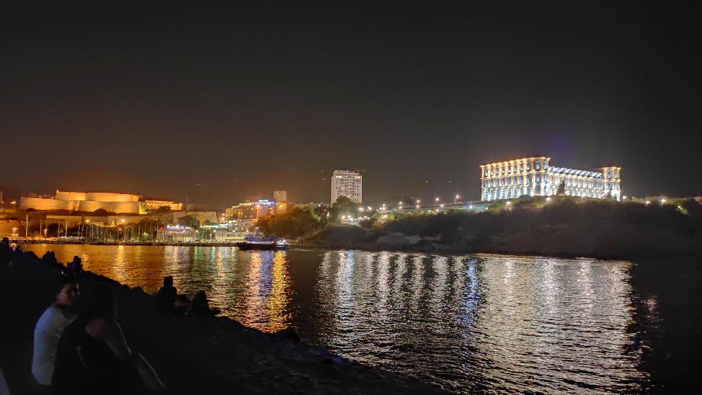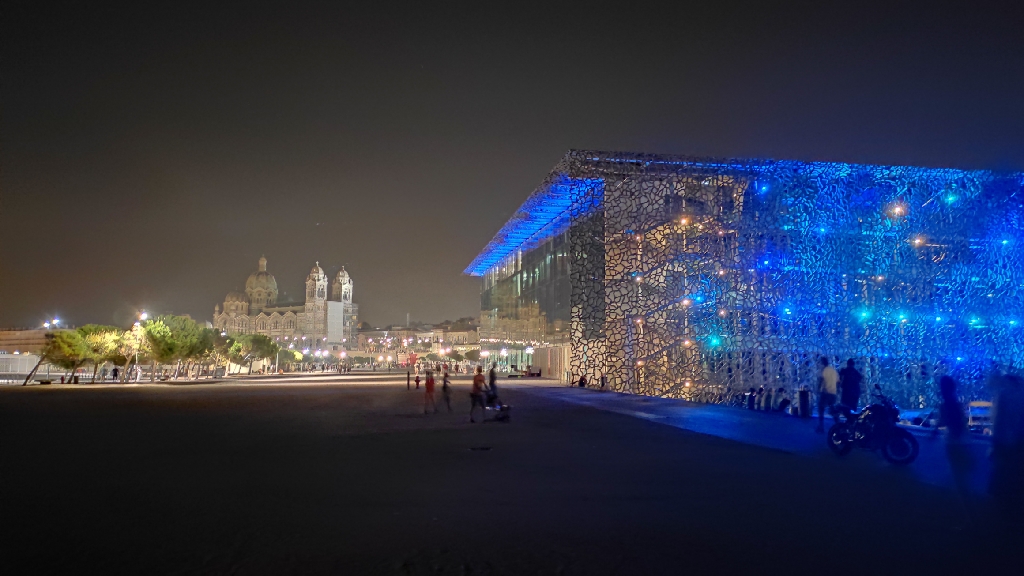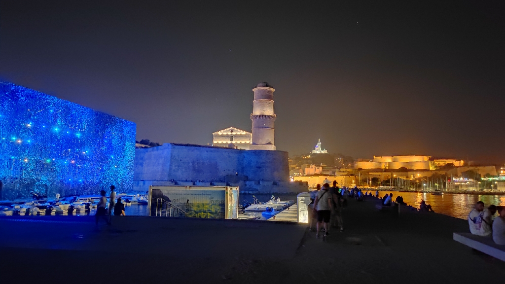 Pięknie podświetlone stare budowle Abbaye Saint-Victor, Bazyliki Notre Dame de la Garde na szczycie góry, na końcu portu na dole budynek Fort Saint-Nicolas i jeszcze Cathedrale La Major. Pomiędzy starymi budynkami od niedawna stoi jeszcze nowoczesny budynek Muzeum Cywilizacji Europejskiej i Śródziemnomorskiej. Zbudowano go w miejscu gdzie były niedawno jeszcze magazyny portowe. Teren dookoła tego muzeum wyłożony jest szutrem, więc jest sporo miejsca jeszcze na zagospodarowanie w przyszłości. Pięknie to wszystko razem wygląda nocą, podświetlone różnokolorowymi iluminacjami!