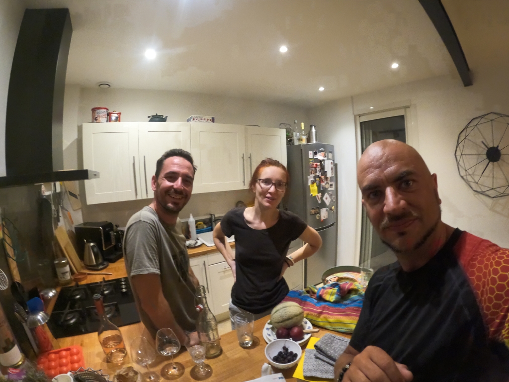 W Marsylii całkiem sporo górek, więc i podjazdów trochę musiałem zrobić, aż w końcu udało mi się trafić do moich Gospodarzy. Zadzwoniłem domofonem i pojawili się na dole. Pomogli mi schować rower w schowku na parterze i poszliśmy na piętro do ich mieszkania. Bardzo miło ludzie! Mieszkanie w starej kamienicy urządzone ze smakiem. Mnóstwo regałów z książkami i komiksami, których wielkim fanem jest Christophe! Od razu złapaliśmy dobry kontakt i swobodnie rozmawialiśmy po angielsku. Gdy się odświeżyłem pod prysznicem, skoczyłem do sklepiku obok po winko do kolacji i jeszcze więcej picia, by uzupełnić straconą wodę. Zrobiłem pranie, korzystając z uprzejmości moich Gospodarzy. Później Christophe przygotował pyszną kolację podczas gdy z Celine rozmawialiśmy o mojej dalszej trasie, co warto a co nie. Krzysiu przygotował tagliatelle jak dla całego pułku wojska! Do tego pesto jego własnej roboty- przepyszne! Pomidorki, parmeńska szynka i jeszcze sporo innych rzeczy na stole. Popijając winko jedliśmy żywo dyskutując, jakbyśmy się znali od lat! Bardzo miła atmosfera, pełna otwartość, żywe zainteresowanie. Opowiedzieli mi o swoich planach, więc wiem, że jest naprawdę duża szansa, że pojawią się w Polsce i szczerze mam nadzieję, że zawitają do mnie! Bardzo będzie mi miło!