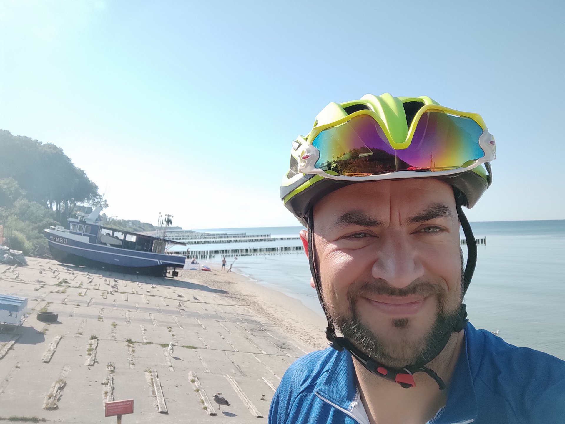Żeby wyjechać z Kołobrzegu musiałem się wrócić jak do kempingu z którego dopiero wyjechaliśmy, ale to nic. Dzisiaj wyjechałem wcześnie, pogoda sprzyjała, więc cała naprzód i byle dalej! Początkowo szlak wiedzie wzdłuż wybrzeża taką ścieżką pieszo-rowerową. Wąską, ale nie był to problem, bo o tej porze w niedzielę mało ludzi nią spaceruje. Jechało się dobrze. Równym dość szybkim tempem. Minąłem Sianożęty i zatrzymałem się na chwilkę w Ustroniu Morskim. Szukałem toalety, ale żadnej nie widziałem od dłuższego czasu. Owszem w Kołobrzegu były toi toi, ale to było jeszcze za wcześnie. A teraz robił się problem. Knajpy jeszcze pozamykane, więc jestem zdany na te publiczne toalety. Zatrzymałem się przy jednej w Ustroniu i sprawdzałem czy jest czynna? Zamknięta. Ale jakiś gościu wyjrzał zza bramy. Spytałem o toaletę gdzieś w pobliżu. „Dawaj Pan do środka. Knajpa jeszcze zamknięta, ale tutaj pan właź”. Oj uratował mi tym skórę! Nie wiedziałem bowiem ile jeszcze kilometrów, czy czasu przyjdzie mi trzymać. Dziwne to, że poza Kołobrzegiem w dalszych mniejszych miejscowościach toalet nie ma otwartych…