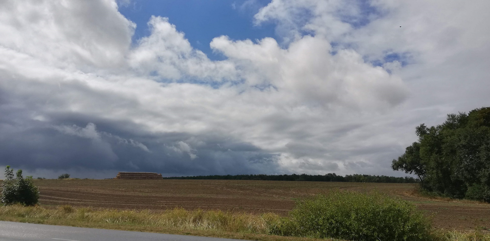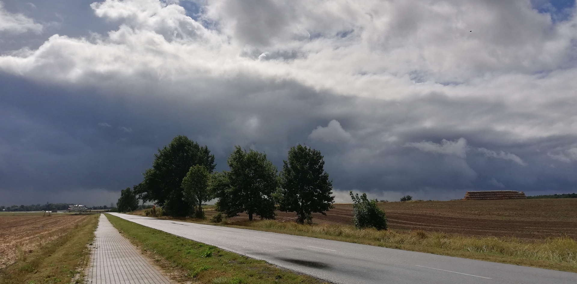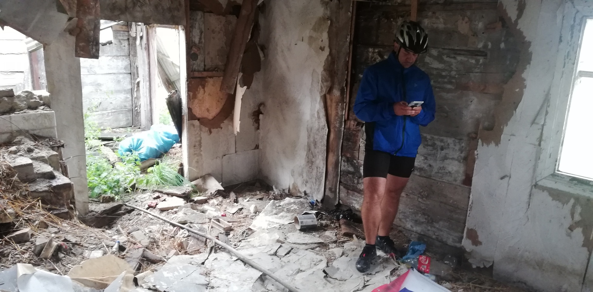 Ponad pół godziny czekaliśmy aż ulewa przejdzie. Wokół otwarte przestrzenie, pola po horyzont a ulewa gwałtowna, czasami jakaś błyskawica przeszyje niebo. Nierozsądnie jest w taki deszcz jechać rowerem przez takie pola. Dlatego tyle czekaliśmy. Gdy wreszcie zelżało, ruszyliśmy licząc na to że damy radę te parę kilometrów do Kodenia dojechać. Przejechaliśmy na pełnym gazie może 4 km i znowu to samo. Gorzej, że nie było widać nic poza zrujnowaną starą chatą z napisem z boku pod oknem „sprzedam” i jakiś nr telefonu. A ponieważ zaczęły nas smagać fale ściany deszczu, to nie zastanawiając się wiele zjechałem tutaj. Opał początkowo oponował, ale widząc co się dzieje, zrobił jak ja. Zostawiłem rower przed chatą i wszedłem do środka do izby która jeszcze miała fragment dachu. Musieliśmy tam przeczekać kolejne 0,5h. Dopiero wtedy się uspokoiło na tyle, że mogliśmy jechać dalej. Było zimniej i nadal wietrznie, ale przynajmniej nie padało. Musieliśmy docisnąć pedałami, chcąc dojechać we w miarę rozsądnej porze do Okuninki.