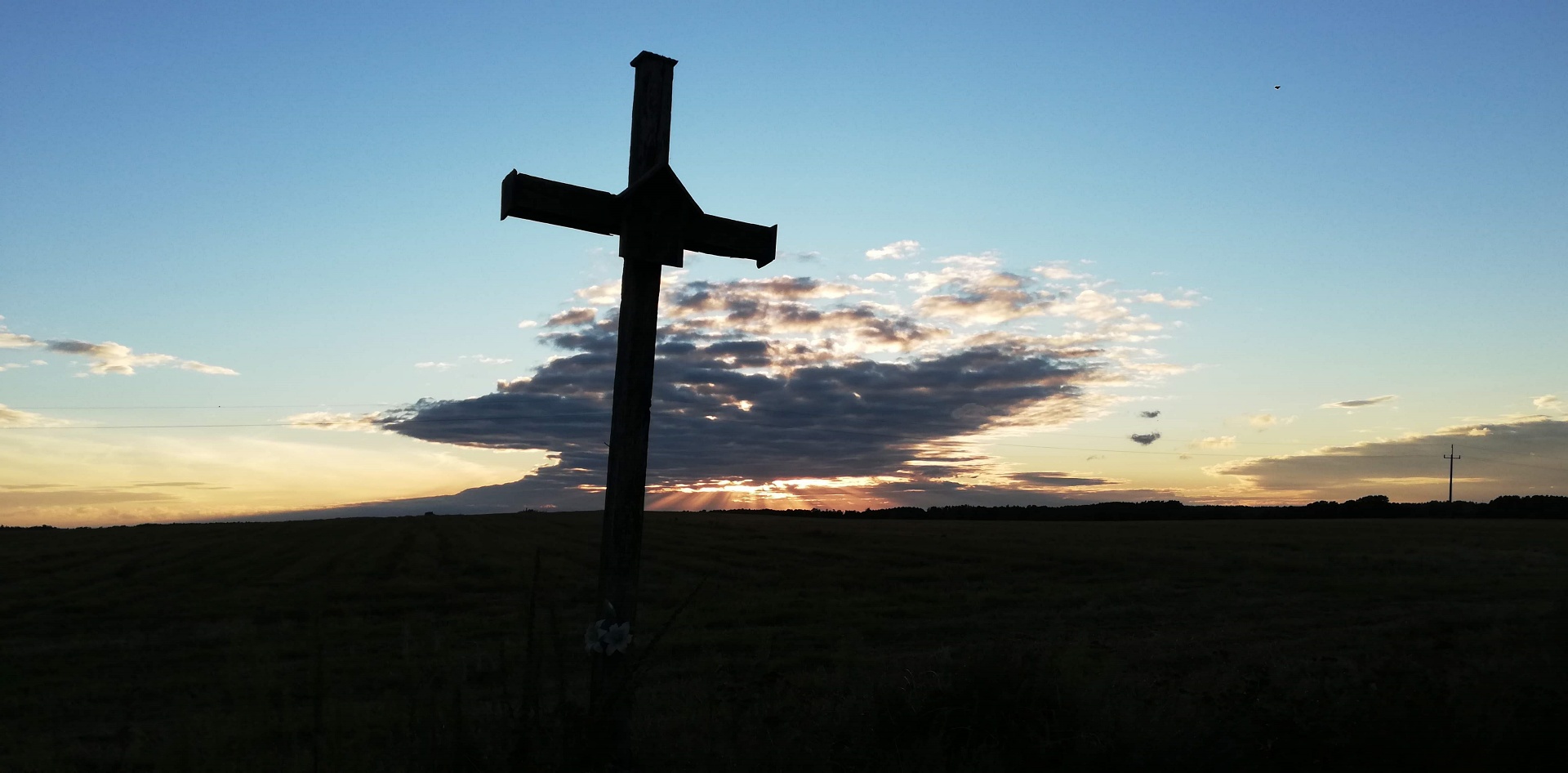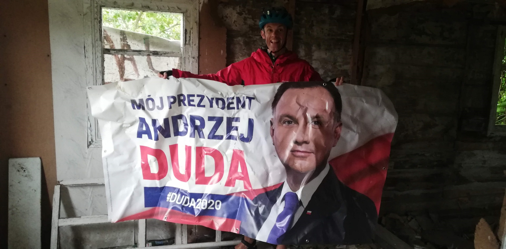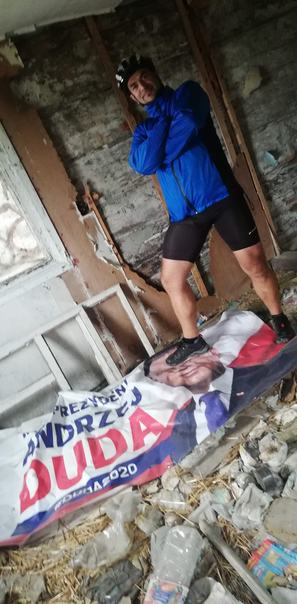 Ponad pół godziny czekaliśmy aż ulewa przejdzie. Wokół otwarte przestrzenie, pola po horyzont a ulewa gwałtowna, czasami jakaś błyskawica przeszyje niebo. Nierozsądnie jest w taki deszcz jechać rowerem przez takie pola. Dlatego tyle czekaliśmy. Gdy wreszcie zelżało, ruszyliśmy licząc na to że damy radę te parę kilometrów do Kodenia dojechać. Przejechaliśmy na pełnym gazie może 4 km i znowu to samo. Gorzej, że nie było widać nic poza zrujnowaną starą chatą z napisem z boku pod oknem „sprzedam” i jakiś nr telefonu. A ponieważ zaczęły nas smagać fale ściany deszczu, to nie zastanawiając się wiele zjechałem tutaj. Opał początkowo oponował, ale widząc co się dzieje, zrobił jak ja. Zostawiłem rower przed chatą i wszedłem do środka do izby która jeszcze miała fragment dachu. Musieliśmy tam przeczekać kolejne 0,5h. Dopiero wtedy się uspokoiło na tyle, że mogliśmy jechać dalej. Było zimniej i nadal wietrznie, ale przynajmniej nie padało. Musieliśmy docisnąć pedałami, chcąc dojechać we w miarę rozsądnej porze do Okuninki.