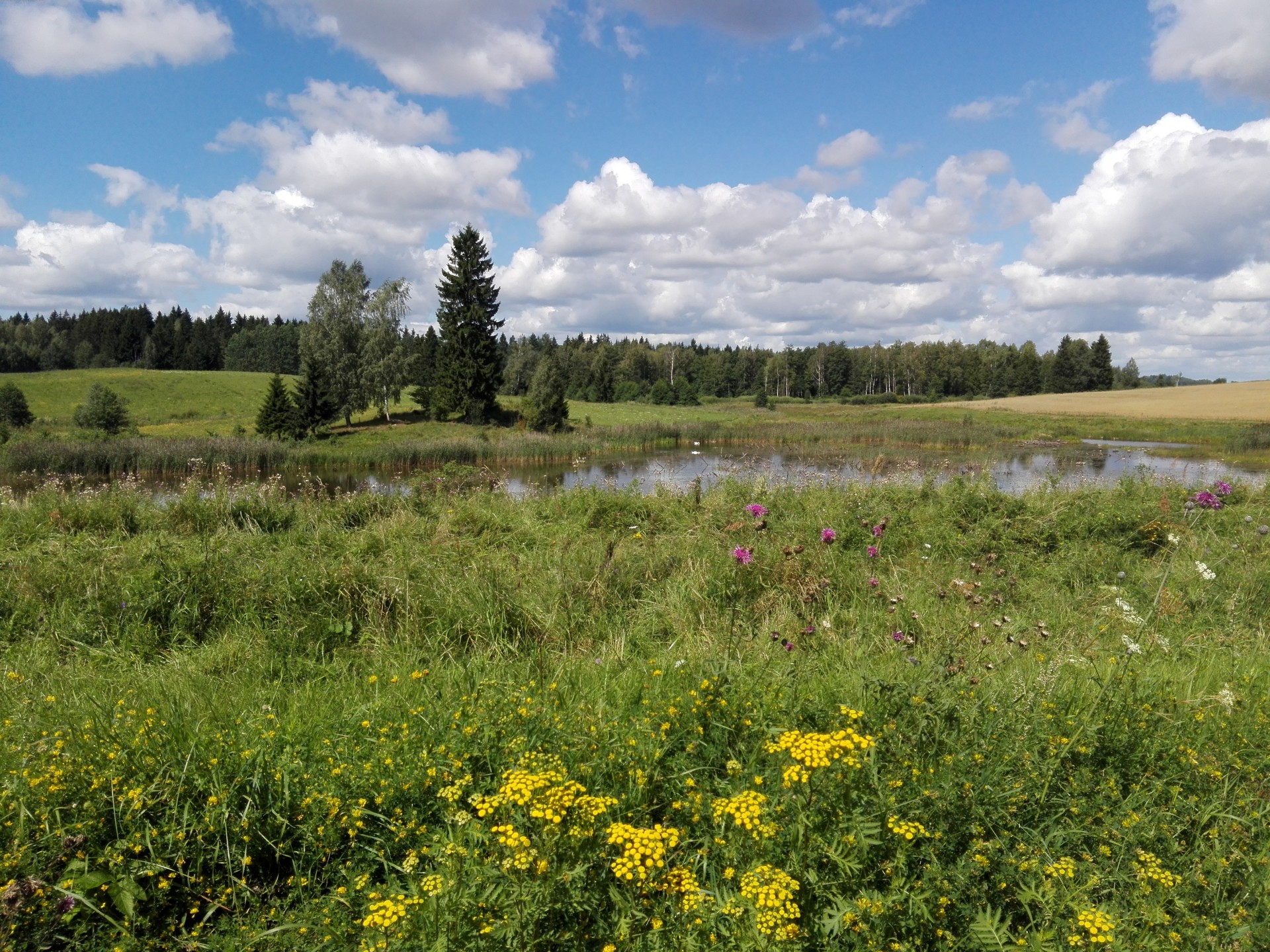 Tereny piękne. Z czasem zaczęło się pojawiać więcej bagienek z wystającymi konarami obumarłych drzew. Asfalt typu ulepianka przechodził w szutr- lekką tarkę. Spotkany na MOR turysta rowerowy podzielił się ze mną teorią, że tarka się sama tworzy, bo pod szutrem są te cholerne kocie łby. I podobno wskutek działania wody w naturalny sposób powstaje pofałdowanie. Hmmm… Tylko dlaczego w poprzek drogi, a nigdy w innym kierunku? Że niby po takiej mokrej nawierzchni jak przejedzie auto czy traktor, to te łby spod spodu powodują tworzenie się pofałdowania. Może i tak.