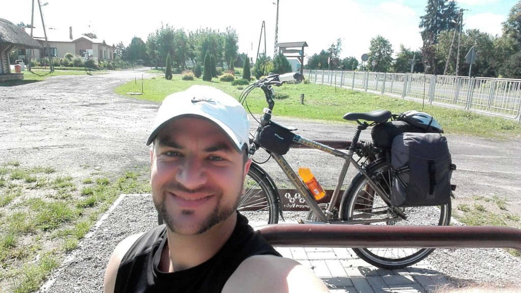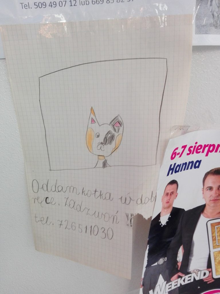 Postój na obiadek w Terespolu. Słońce świeci, lecz nie jest za gorąco, bo dość mocno wieje. A jak wieje, to widać na endomondo. Najczęściej mam pod wiatr, bo wieje z płn lub płn-zach. Jak mam boczny wiatr, to wtedy udaje mi się przyspieszyć. Dodatkowo dzisiaj nie forsuje kolan, więc dopiero niecałe 80 km za mną. Przy okazji – takie ogłoszenie zobaczyłem po drodze. Baardzo mi się spodobało. Może ktoś chce kotka? 🙂 Tylko w dobre ręce! No!