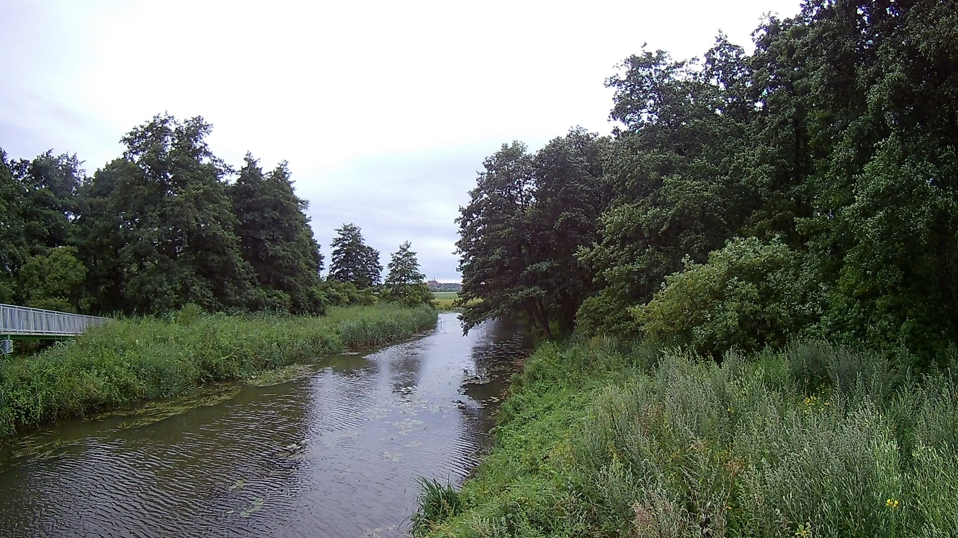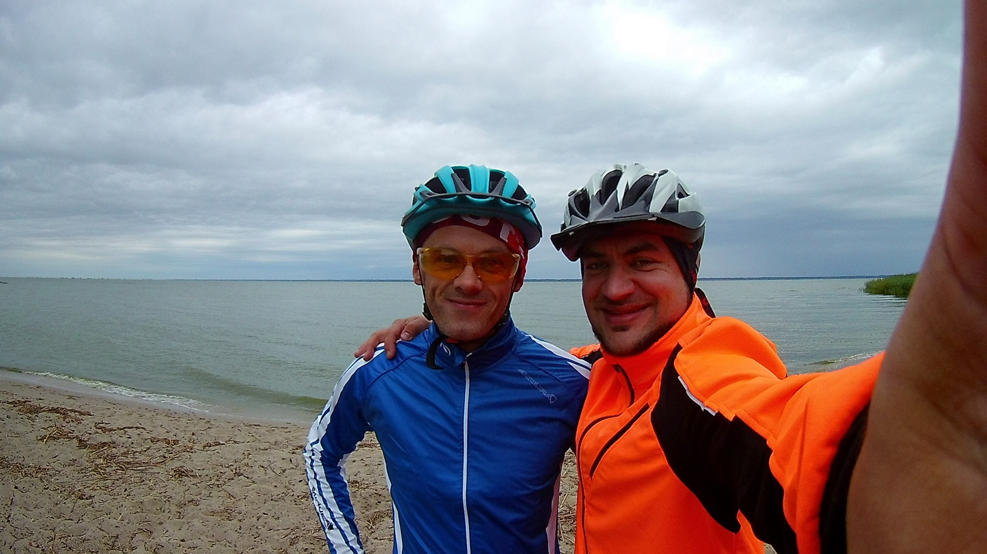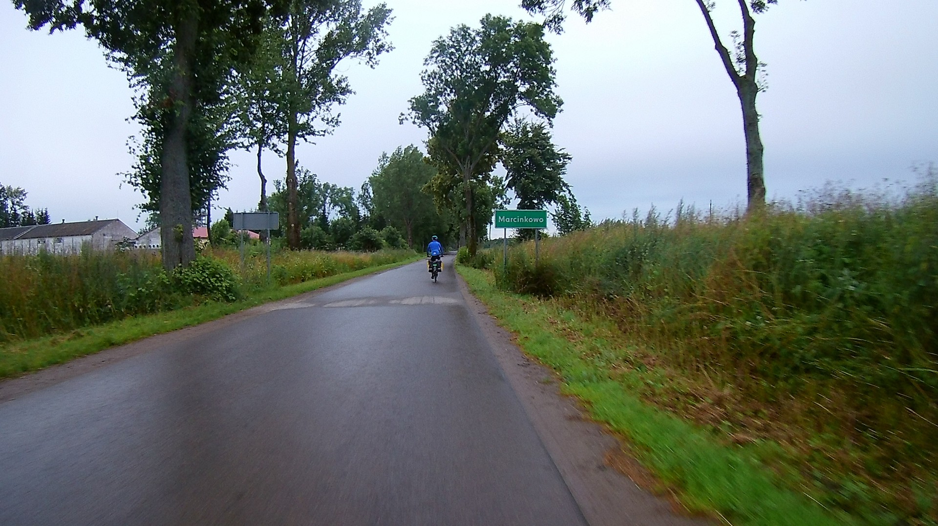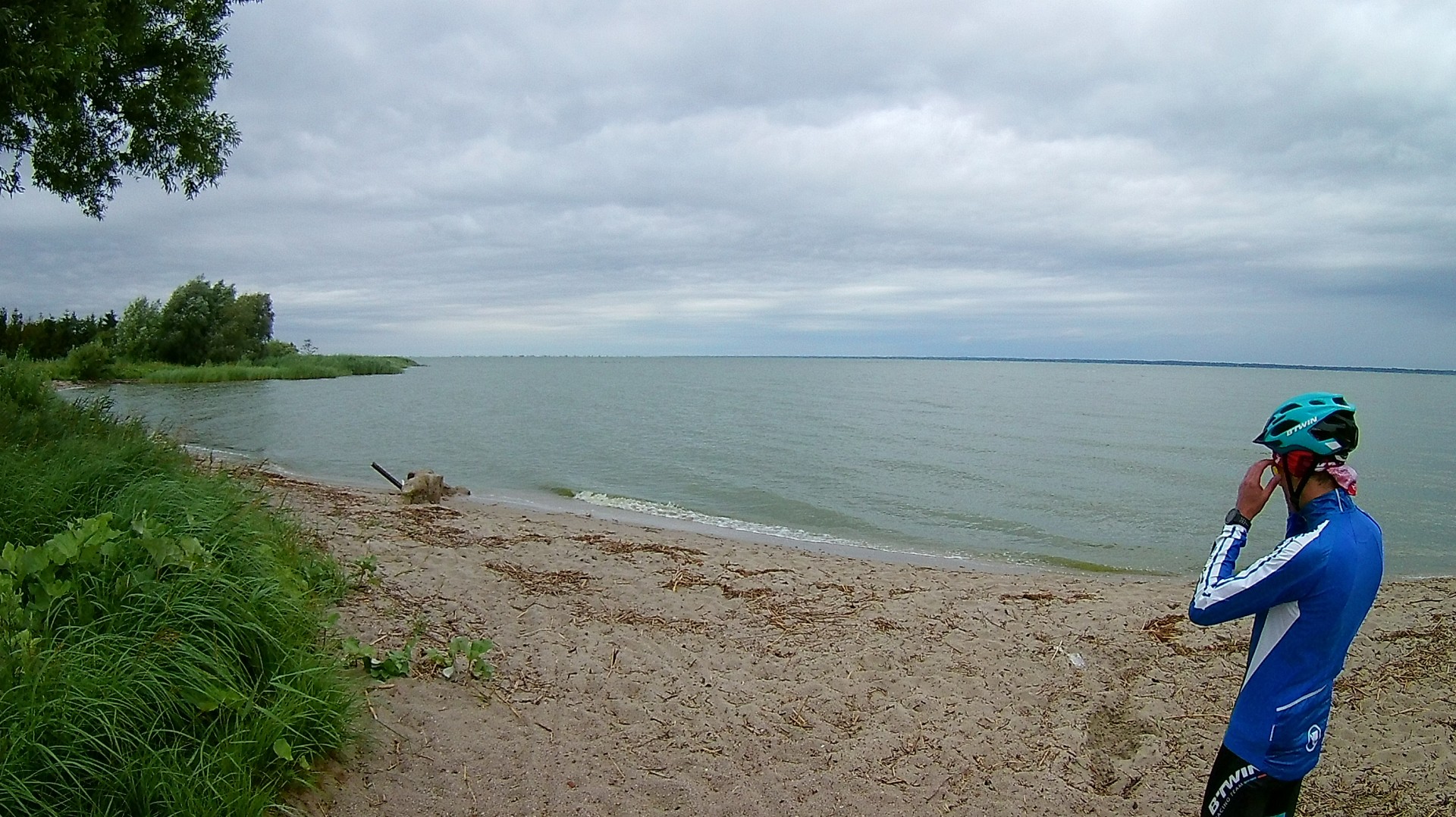 Dalej droga ciągnęła się wzdłuż zalewu wiślanego. Co chwila siąpiło i przestawało, ale wiało i było zimno. Zaczęła się walka z czasem i goniącymi nas chmurami. Widzieliśmy z oddali jaka ulewa była nad Krynicą morską. Przed Nową Pasłęką brakowało trasy. Po prostu nagle zrobiło się skoszone pole tam gdzie GPS pokazywał trasę GV, a dalej traktorzysta zrezygnował z koszenia trasy i tyle. Game Over suckers! No to w tył zwrot i po płytach jazda dalej w poszukiwaniu GV. Bez GPS można stracić czas. Dalej przed Braniewem ktoś z projektantów GV wymyślił sobie wysypać żwir na wale i kazać rowerzystom tym jechać. Niby OK, bo płyt mieliśmy dość, ale gdy na wale wieje jakby chciało nas z niego zmuchnąć i jedziemy o wiele wolniej niż po płytach, bo ten szutrowych to nie był prima sort, to jednak woleliśmy jechać obok wału po płytach betonowych, które ciągnęły się cały czas aż do Braniewa. Ktoś tutaj niepotrzebnie zarobił… Przecież wcześniej droga szła po właśnie tych płytach razem z niewielkim ruchem kołowym i nikomu to nie przeszkadzało, a tu nagle takie coś. Oj!