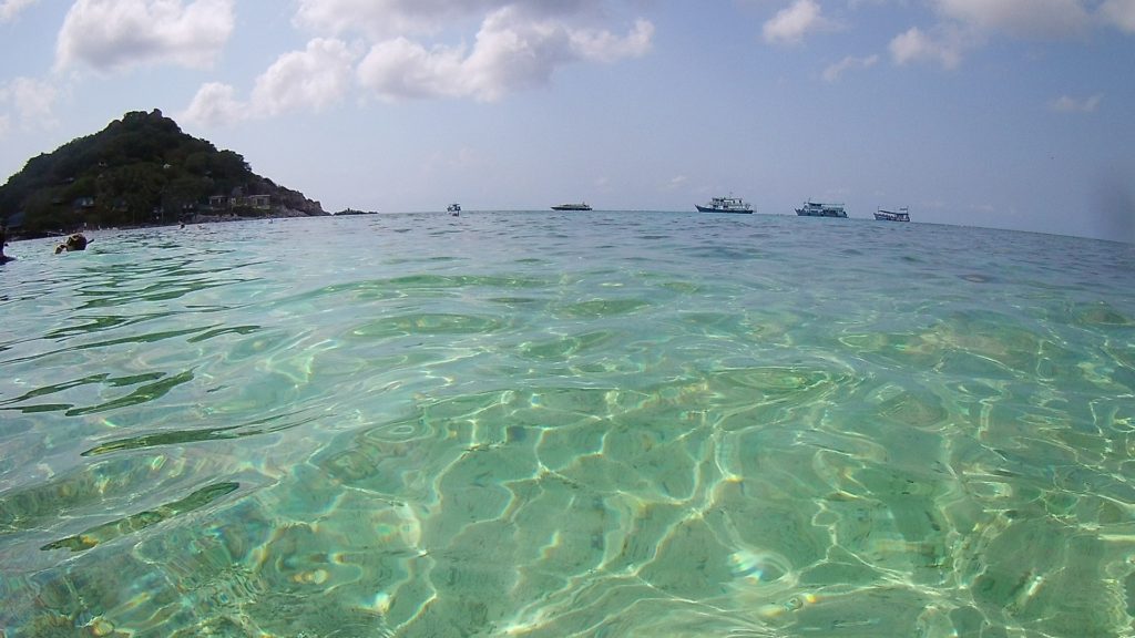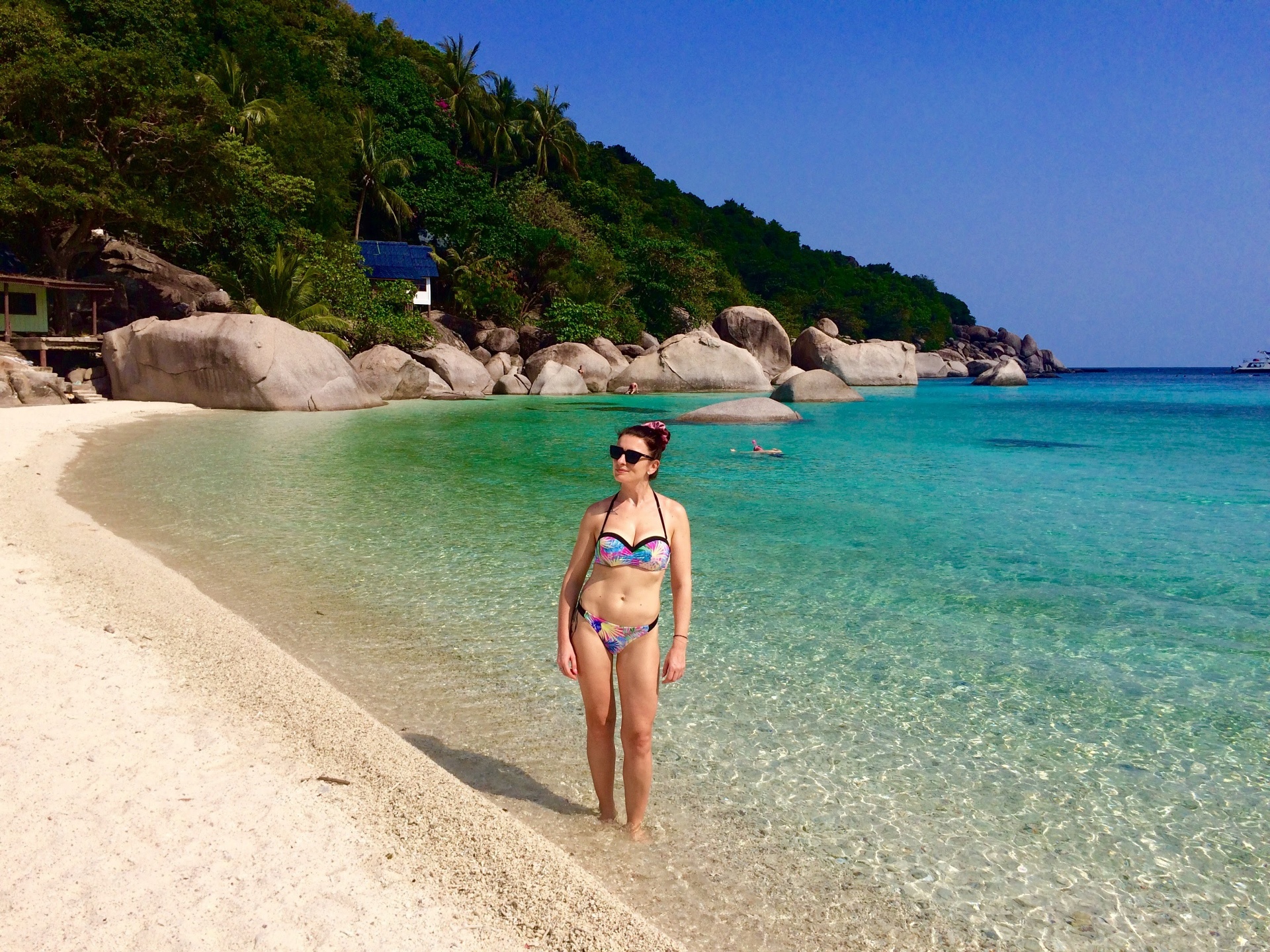 Gdy przechodziliśmy przesmykiem pomiędzy portem a mniejszą wyspą, woda była mniej więcej po pas. Gdy wracaliśmy było ciut głębiej. Wniosek – suchą stopą nie przejdziesz aż do odpływu. Znaleźliśmy sobie miejsce na piasku i choć nie było to dozwolone (nie chcieliśmy brać drogich parasoli i leżaków) poza nami podobnych cwaniaczków było sporo. Piasek prażył, dlatego szybko pozbyliśmy się ciuchów i poszliśmy do wody. Woda piękna! Przejrzysta. Dzień wcześniej wypożyczyliśmy dwa zestawy do snorkingu, czyli maski i fajki, by można było ponurkować i pooglądać rafę koralową. Oj było co oglądać. Zarówno po wschodniej jak i po zachodniej stronie. Mnóstwo niezbyt płochliwych kolorowych rybek. Mniejszych i całkiem sporych. Do tego wszystkiego żyjąca rafa koralowa. Podwodna eksplozja kolorów, kształtów i życia. Coś przepięknego. A ponieważ Koh Tao, to centrum szkoleniowe nurków, to i tutaj przy rafie nurkując mogłem podpatrywać, jak całe szkółki uczyły się podstaw nurkowania i poruszania pod wodą z akwalungami. Nie wzięliśmy w takim szkoleniu udziału. Może kiedyś?