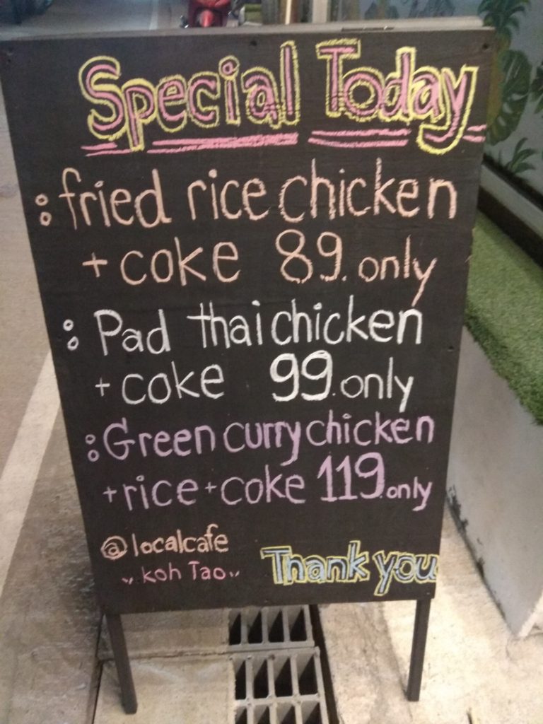 Na plaży oczywiście ceny są naprawdę wysokie – za jakiekolwiek drinki, czy jedzenie. Wystarczy jednak ruszyć się dosłownie kilka kroków z plaży w alejce między hotelami i poszukać jakiegokolwiek sklepiku, czy baru i można już w normalnej cenie cieszyć się butelką wody, przekąskami, czy drinkiem. Jedzenie na Koh Tao nie zapadło nam jakoś wybitnie w pamięci. Żałujemy jedynie tego, że nie dane nam było spróbować jedzenia w restauracyjce 995 Roasted Duck. Po prostu w dzień, kiedy zaplanowaliśmy tam spróbować jedzenia, okazało się, że cała ekipa tego miejsca wyruszyła świętować Chiński Nowy Rok.