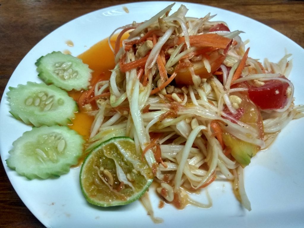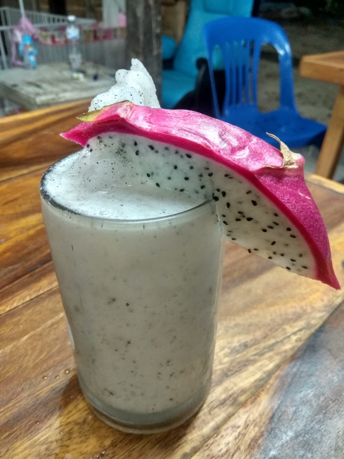 Kolejnym razem zjedliśmy w Pork Leg Sairee Kohtao. Było smacznie. Lepiej niż w poprzednim miejscu, ale obsługa nie dawała sobie rady. Do zamówienia tutaj przekonała mnie Pani, która pracowała na kuchni. Obserwując ją w pracy, gdy przechodziliśmy obok ulicą, nabrałem przekonania, że ta Pani naprawdę wie co robi. A jeśli wie, co robi, to jedzenie MUSI być smaczne. I było! Zupa Tom Kha Gai – kokosowa z kurczakiem była aromatyczna, ale kompletnie nieostra! I bardzo mała porcja. Sałatka Patrycji z papają za to była doskonała! Shake z dragon fruit (smoczy owoc) był również smaczny. No i tutaj resztę dobrego wrażenia zepsuła obsługa, na którą trzeba było długo czekać, zanim weźmie zamówienie, przyniesie zamówienie i wreszcie podejdzie po zapłatę. Z tego powodu już tu nie wróciliśmy.