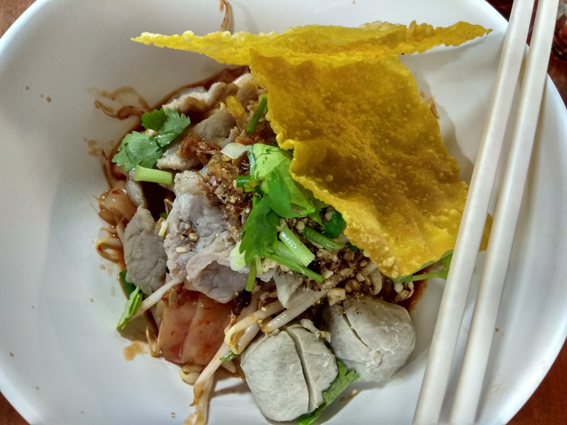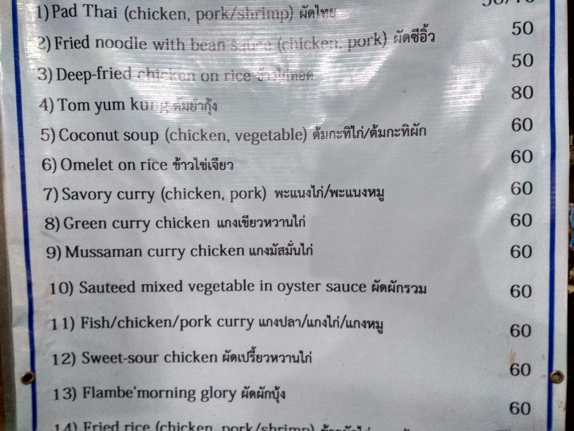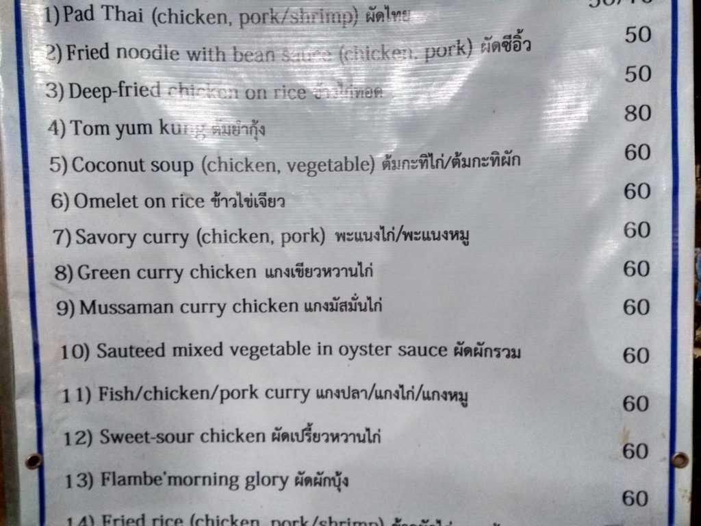 Byliśmy tutaj dwukrotnie, ale nie polecimy Wam tego miejsca, bo jakkolwiek obsługują fajne niezbyt znające język angielski dziewczyny, to za każdym razem coś się nie zgadzało. Pad Thai z kolei zaś był najbardziej mokrą wersją skąpaną w jakimś sosie pomidorowym przez co kompletnie posklejany – ciężko się to jadło. Jedyny Pad Thai w Tajlandii w takiej formie podany, więc zakładam, że to wyjątek – nieudana pozycja po prostu. Mussaman z kolei powinien być czerwony (zresztą na zdjęciach w menu też jest czerwony), podczas gdy my dostaliśmy coś w kolorze zielonym. A ponieważ mussaman jedliśmy pierwszy raz, to nie byliśmy pewni tak naprawdę, co to dostaliśmy… W każdym razie jest tutaj tanio – Mussaman kosztował 60 Bahtów a pad thai z kurczakiem był za 50 Bahtów.