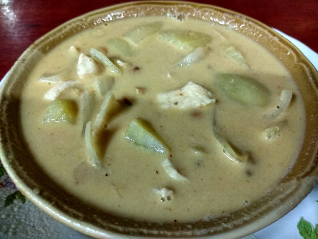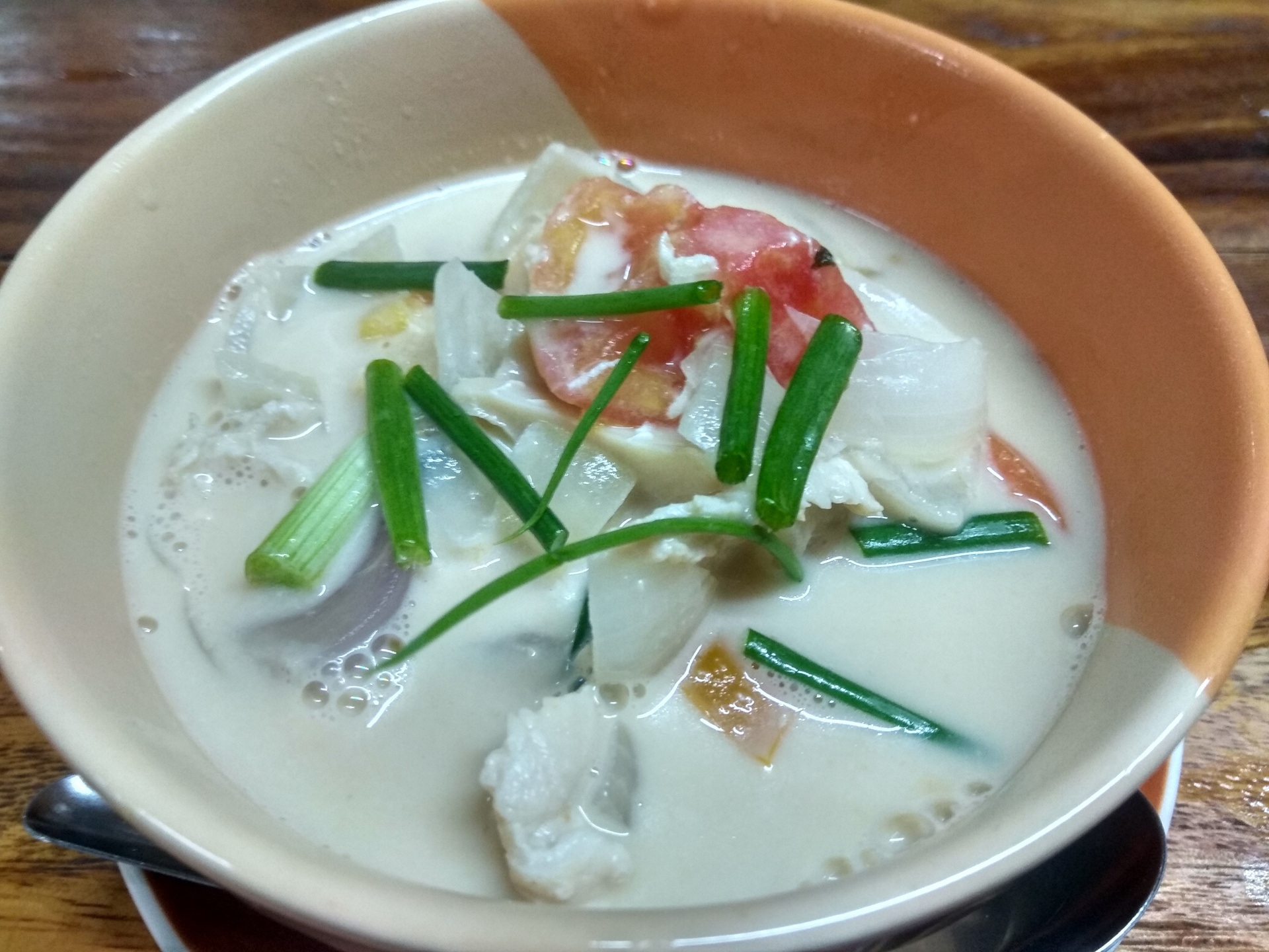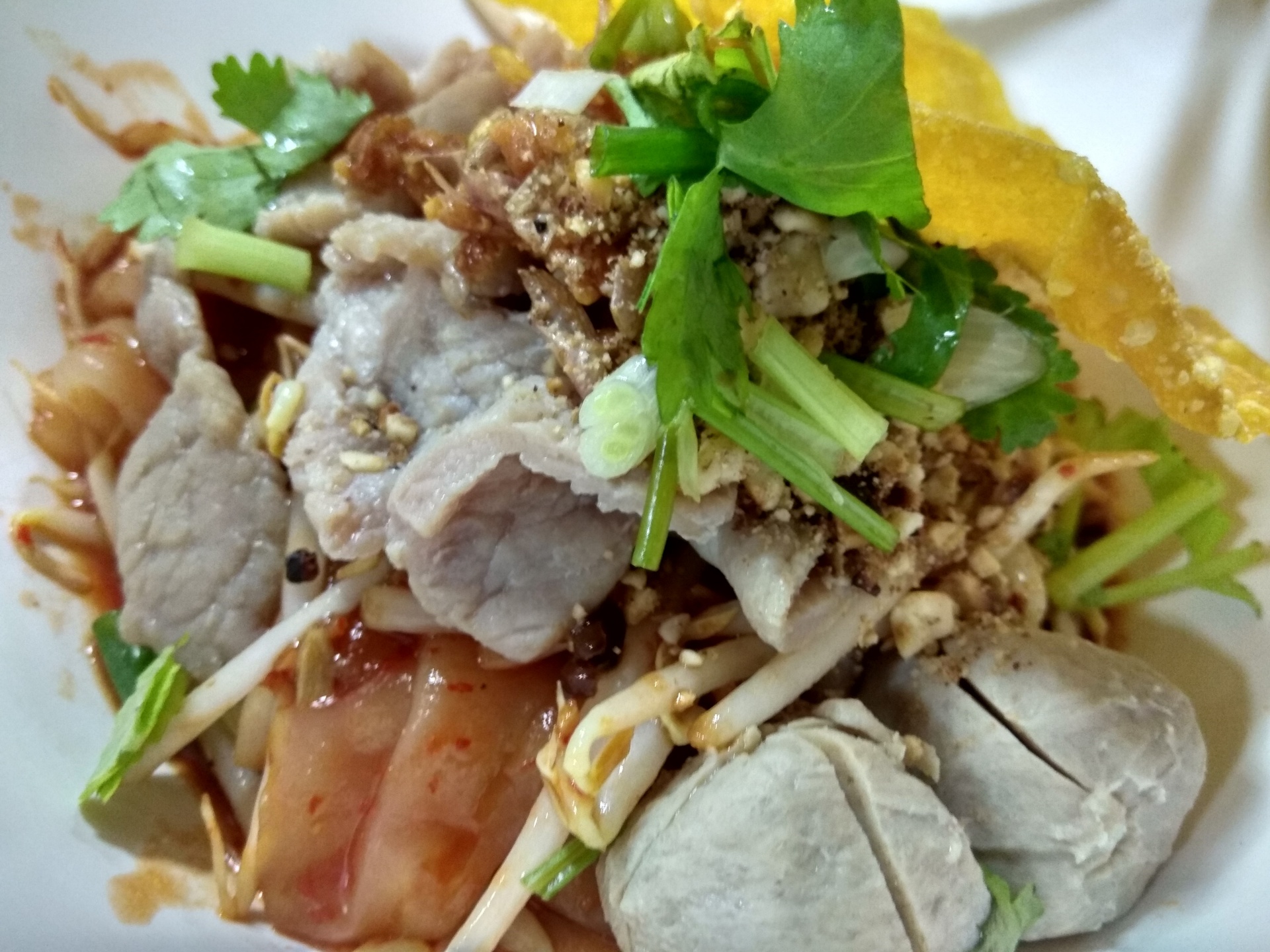 Byliśmy tutaj dwukrotnie, ale nie polecimy Wam tego miejsca, bo jakkolwiek obsługują fajne niezbyt znające język angielski dziewczyny, to za każdym razem coś się nie zgadzało. Pad Thai z kolei zaś był najbardziej mokrą wersją skąpaną w jakimś sosie pomidorowym przez co kompletnie posklejany – ciężko się to jadło. Jedyny Pad Thai w Tajlandii w takiej formie podany, więc zakładam, że to wyjątek – nieudana pozycja po prostu. Mussaman z kolei powinien być czerwony (zresztą na zdjęciach w menu też jest czerwony), podczas gdy my dostaliśmy coś w kolorze zielonym. A ponieważ mussaman jedliśmy pierwszy raz, to nie byliśmy pewni tak naprawdę, co to dostaliśmy… W każdym razie jest tutaj tanio – Mussaman kosztował 60 Bahtów a pad thai z kurczakiem był za 50 Bahtów.