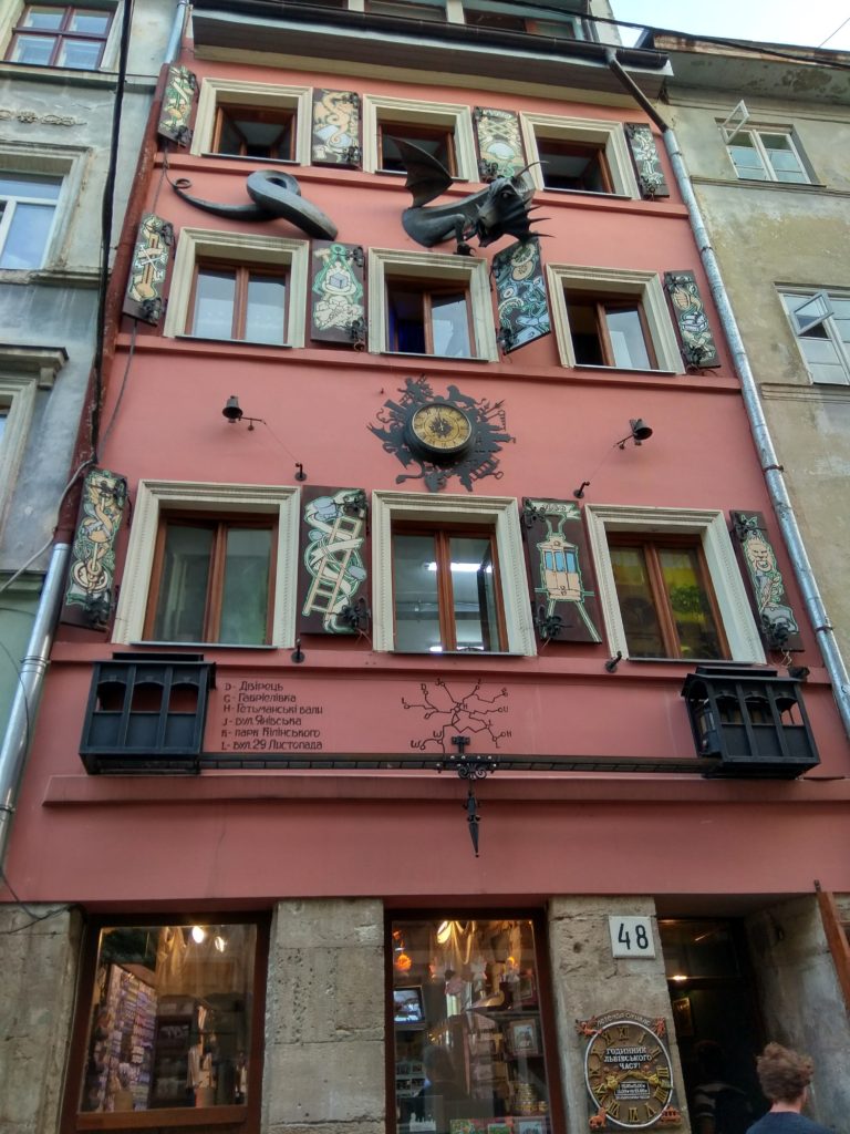 Jagodzie najbardziej się podobał Dom Dziwów z trabantem Harrego Pottera na dachu, gnomem na dachu, któremu wrzuca się pieniądze do dziurawego kapelusza, knajpką na dachu i smokiem z tramwajem na elewacji, gdzie co 3 godziny smok zionie ogniem. Ciekawe jest to, że na tablicy przy wejściu do kamienicy jest informacja, że pokazy są o 12, 15, 18 i 21, ale „czasu lwowskiego”. Z tego powodu Jagoda czekała na pokaz ponad godzinę i dokładnie o 21:24 (sic!) rozpoczął się pokaz. Najwyraźniej lwowiacy nie są zbyt punktualni? A może kryje się tutaj inna historia?