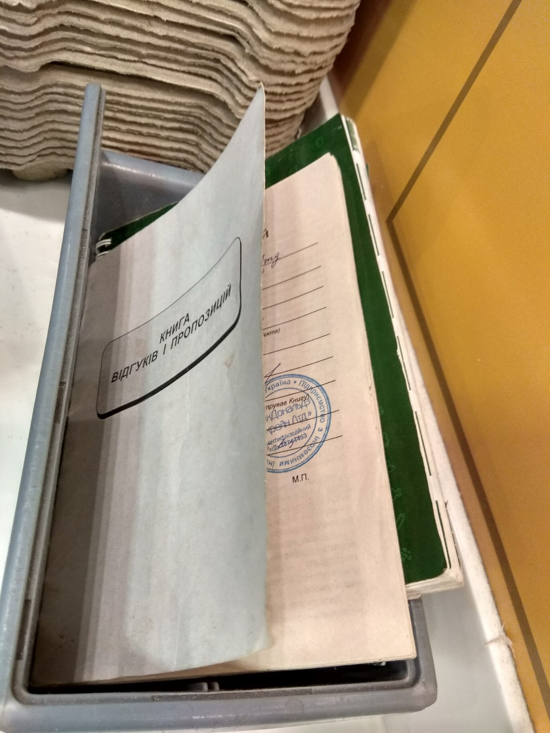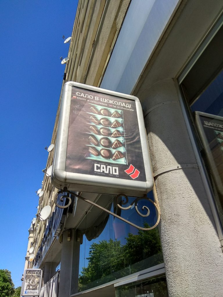 Na skraju placu Adama Mickiewicza gdzie zaczyna się prospekt swobody jest nowa restauracja Сало. Można tam zjeść nowoczesne wariacje na temat tradycyjnej kuchni ukraińskiej. Dla przykładu są tam czekoladki nadziane słoniną w formie bombonierki 😉 I jeszcze taka ciekawostka: pamiętacie „książki skarg i wniosków”? Ci co mają grubo ponad 30 wiosen – pewnie tak… Tym młodszym wyjaśniam, że w epoce „realnego socjalizmu” w każdym sklepie była taka książka, gdzie można było napisać co się myśli na temat obsługi, co się sugeruje poprawić itp. Na Ukrainie to zostało 🙂